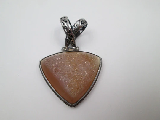 Colgante triangular piedra ámbar. Plata de ley 925. Lazo calado. Años 80