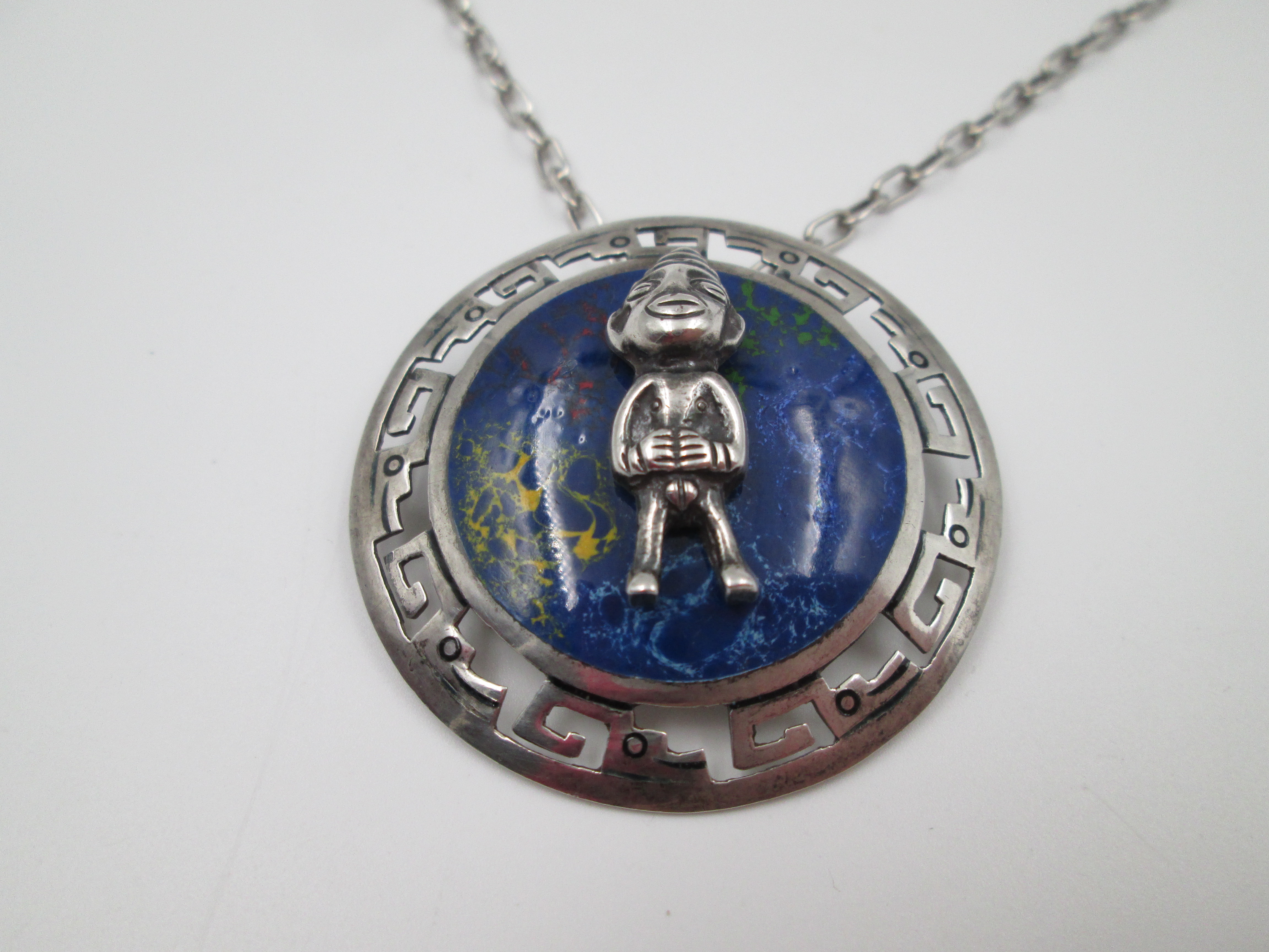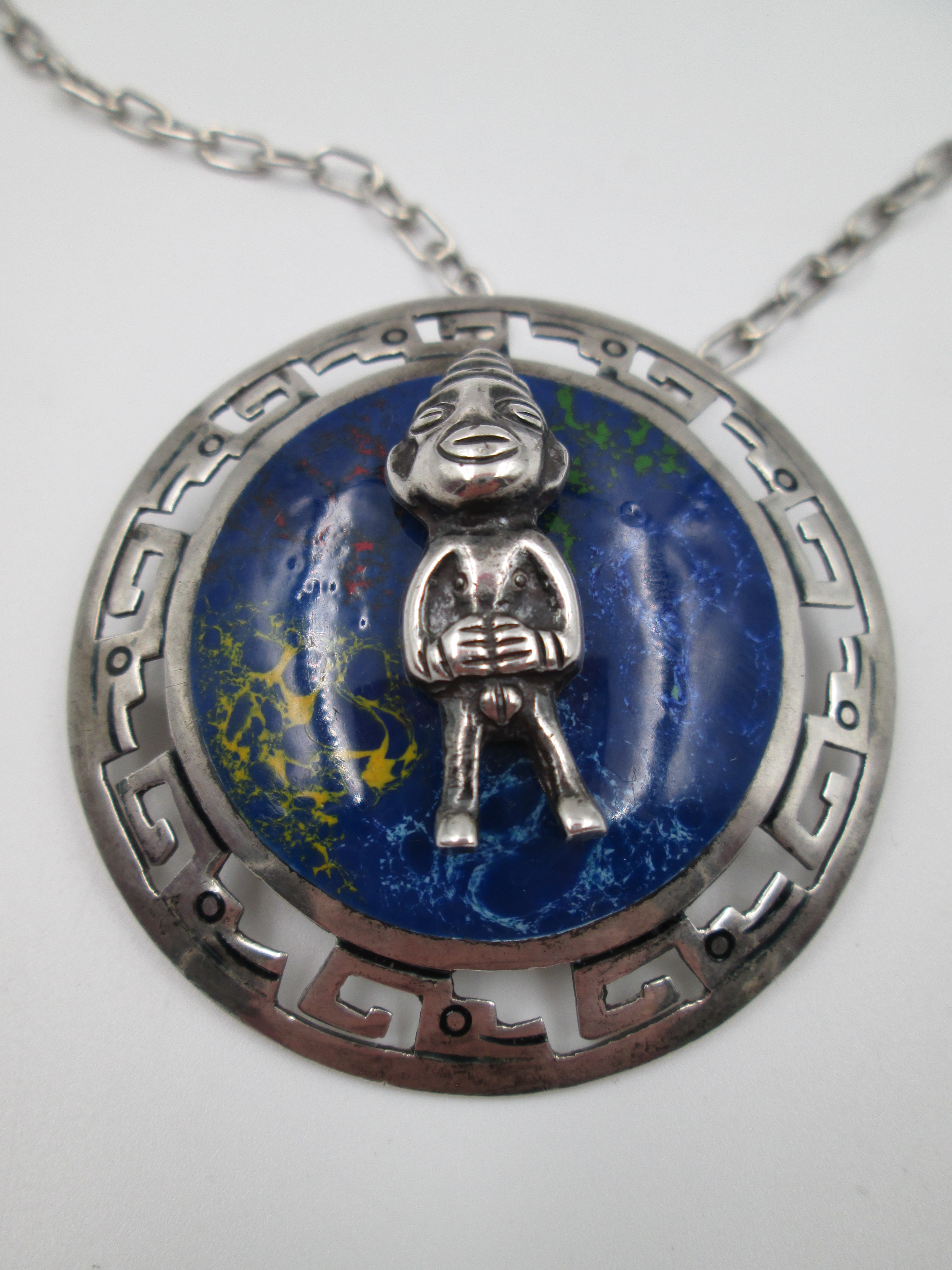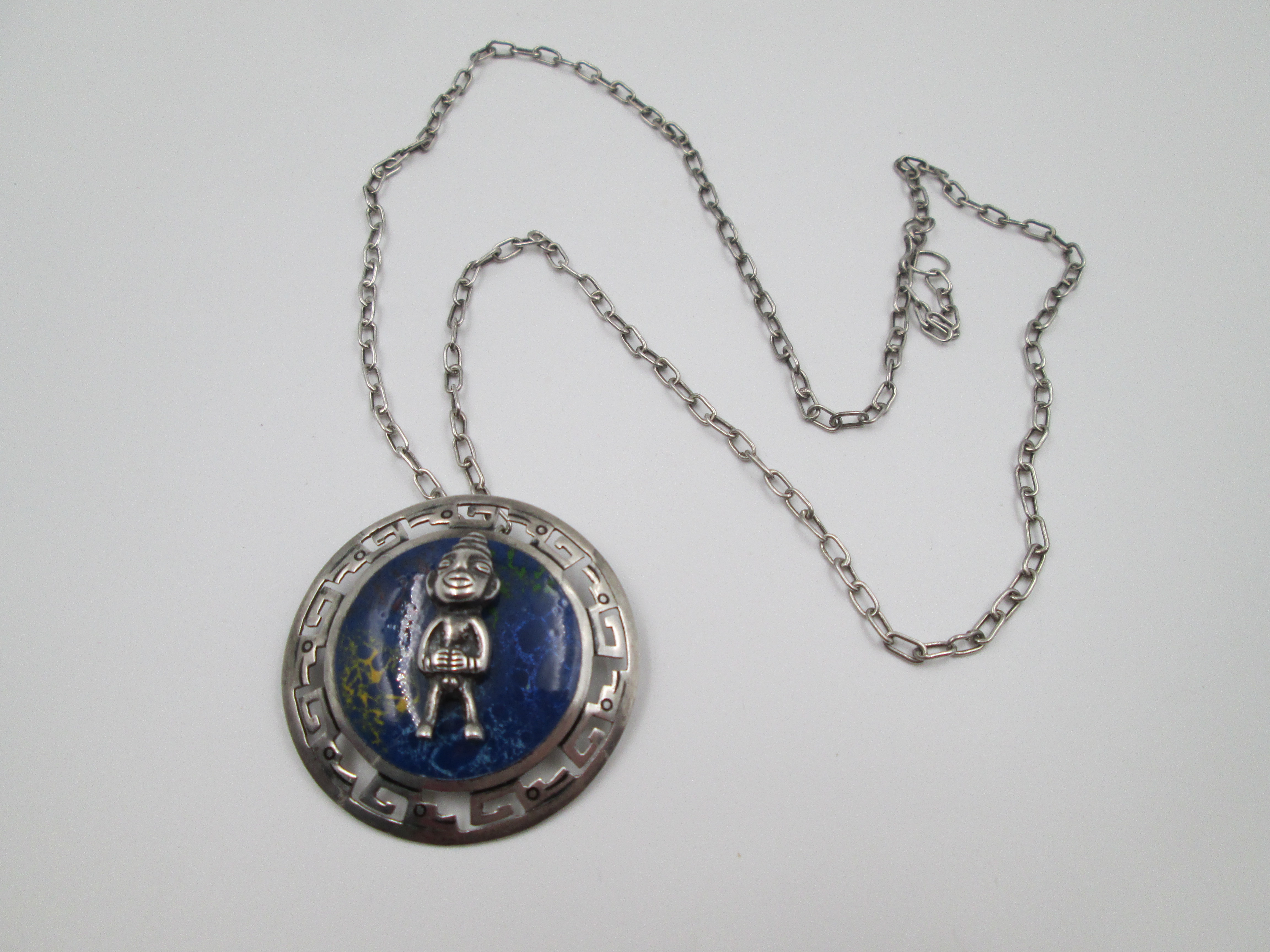 Collar mujer plata de ley y esmalte de colores. Cadena eslabones y colgante ídolo inca. 1970