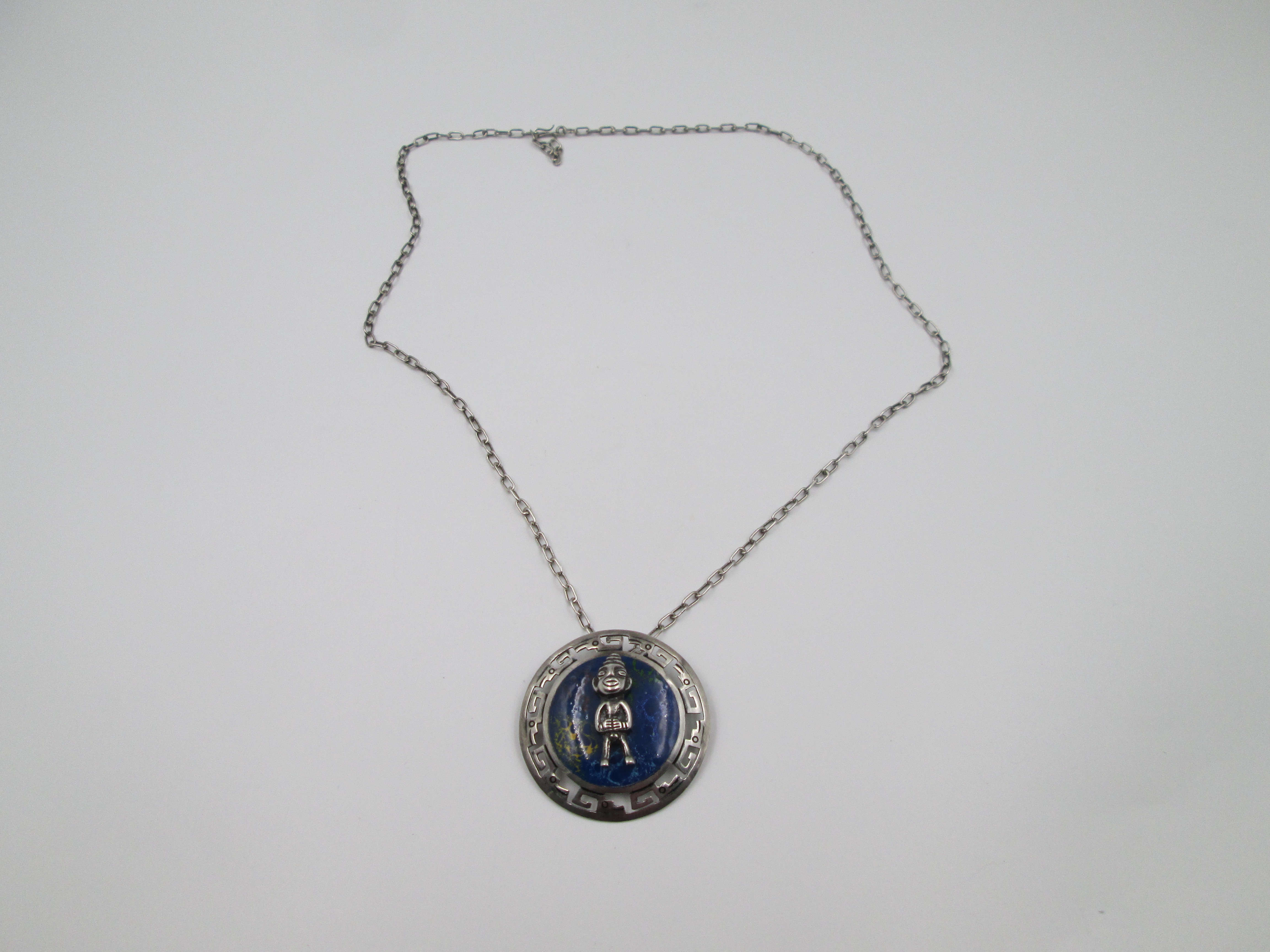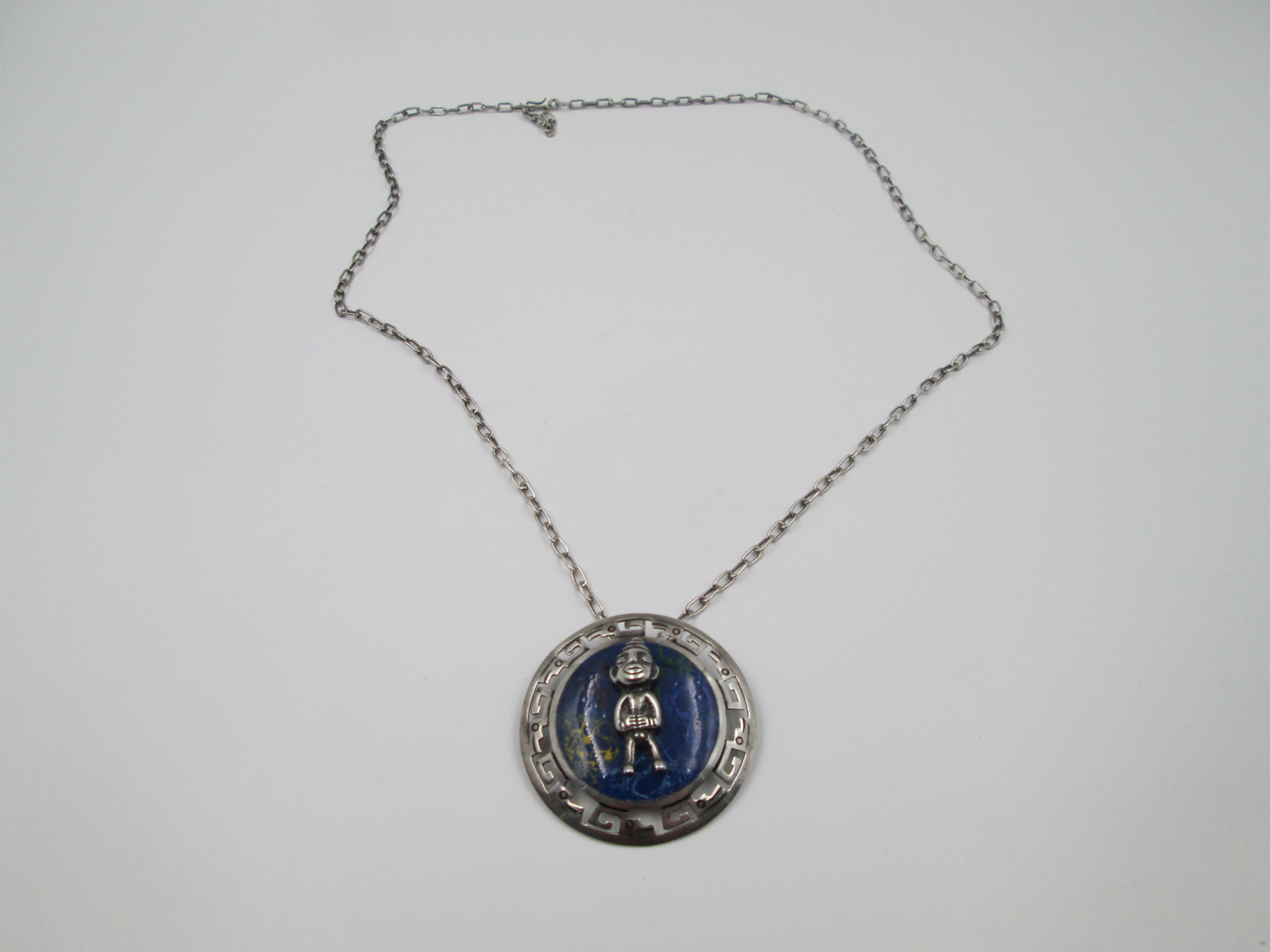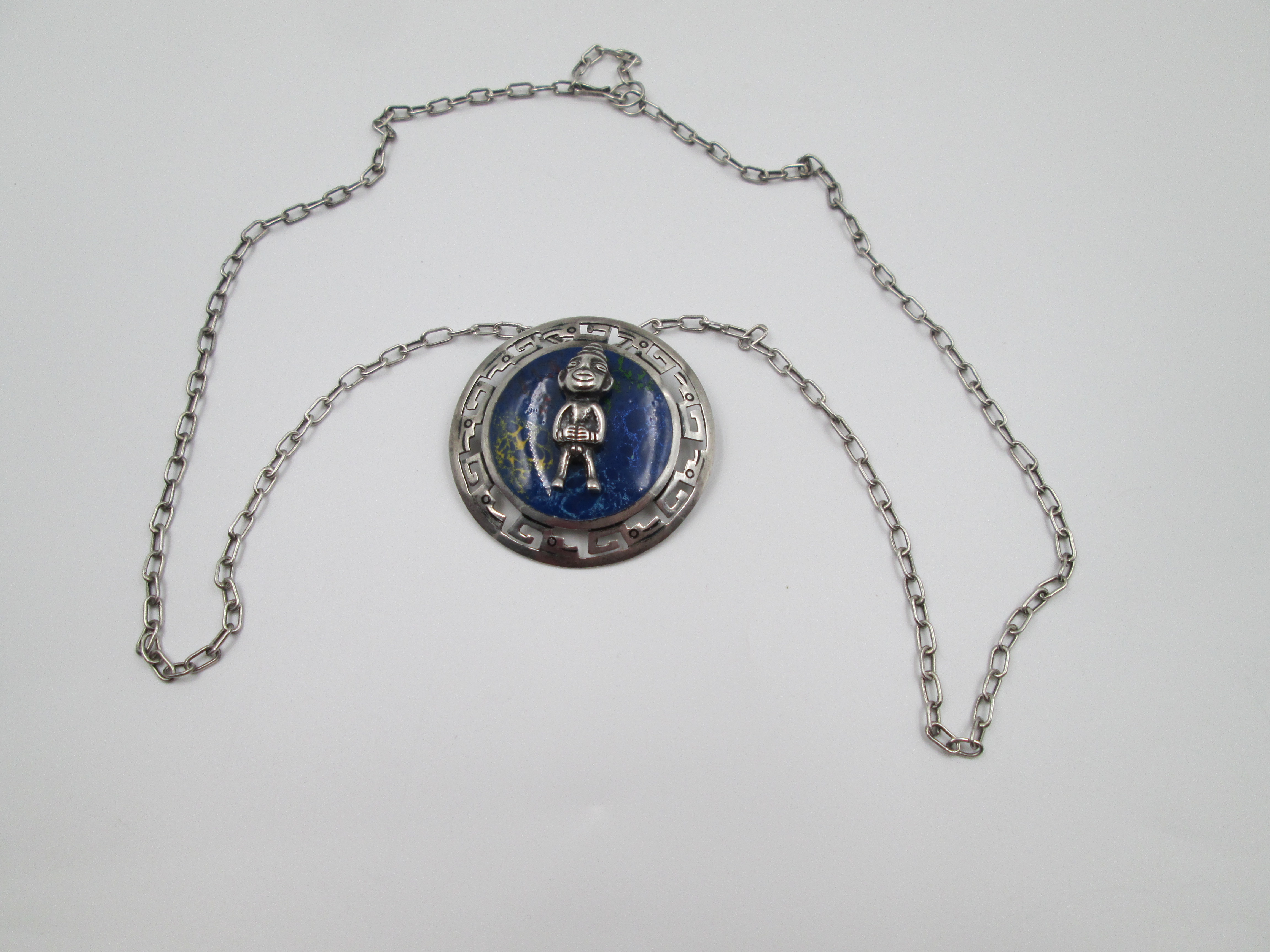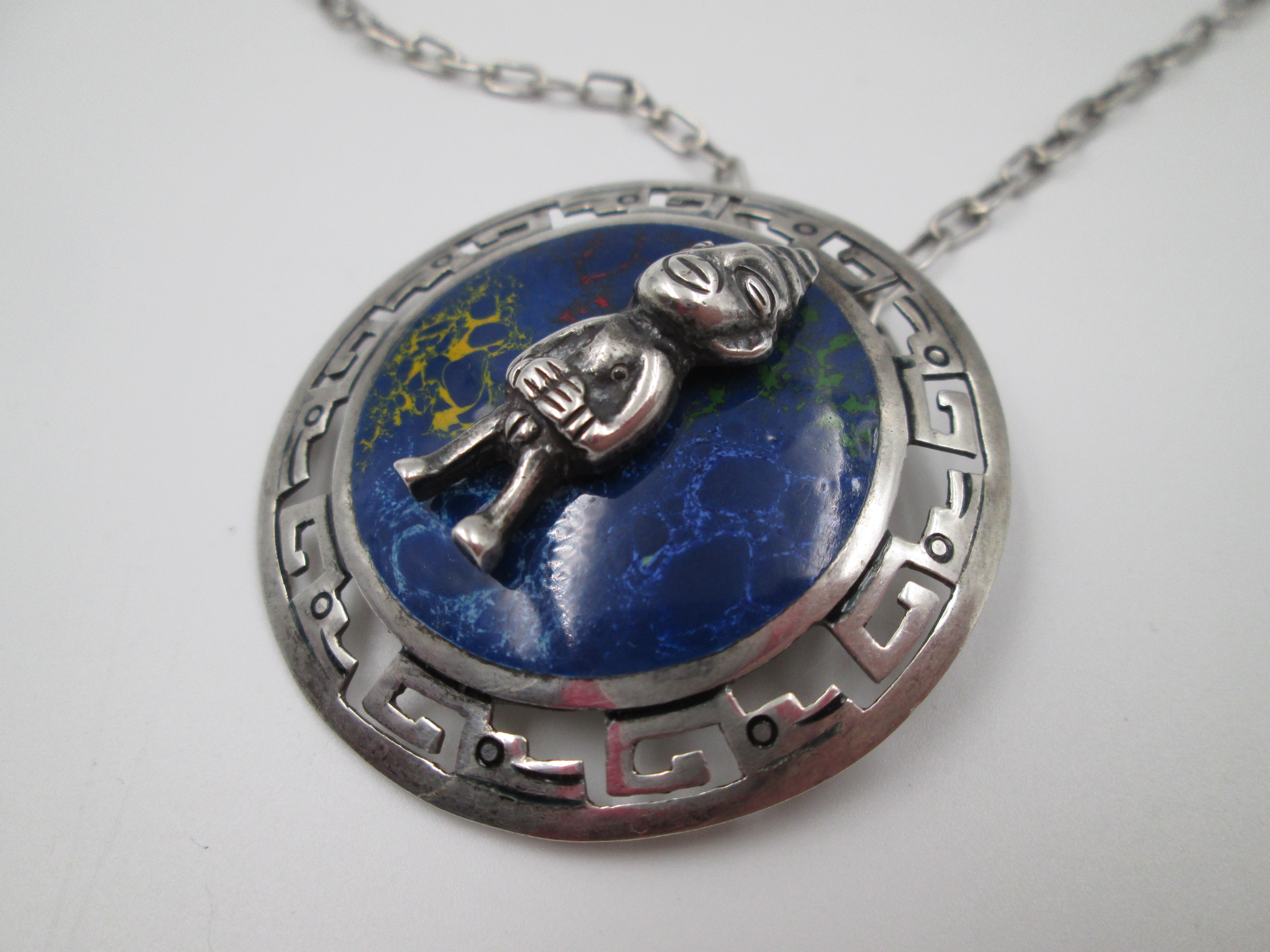 Collar mujer plata de ley y esmalte de colores. Cadena eslabones y colgante ídolo inca. 1970