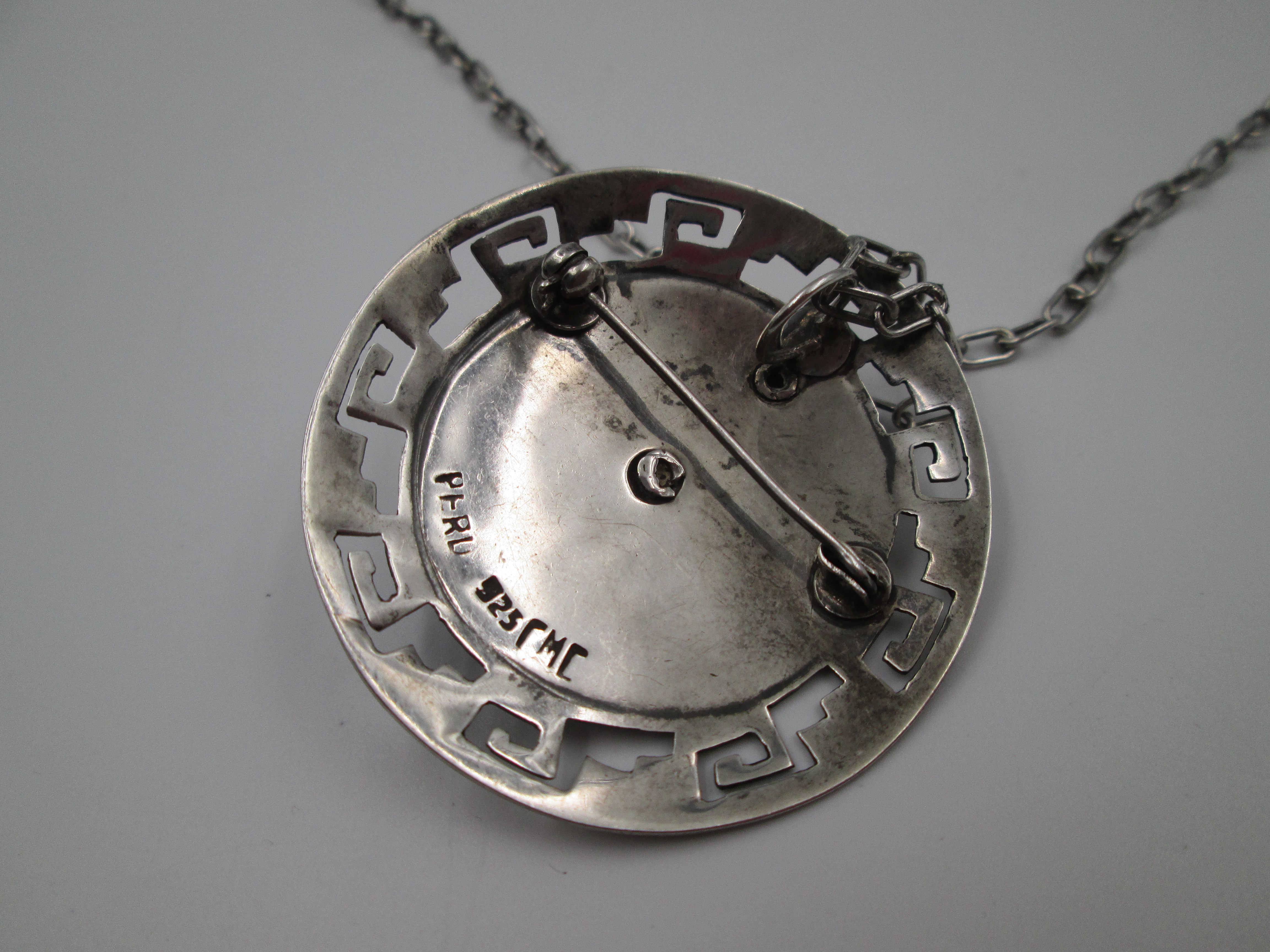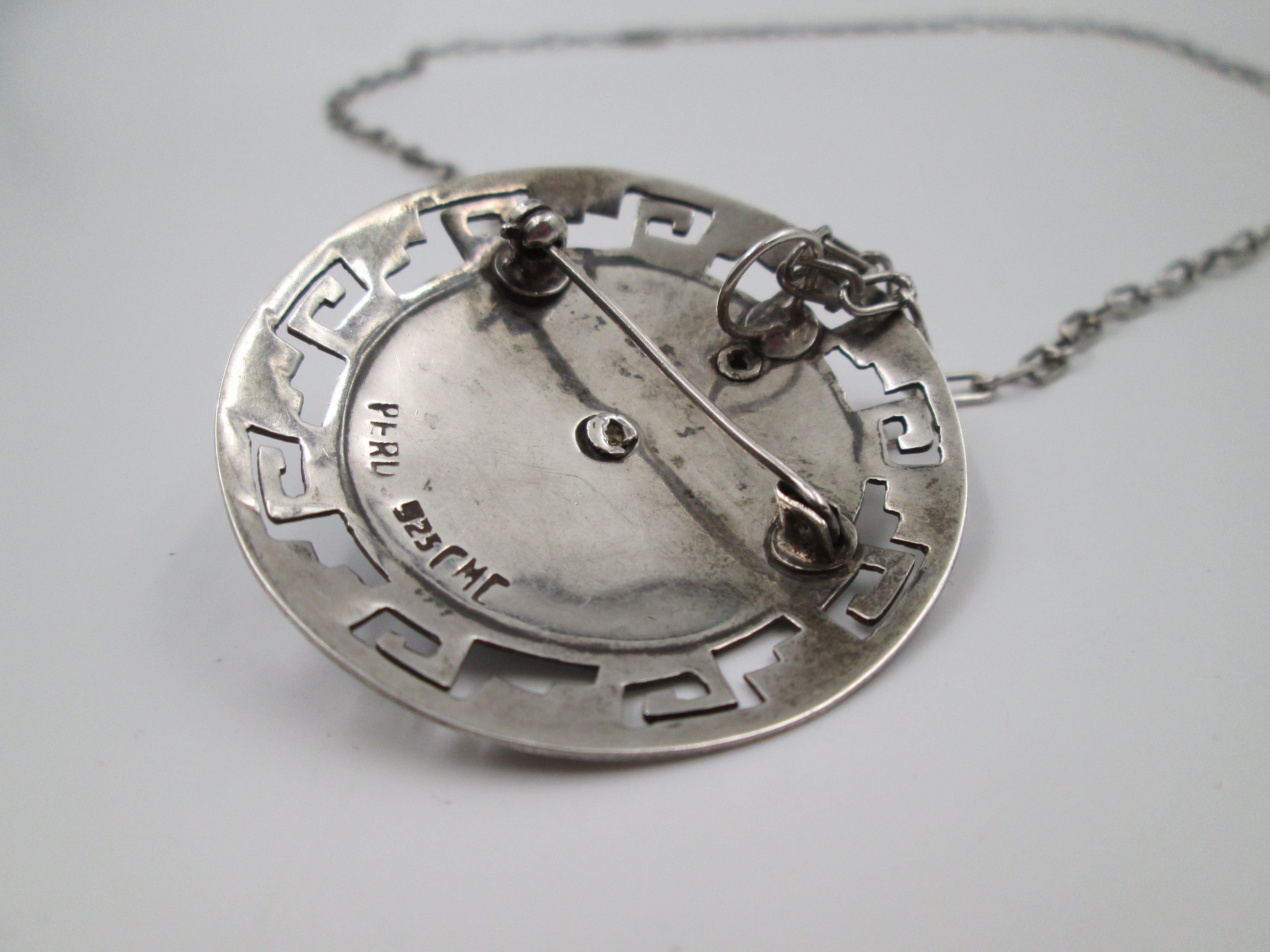 La unidad, acabada en plata de ley contrastada de 925 milésimas, se compone de una cadena de eslabones abiertos y de un colgante / broche de forma circular, calado en el borde y adornado con un ídolo inca en relieve sobre un fondo de esmalte de colores.