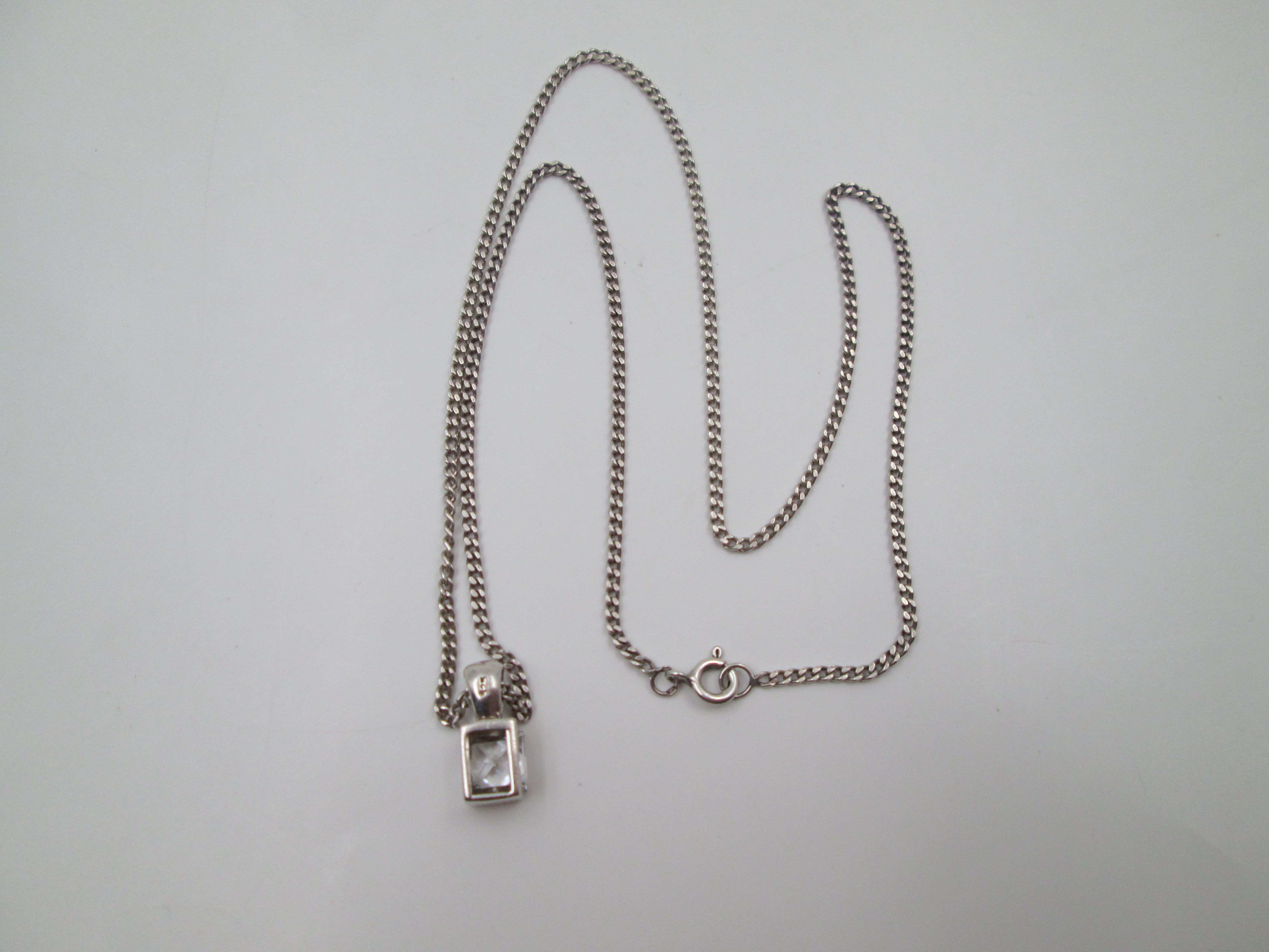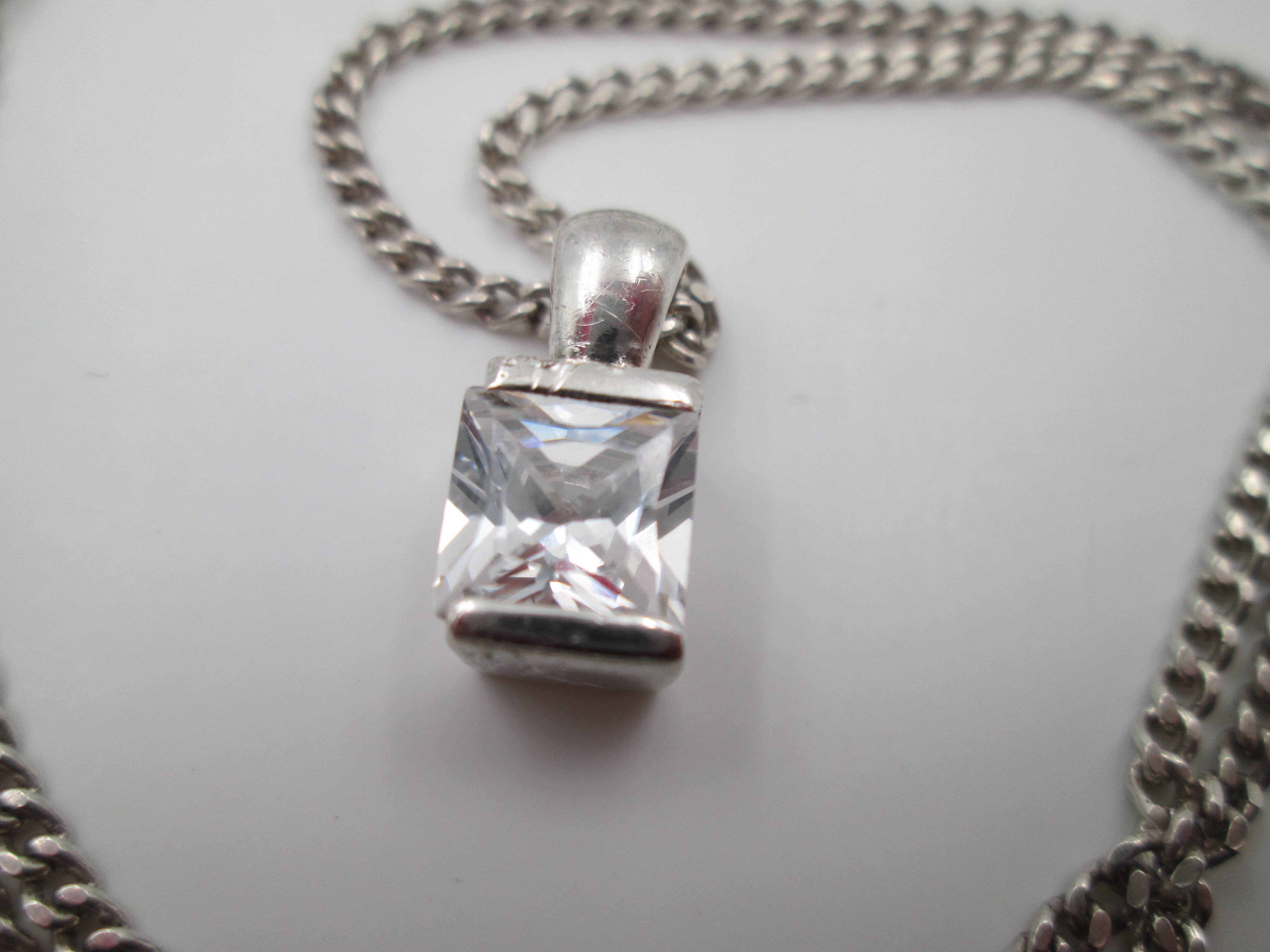 La unidad, acabada en plata de ley contrastada de 925 milésimas, se compone de una cadena barbada de eslabones planos entrelazados y de un colgante adornado con gema blanca facetada.