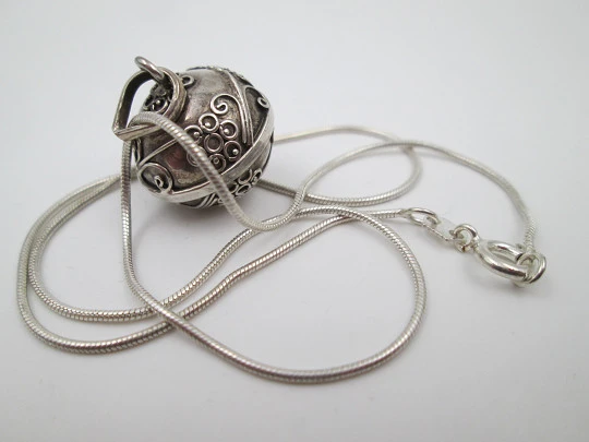 Cordón con esfera decorada llamador de ángeles. Plata de ley. España