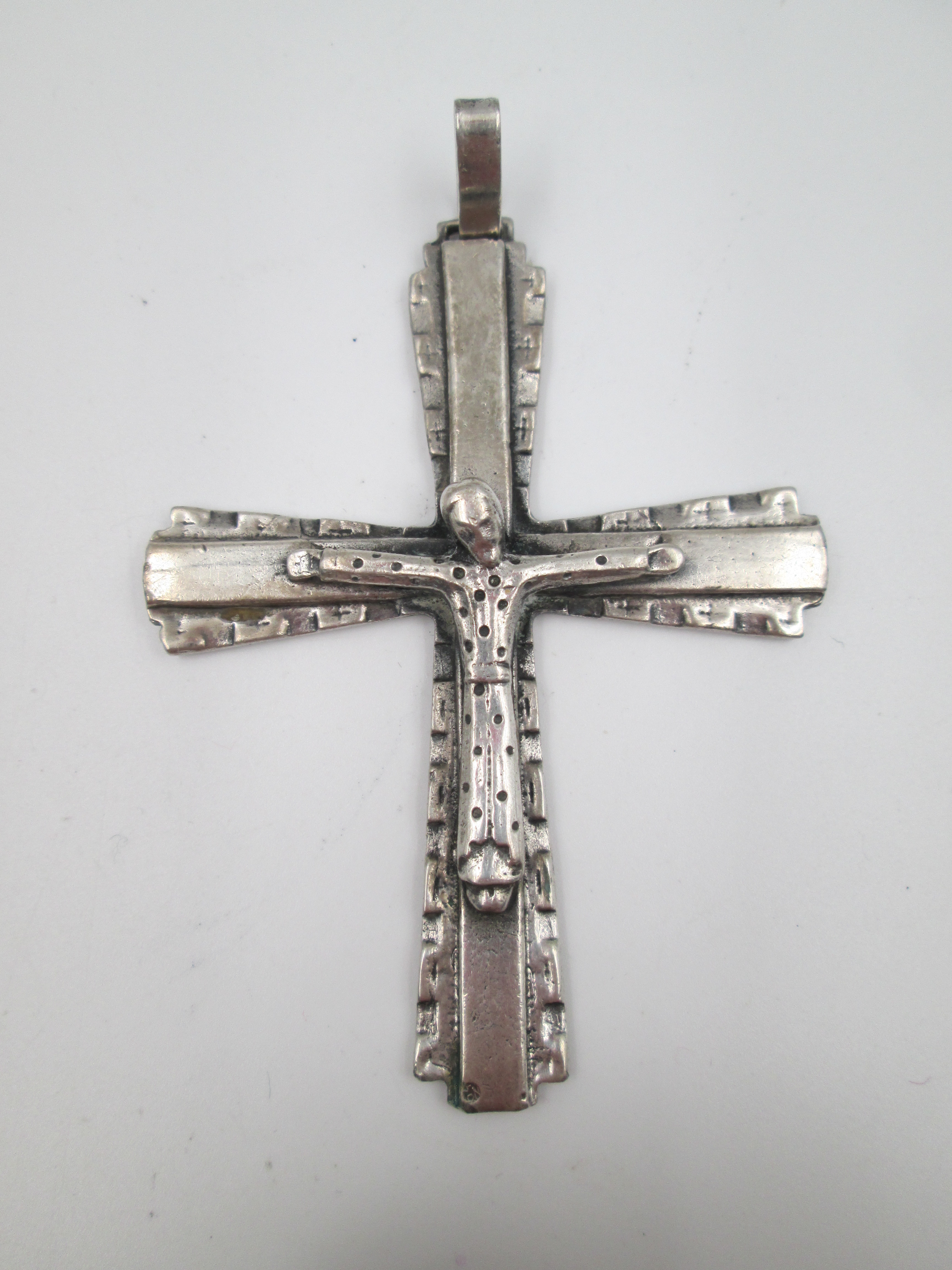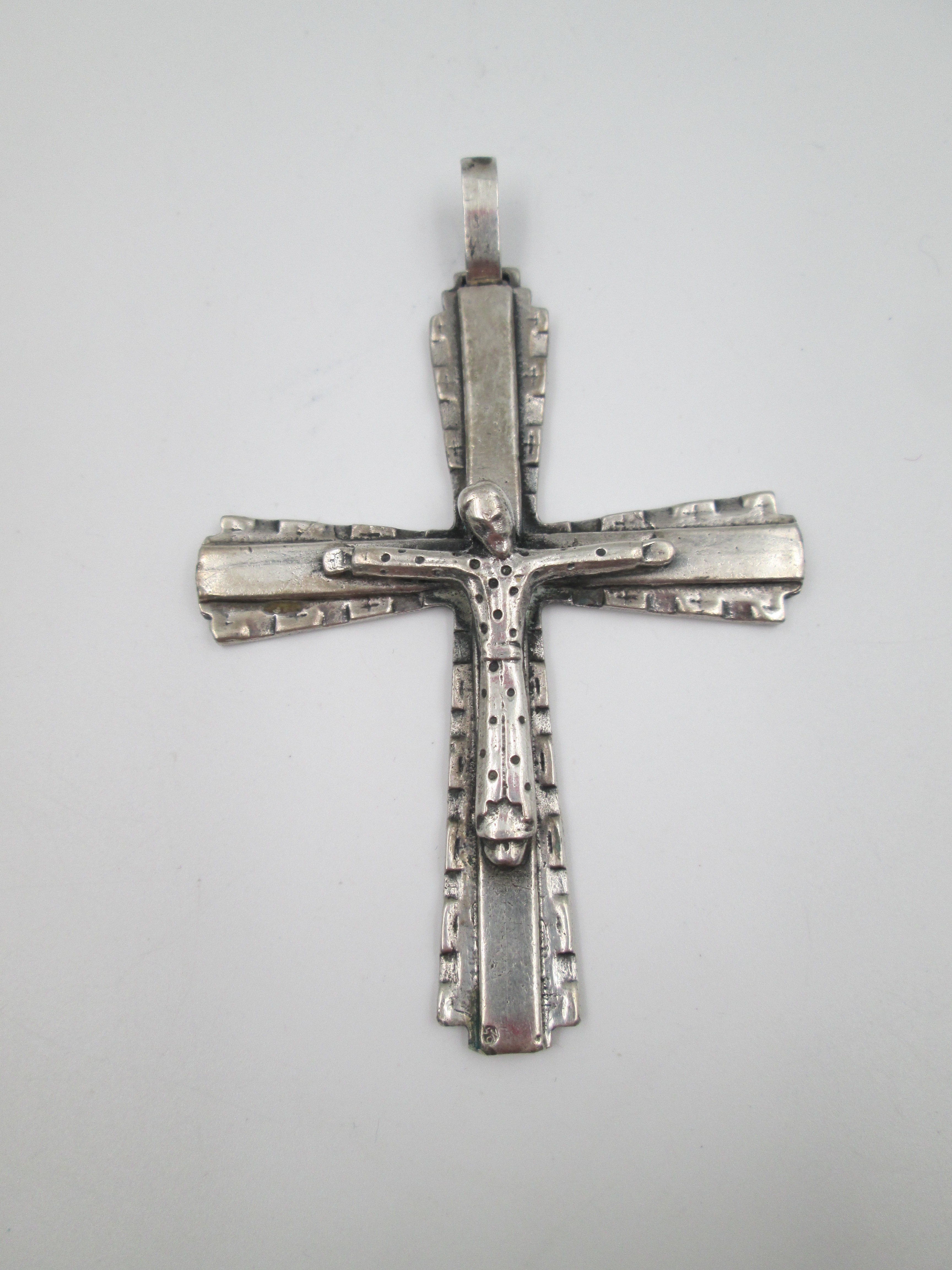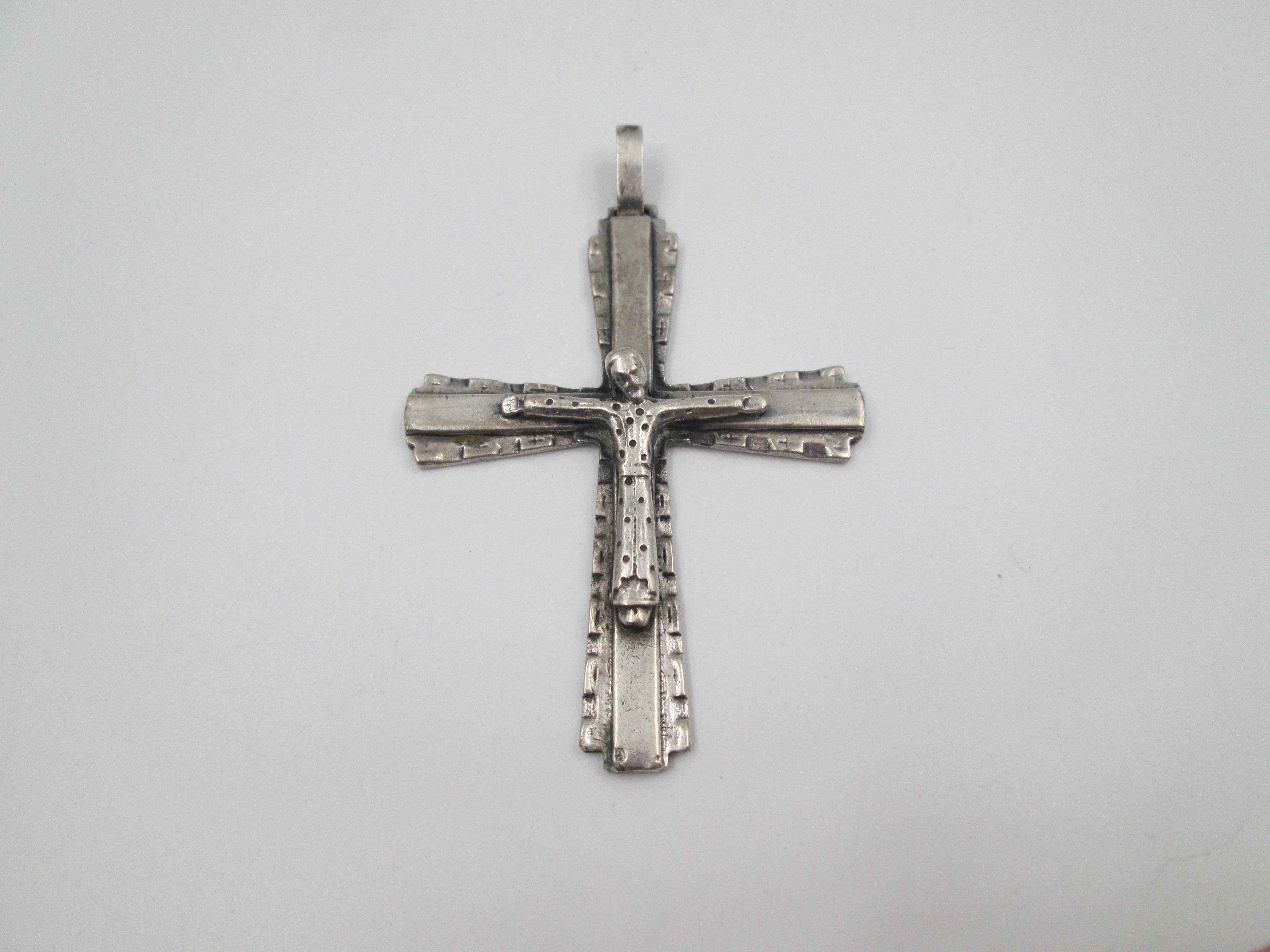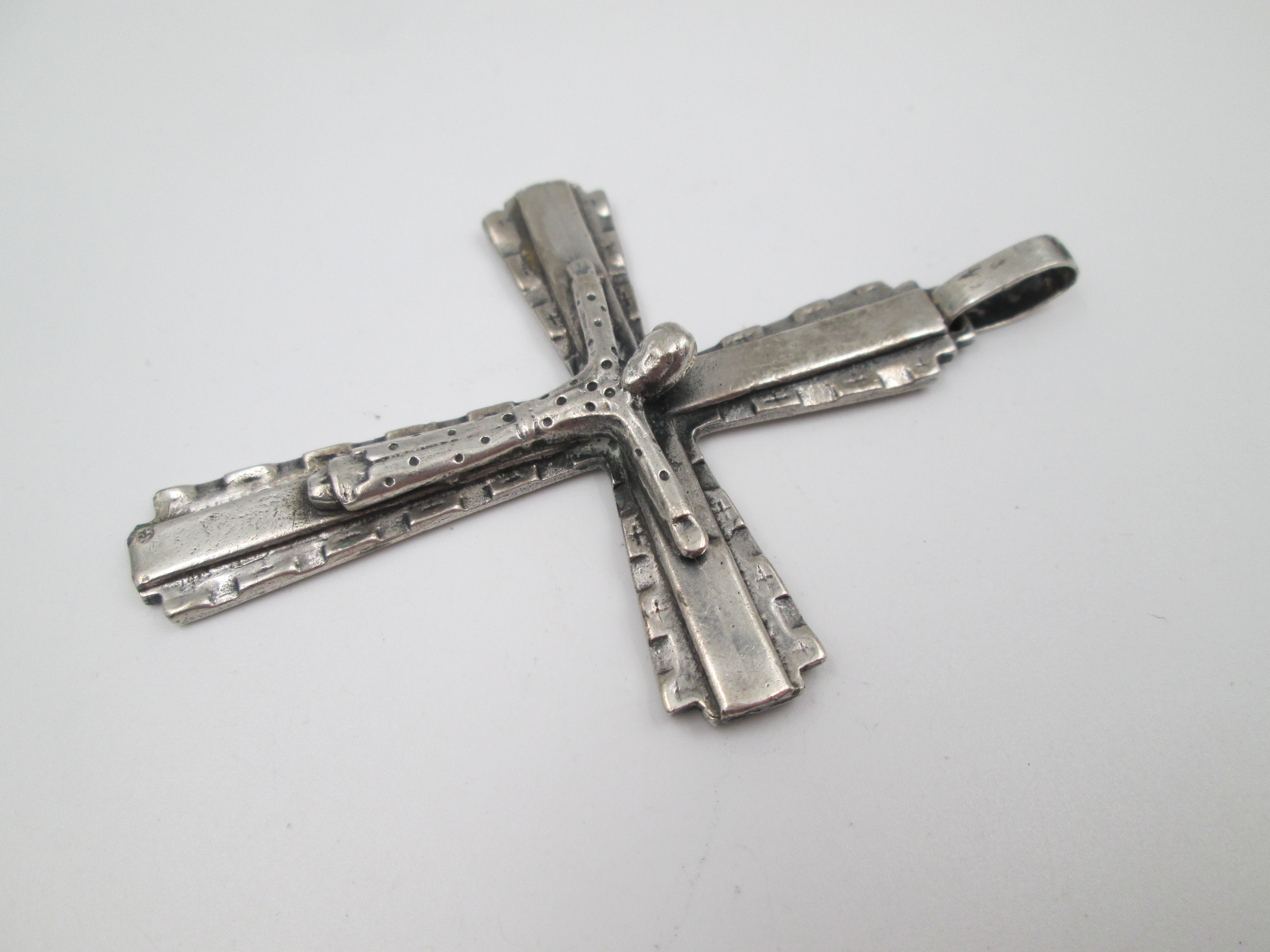 Crucifijo colgante de gran tamaño en plata de ley 925. Asa y argolla. España. 1970