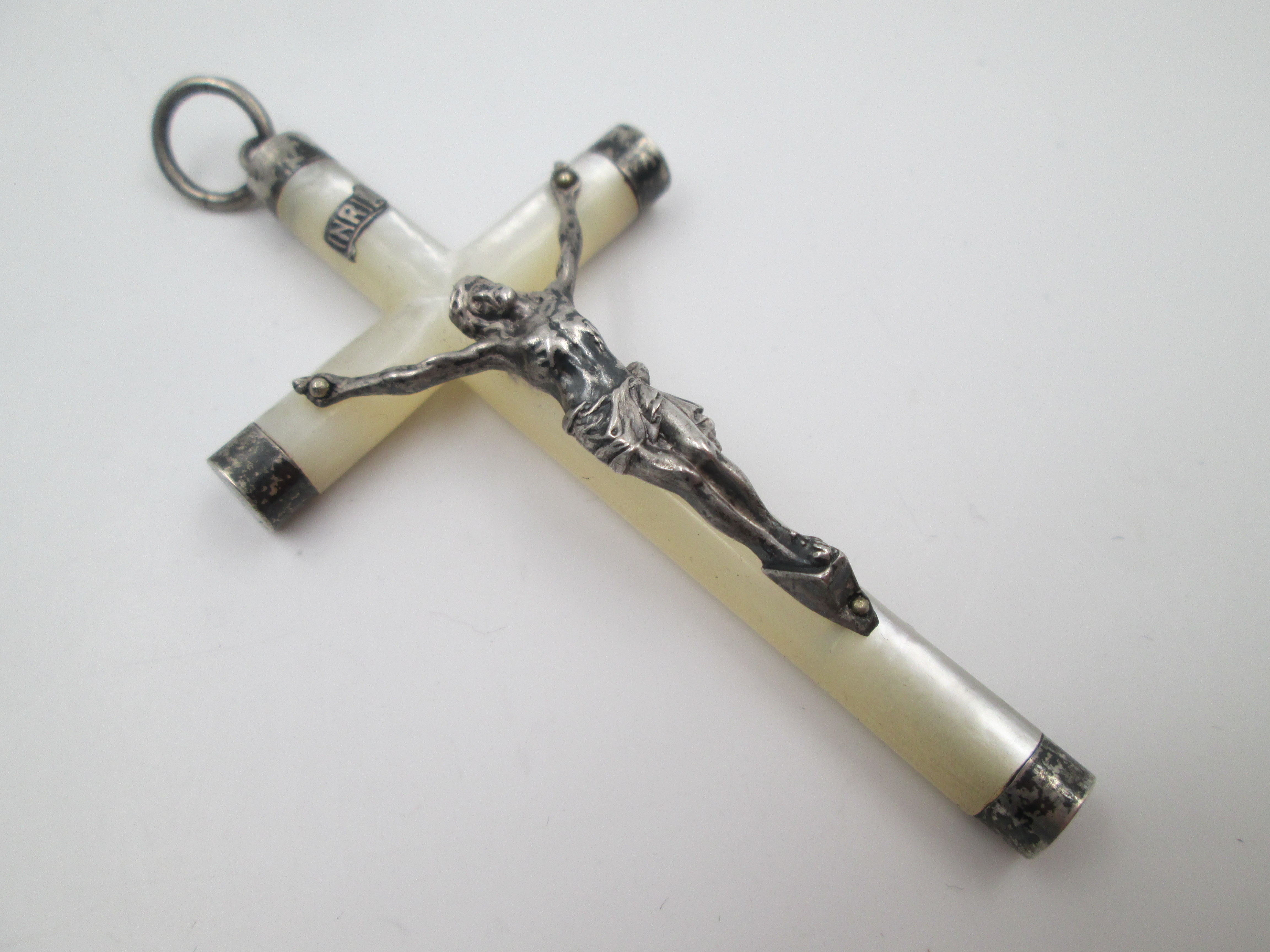 Crucifijo colgante. Nácar iridiscente y plata de ley. Cruz con cantoneras. Argolla. 1940