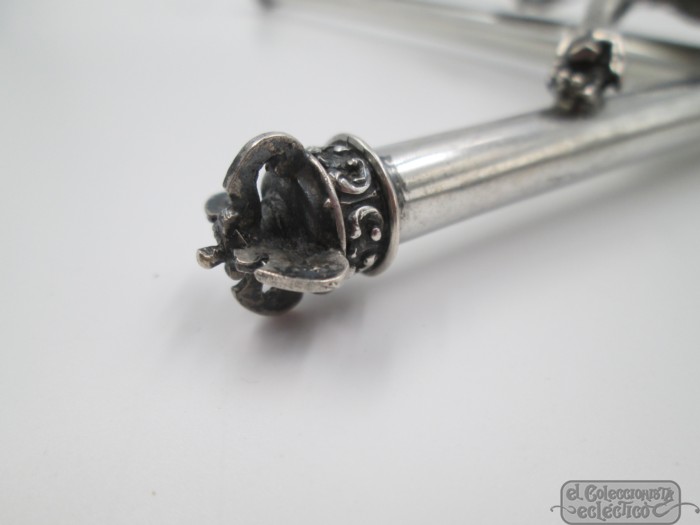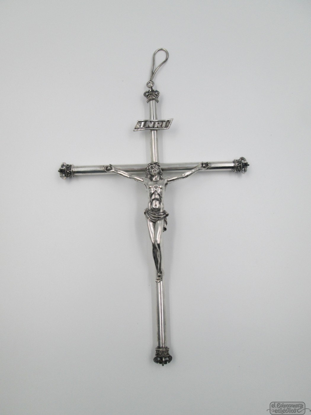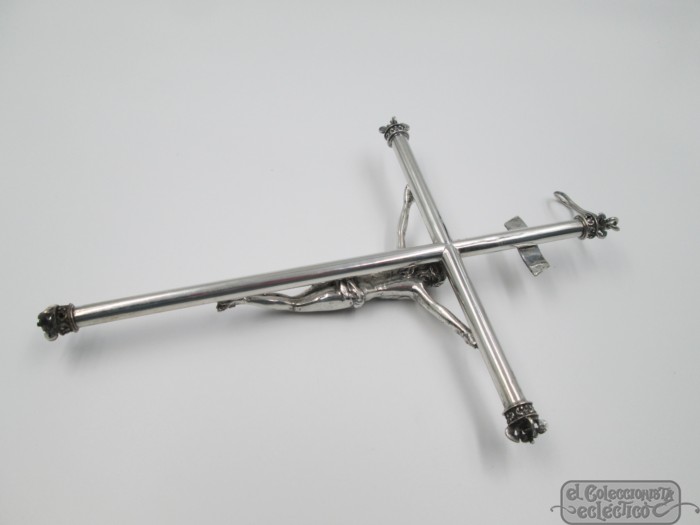 Crucifijo plata de ley 925. Brazos tubo y remates corona. España. 1950