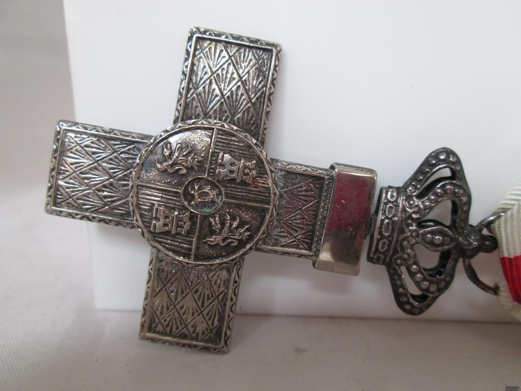 Viene realizada en metal niquelado y pende de una cinta de tela blanca con banda roja y hebilla plateada.