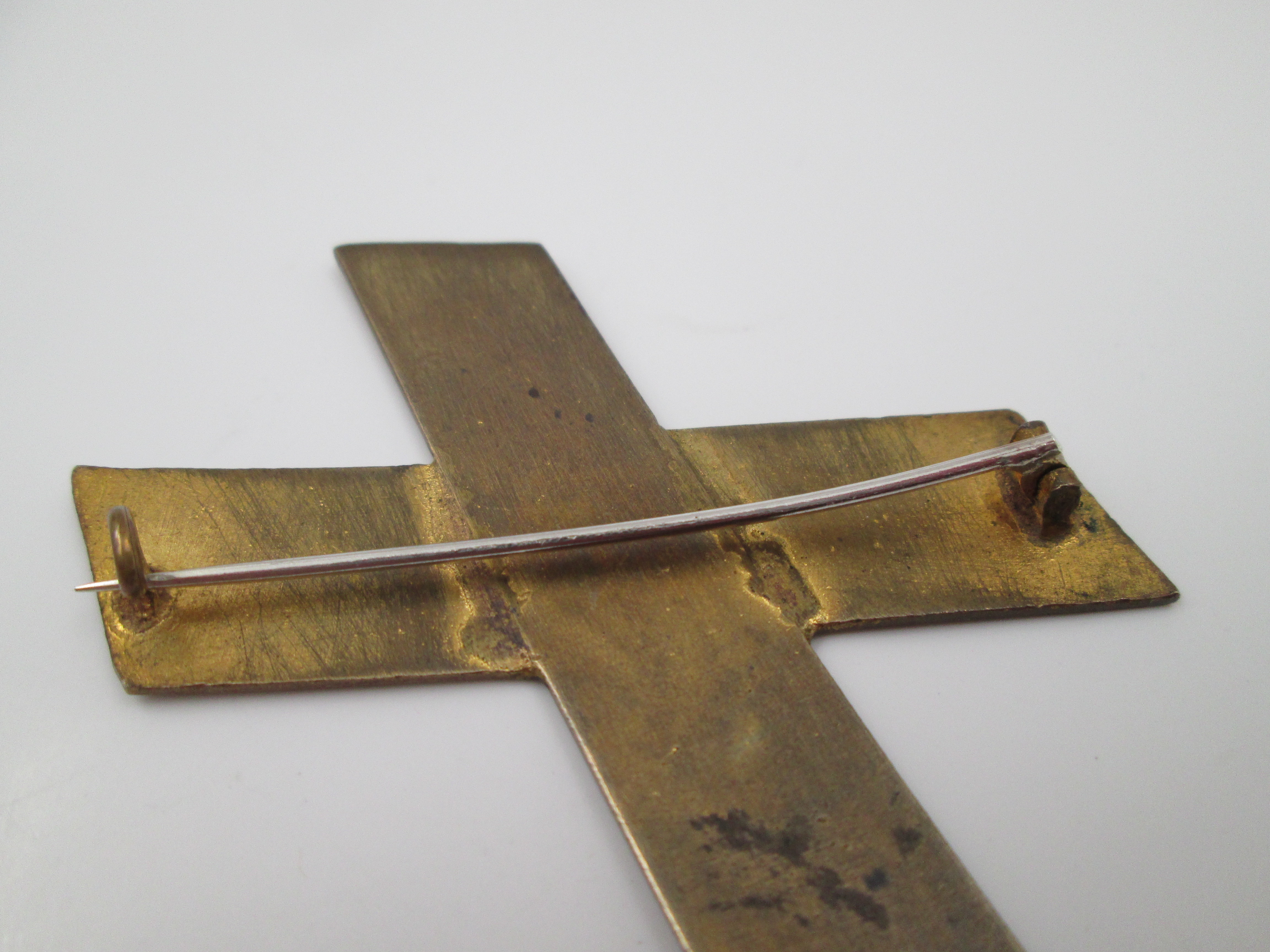 Cruz de bronce y esmalte. Motivos vegetales y geométricos color. Alfiler plata. 1970