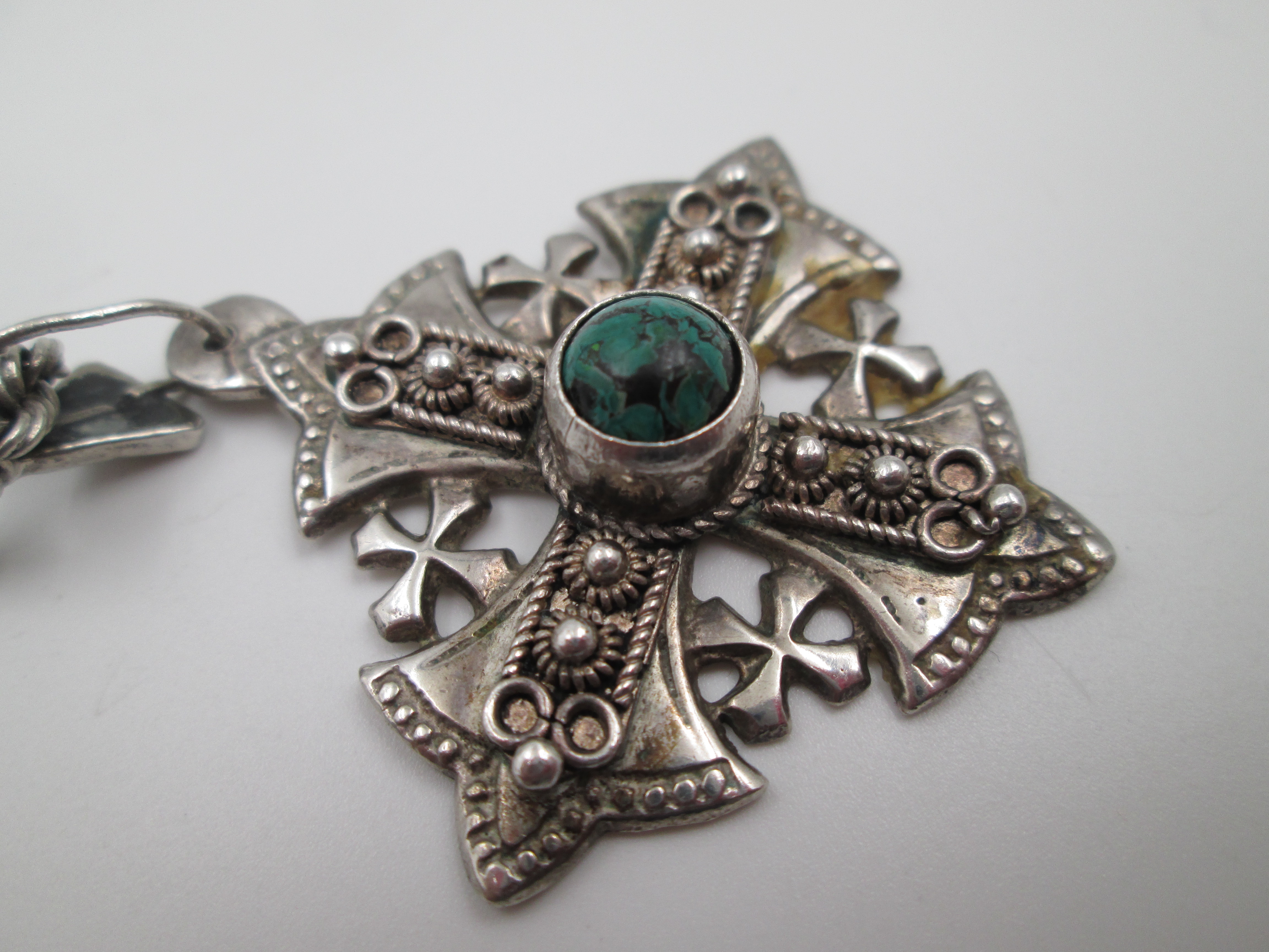 Cruz de Jerusalén con cordón trenzado. Plata de ley y cabujón malaquita. México. 1980