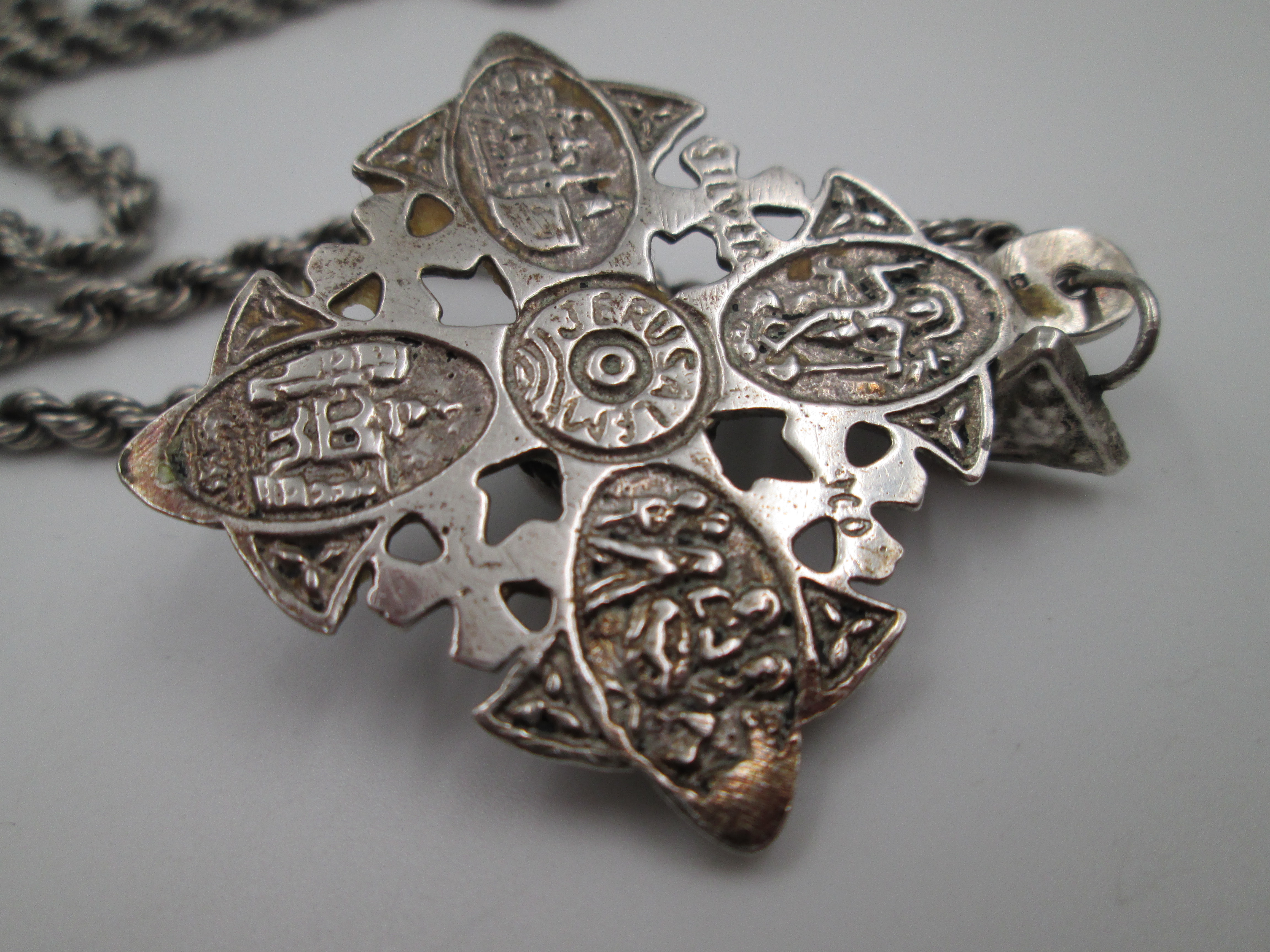 La unidad, también conocida como Cruz de las Cruzadas y procedente de México, se compone de una cruz griega rodeada por otras cuatro cruces de menor tamaño, denominadas crucetas, y se adorna con esferas, motivos de cordón y un cabujón de malaquita en el frontal mientras que el reverso recoge escenas religiosas en medallones.