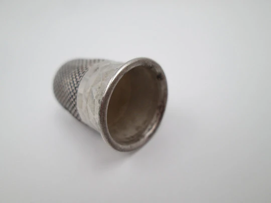 Dedal de costura con medallón de la Virgen del Henar. Plata de ley. Patrón geométrico. 1950