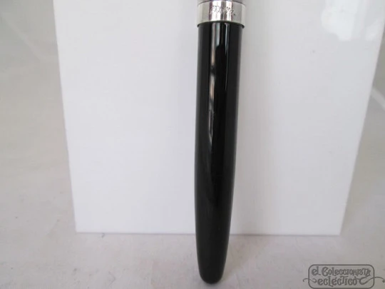 Se trata de una pluma de la colección Graffiti que lleva el cuerpo finalizado en resina negra de alta calidad y el capuchón rematado en plata de ley contrastada de 925 milésimas y decorado con un fino grabado de líneas verticales.