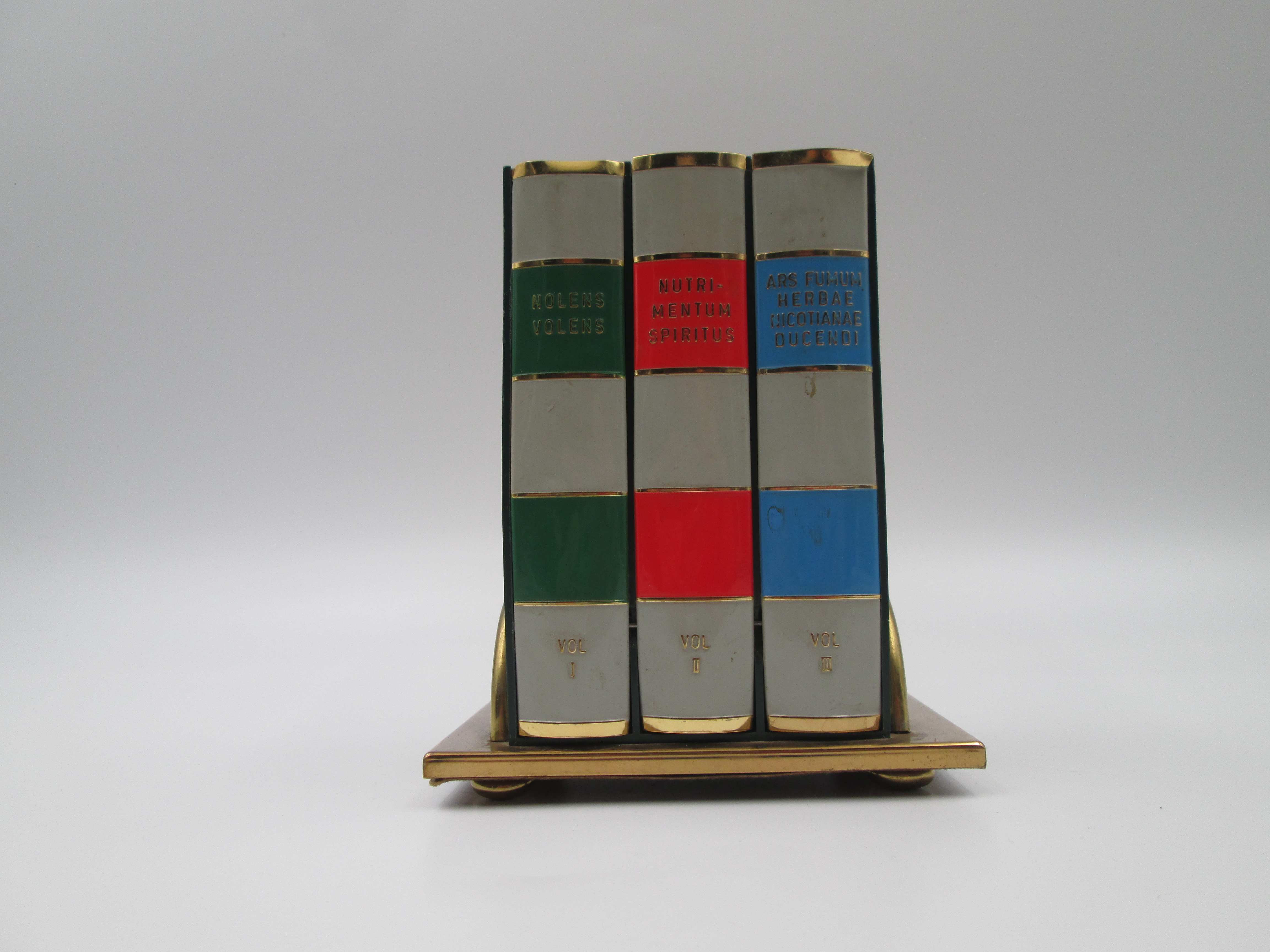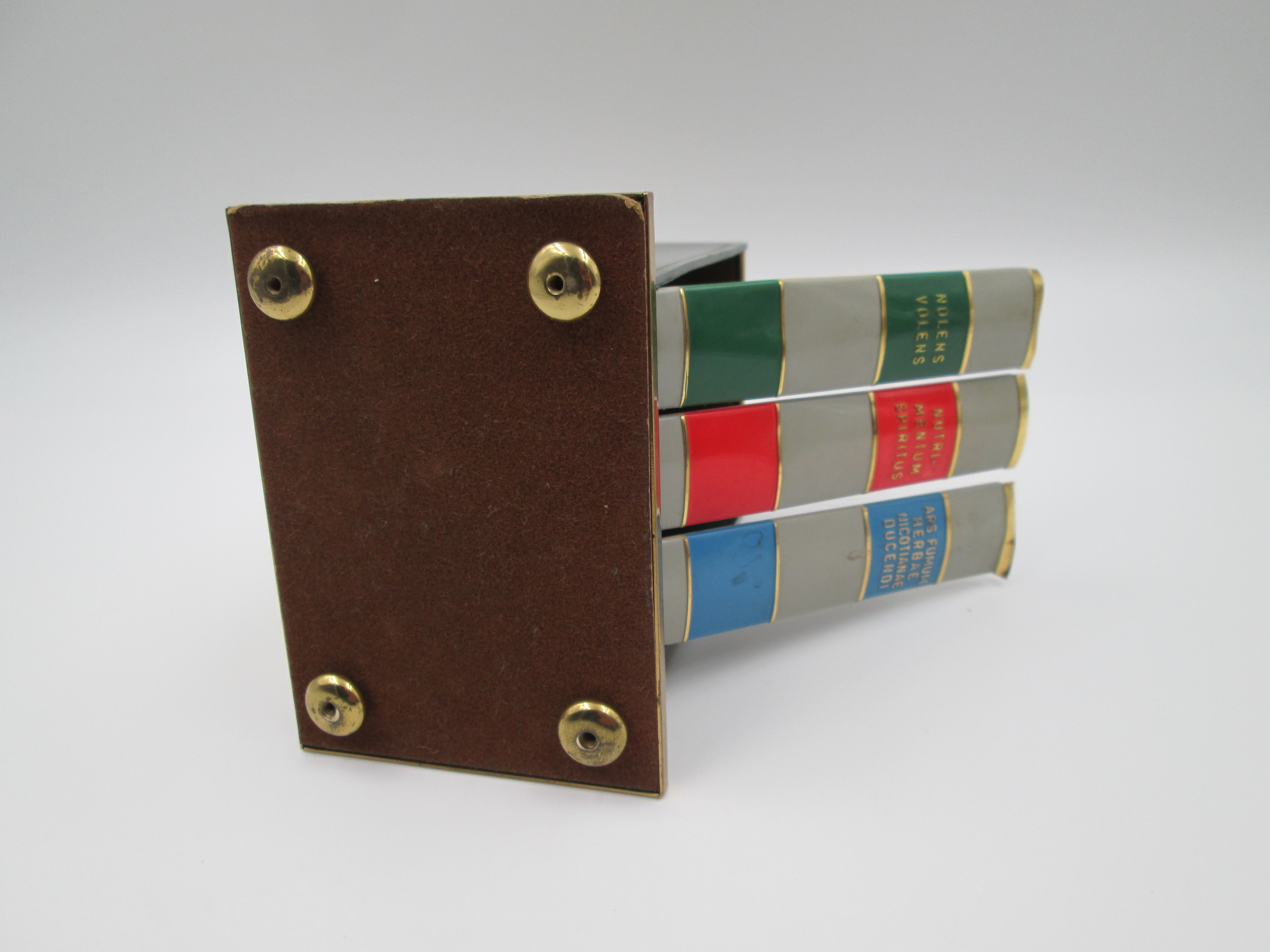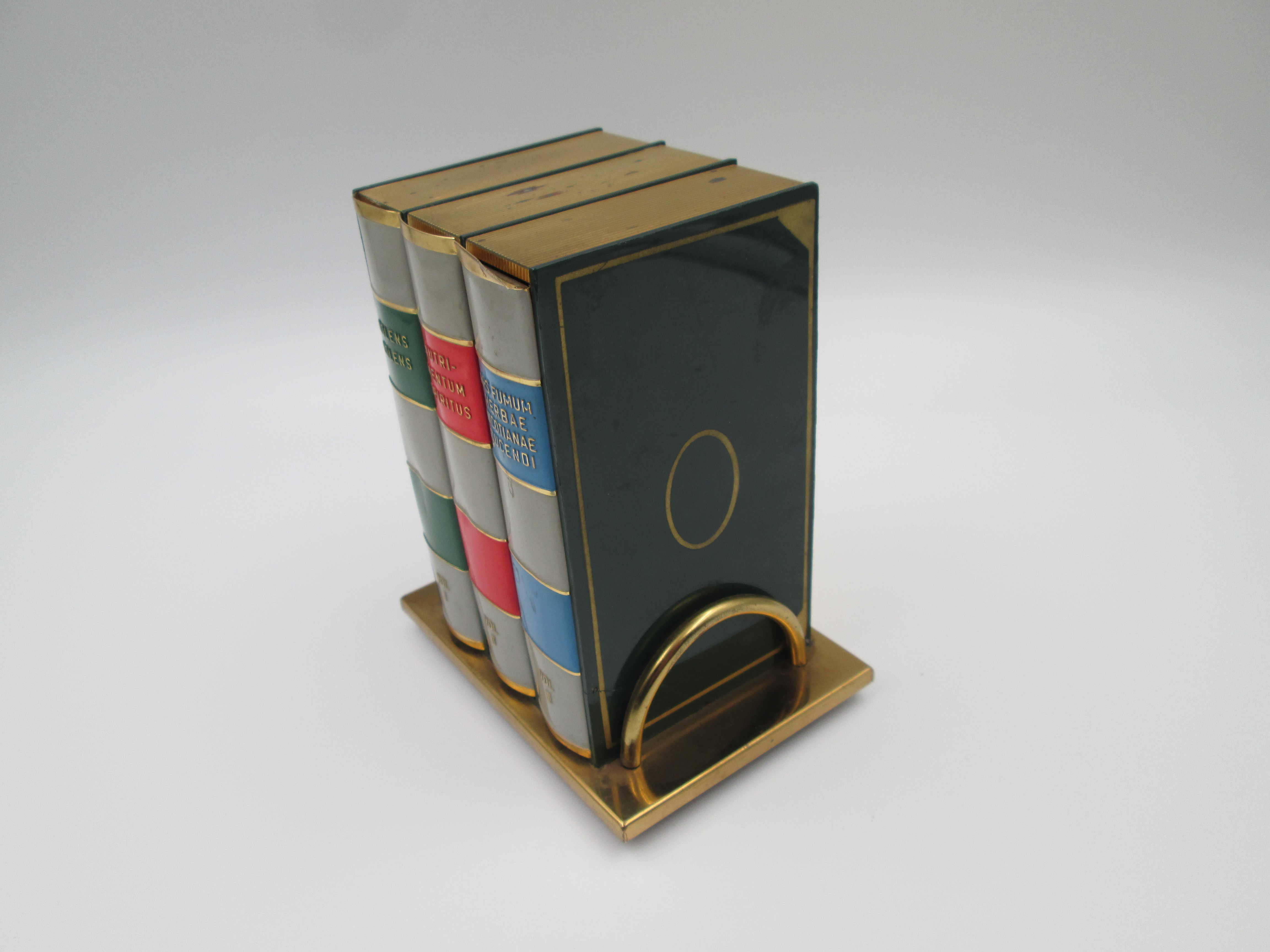 Dispensador de cigarrillos con forma de libro y base. Latón lacado a color. Italia. 1950