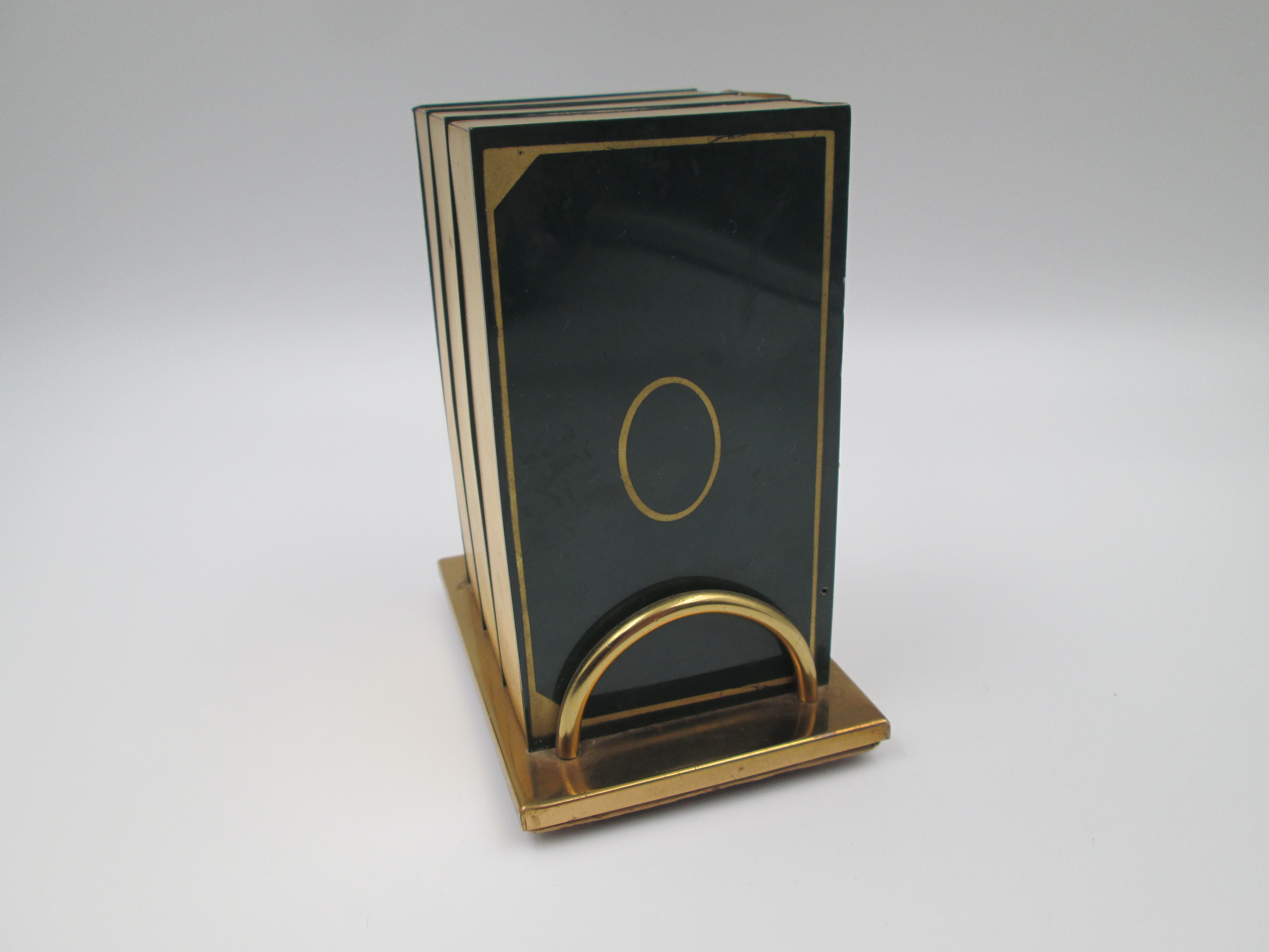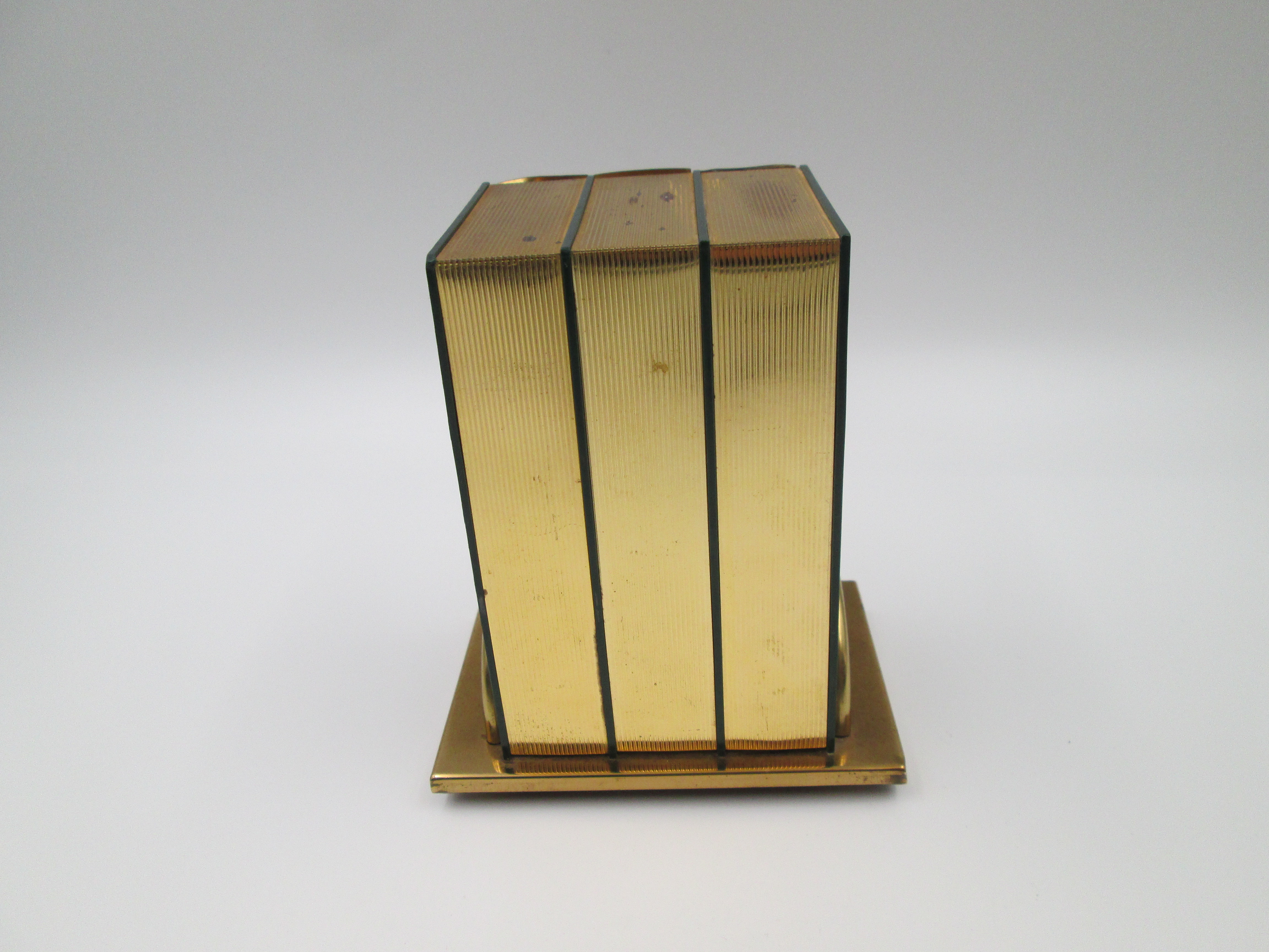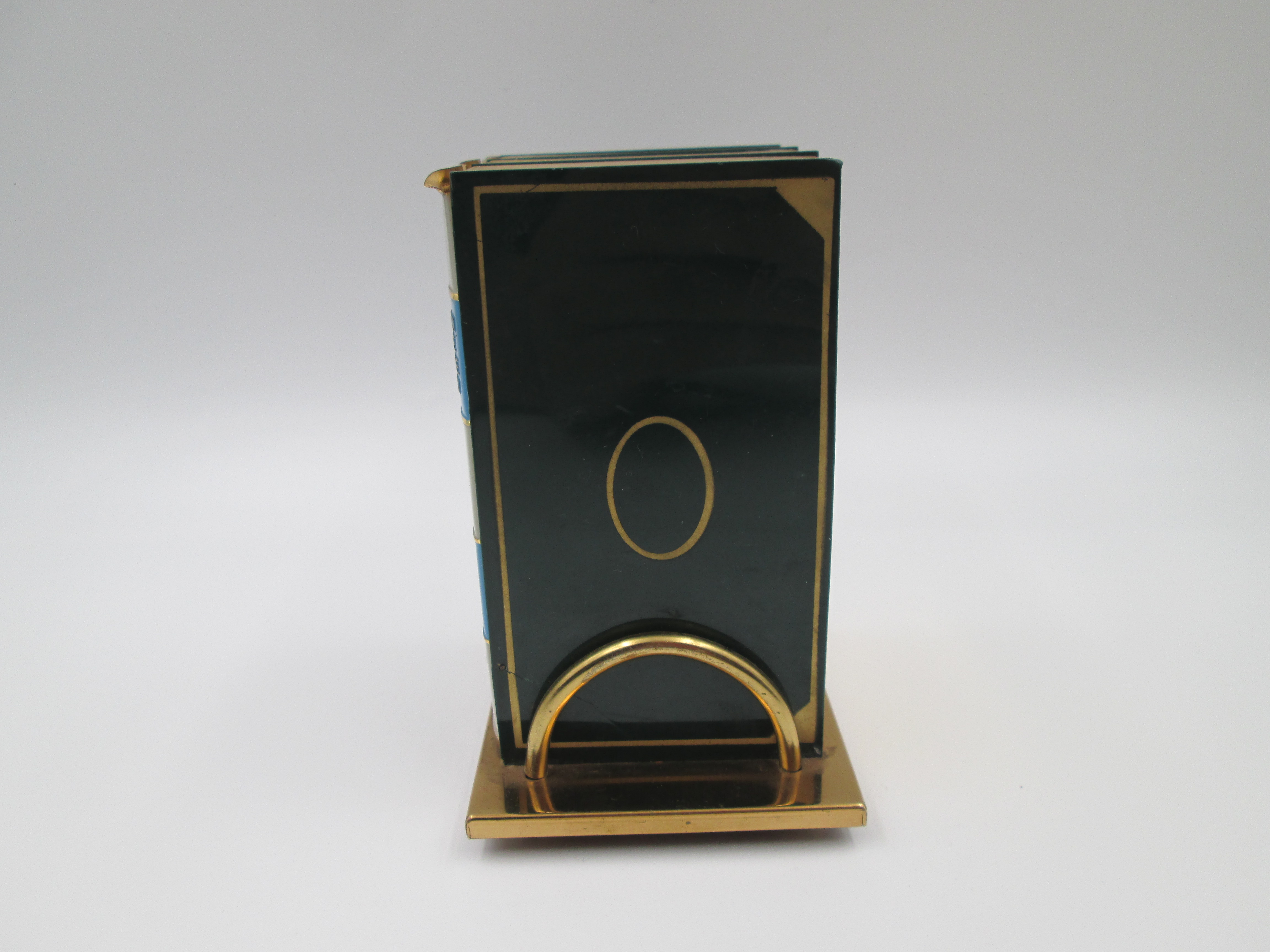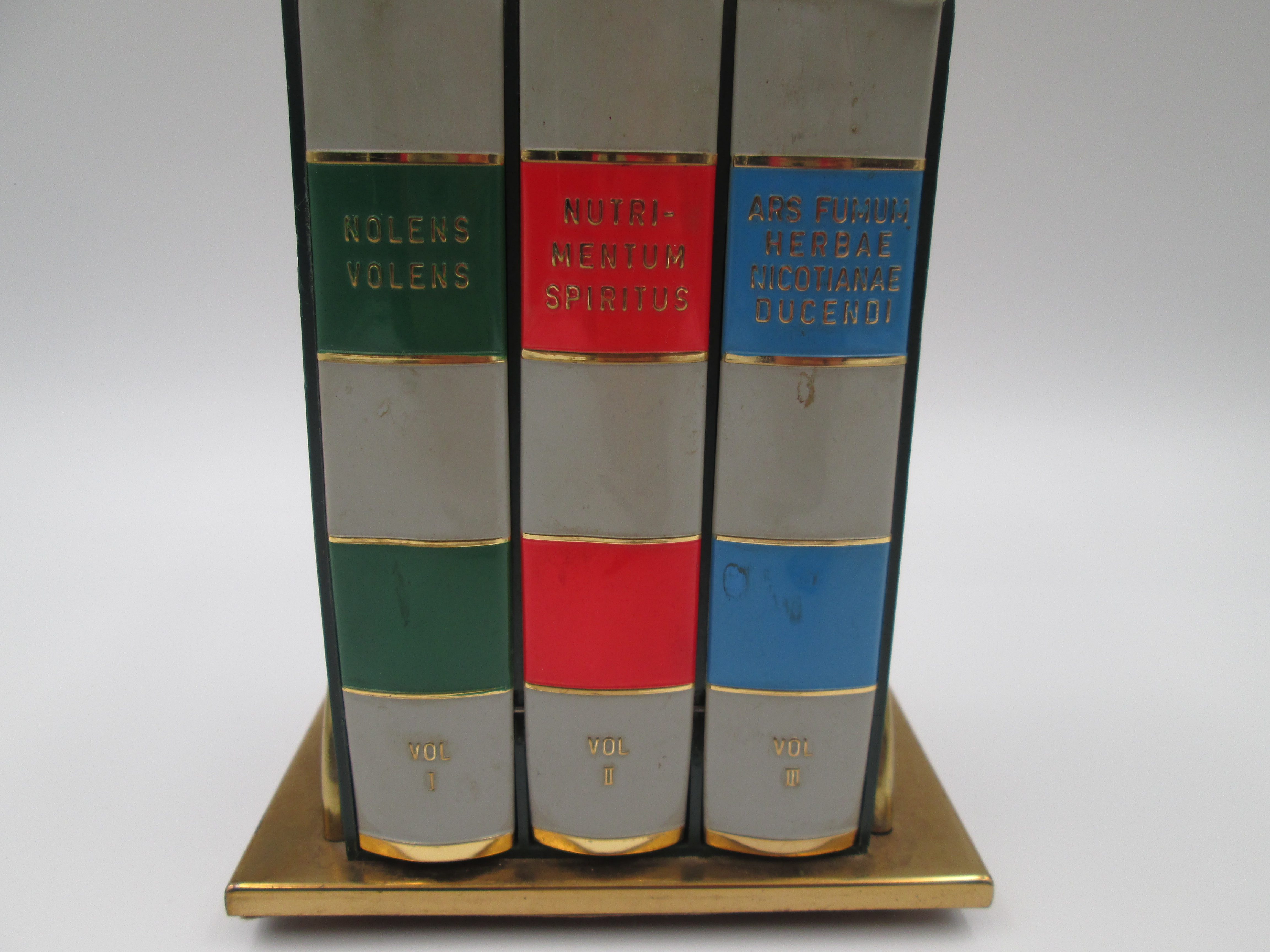 Dispensador de cigarrillos con forma de libro y base. Latón lacado a color. Italia. 1950