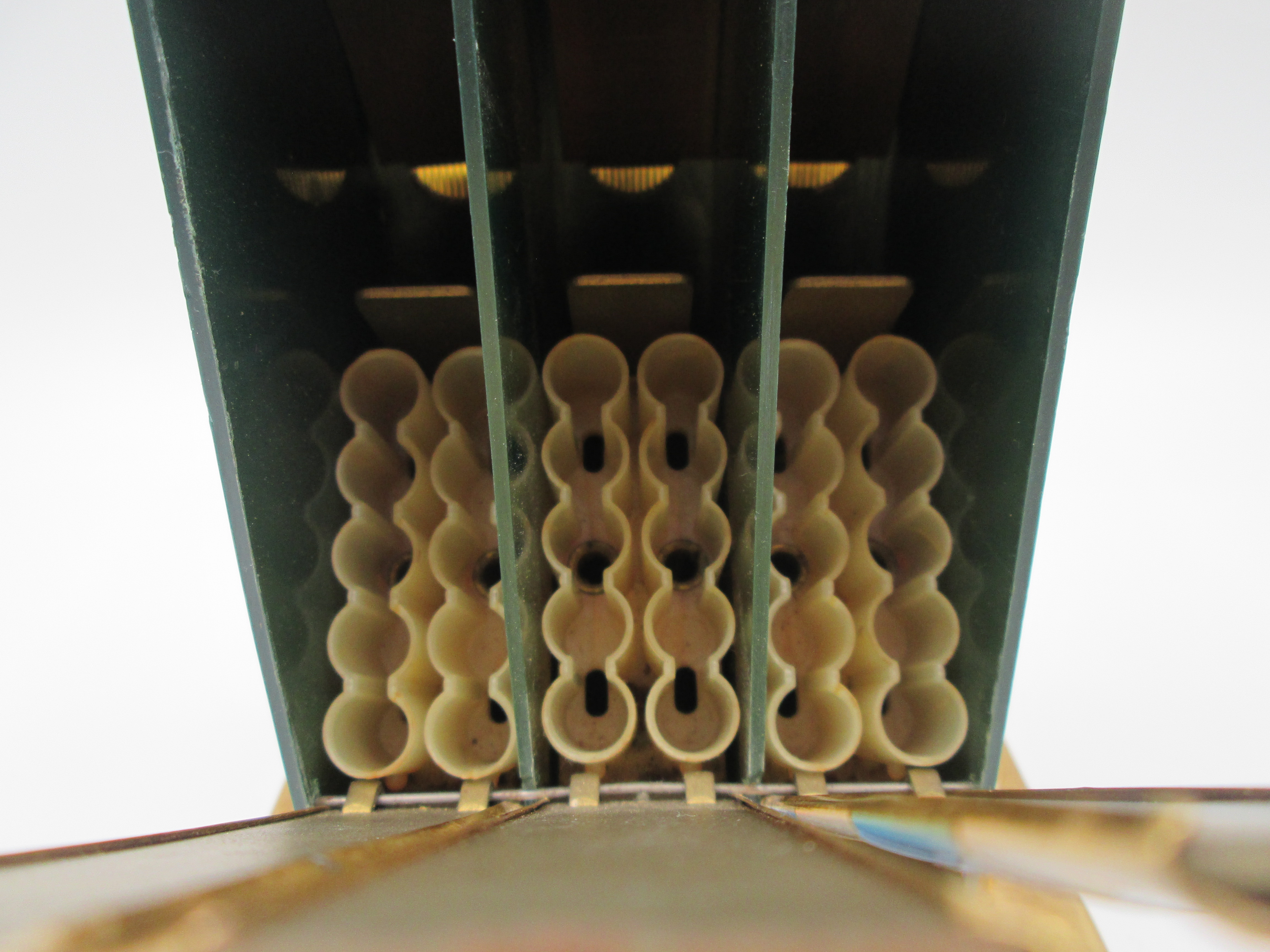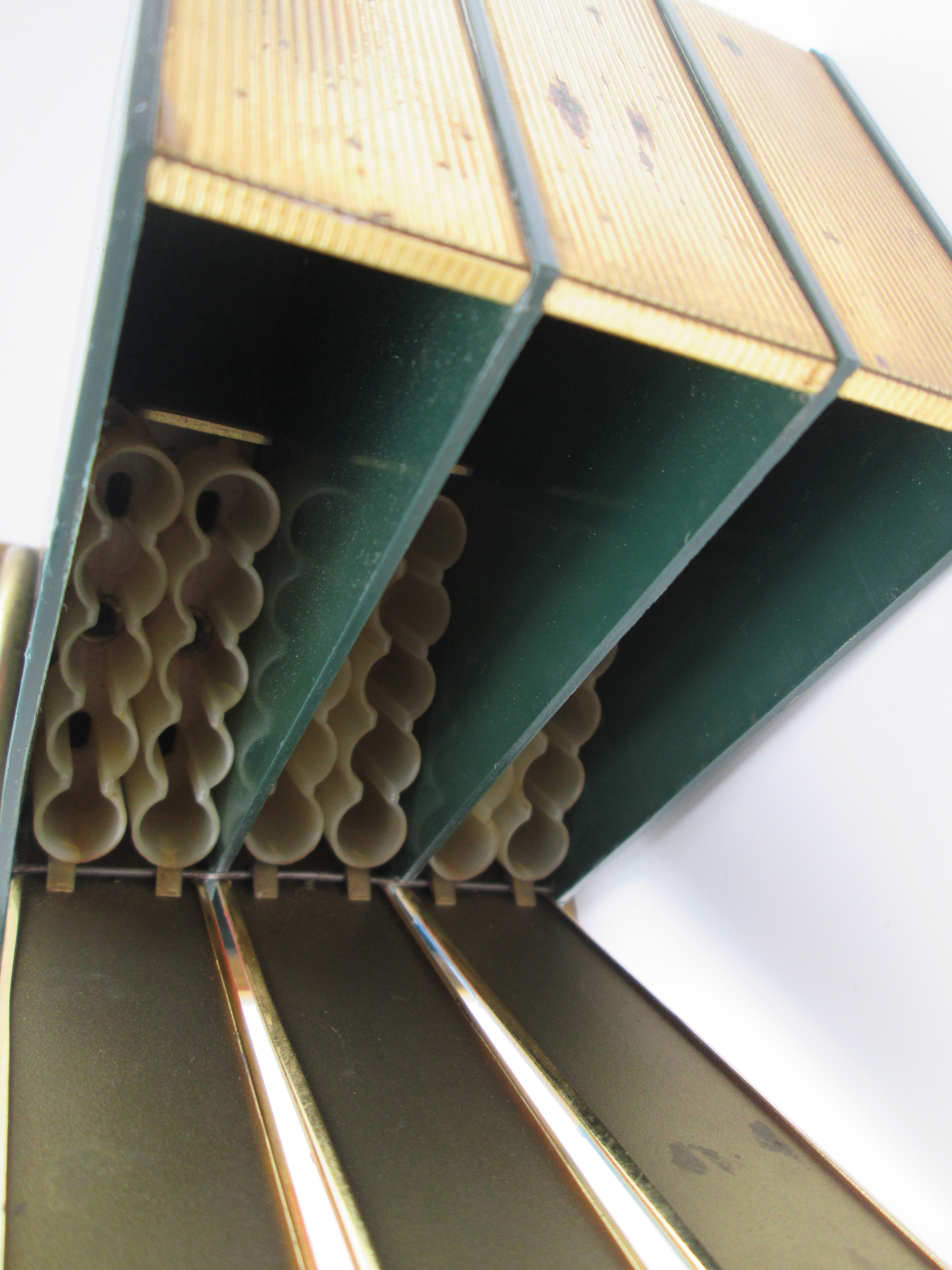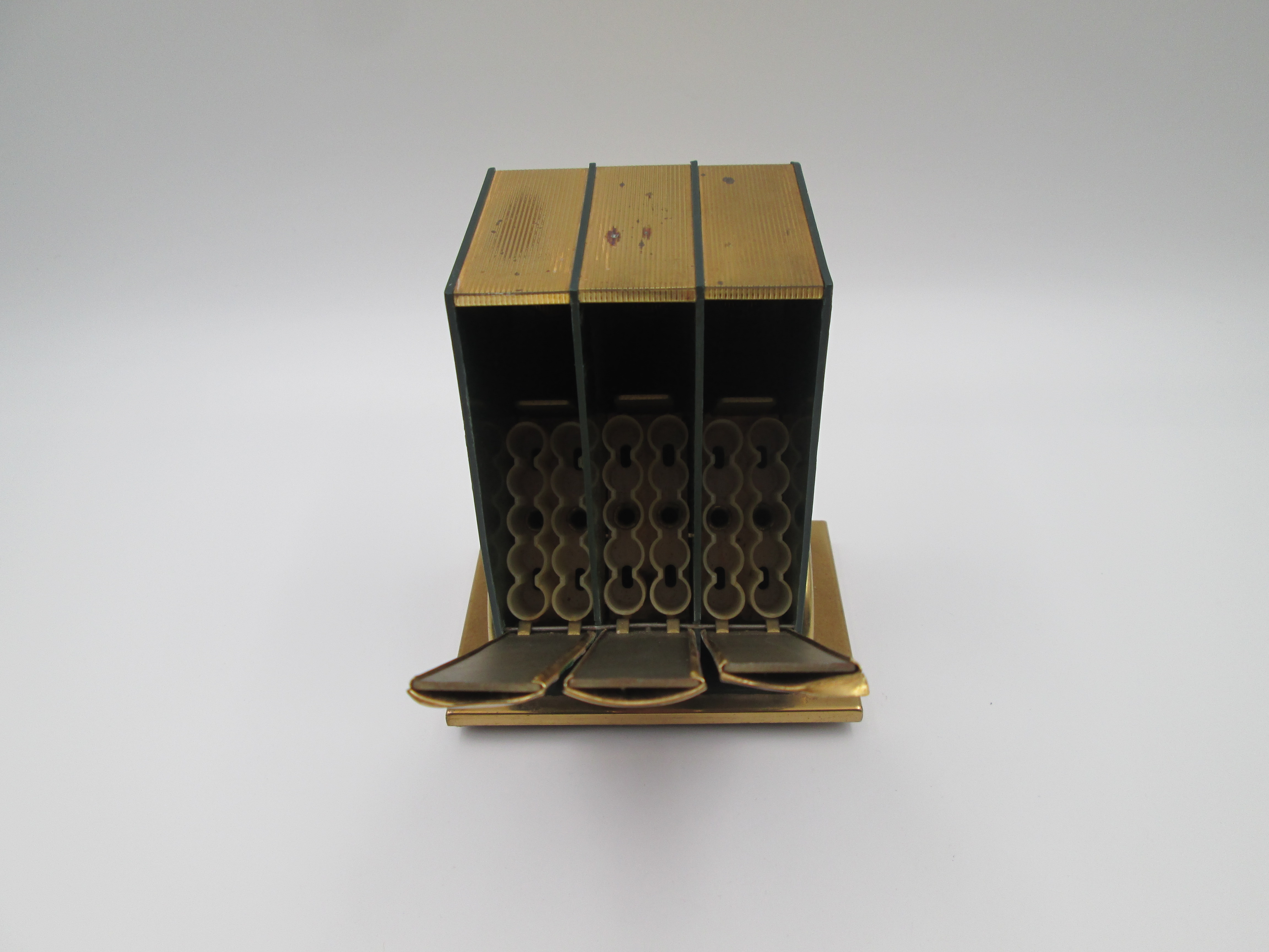 Los lomos abatibles individualmente de los tres volúmenes esconden, cada uno, dos líneas de soportes para pitillos de celuloide que suman una capacidad total de 30 unidades.