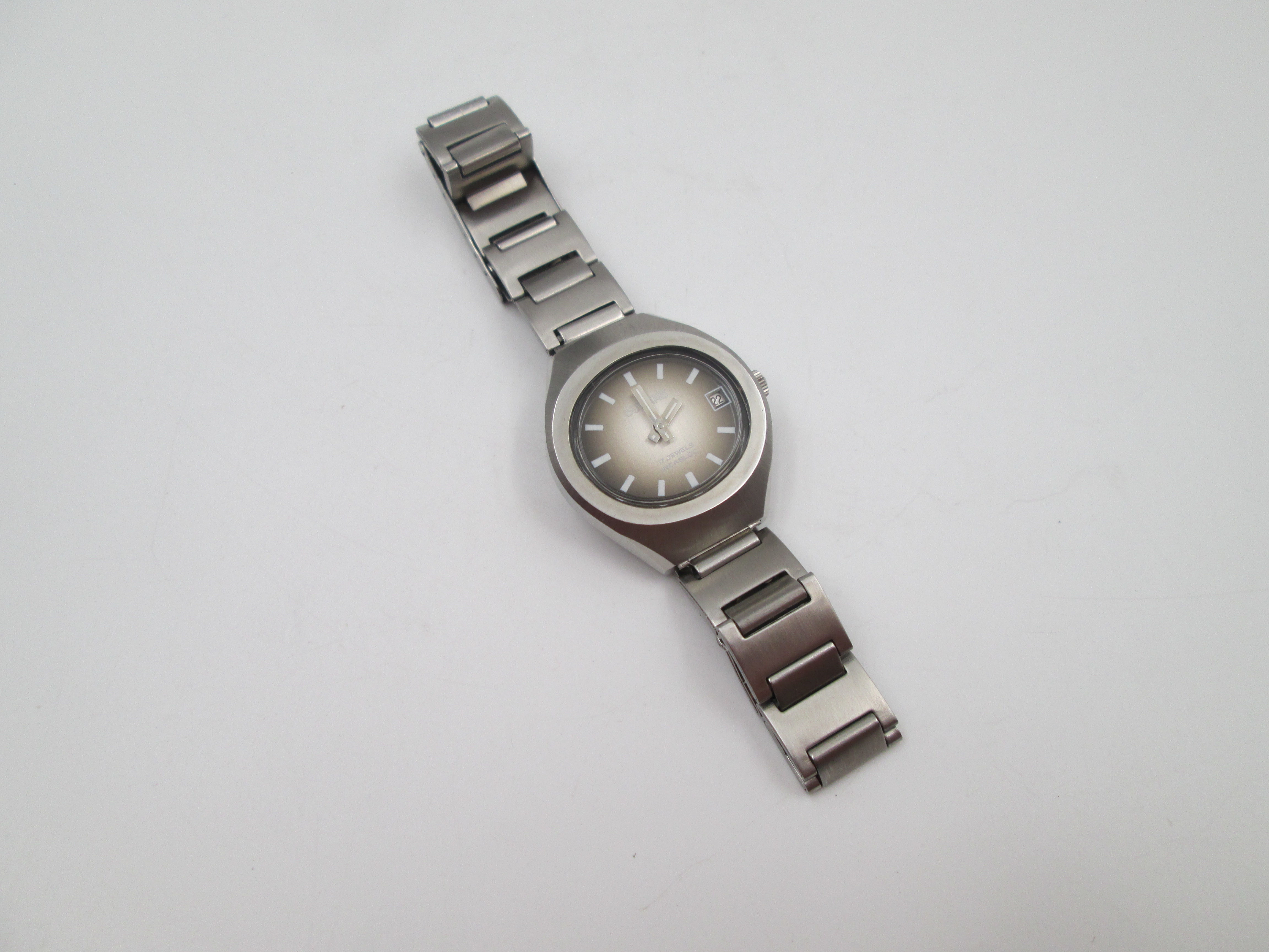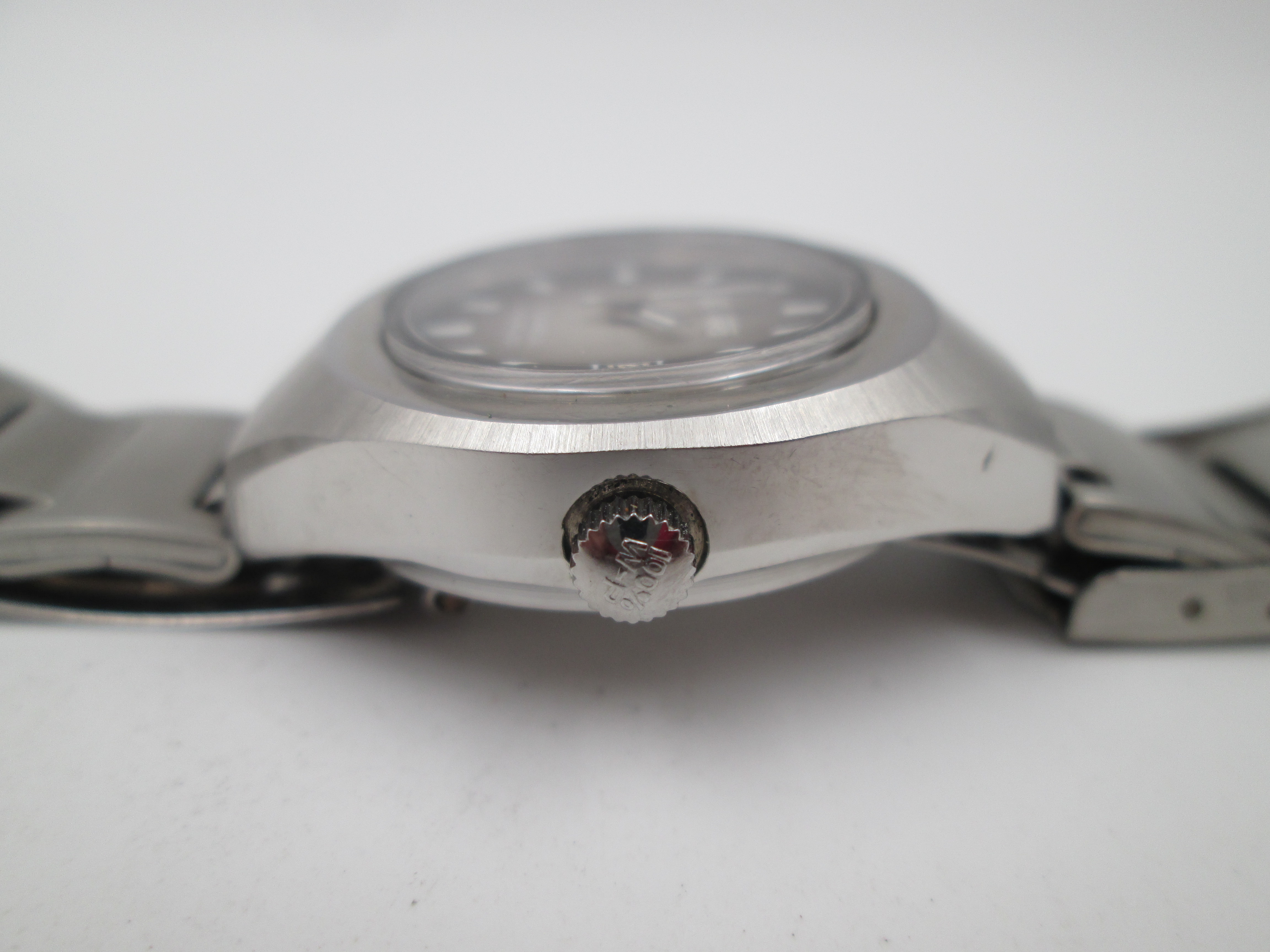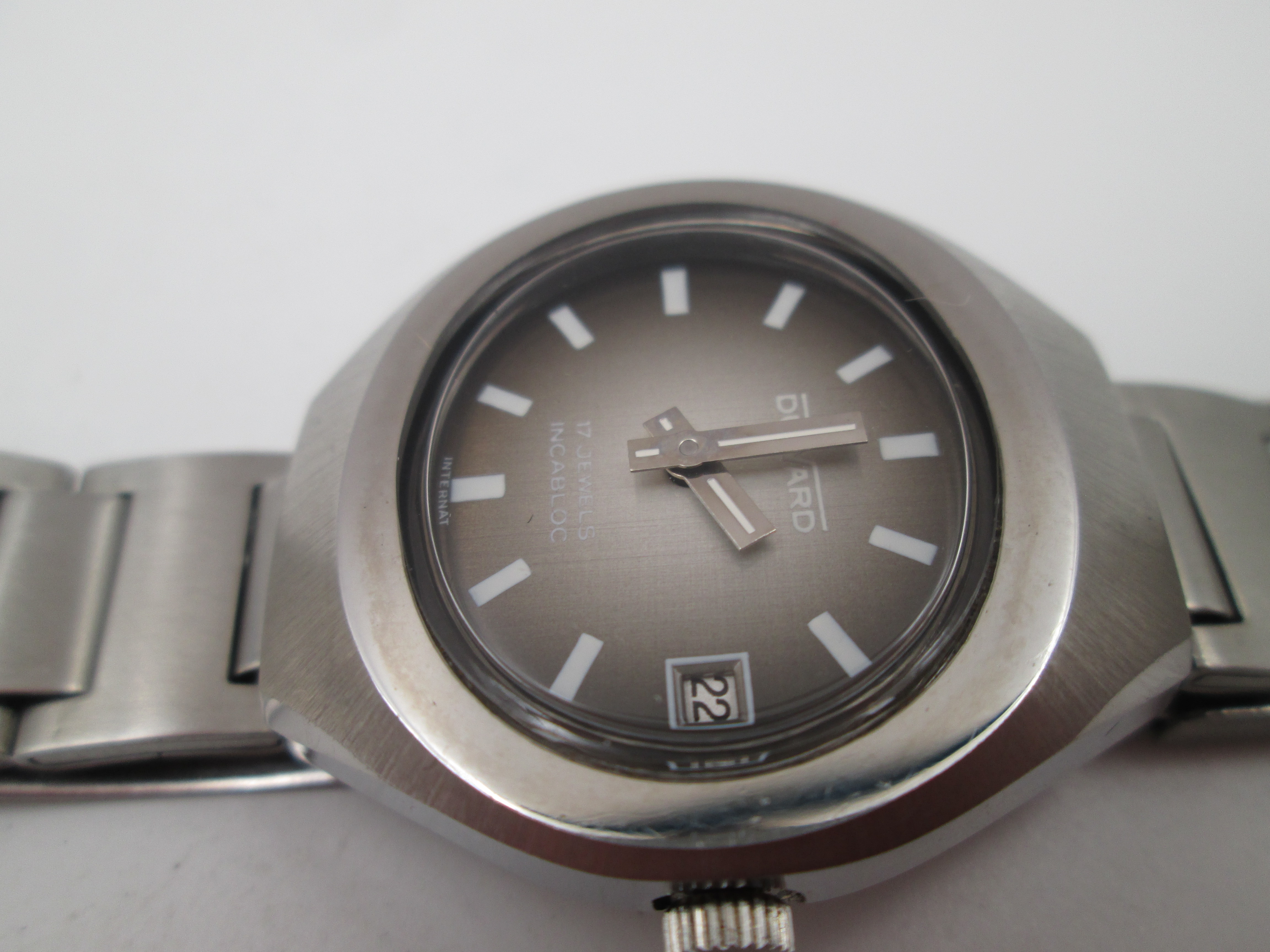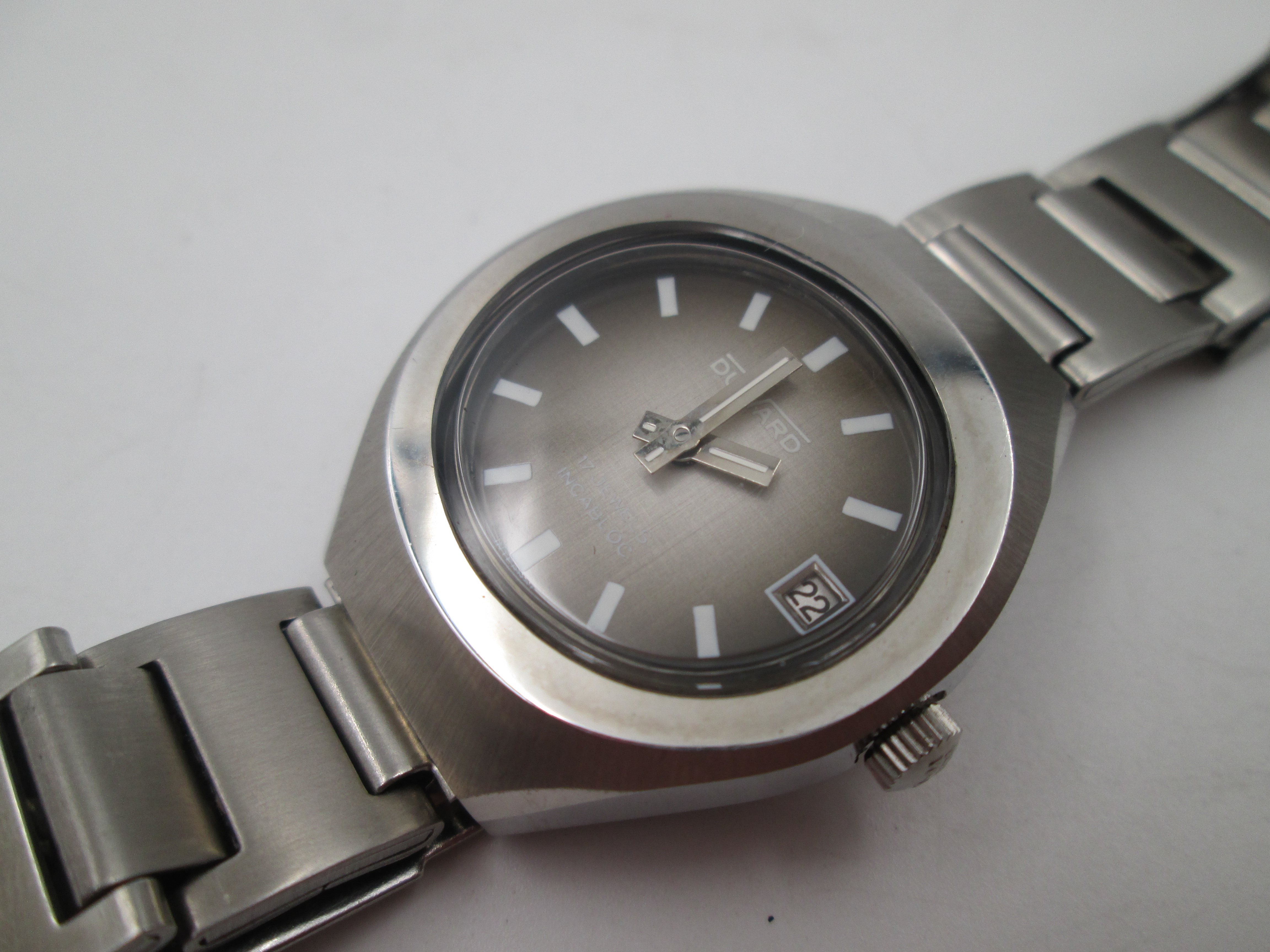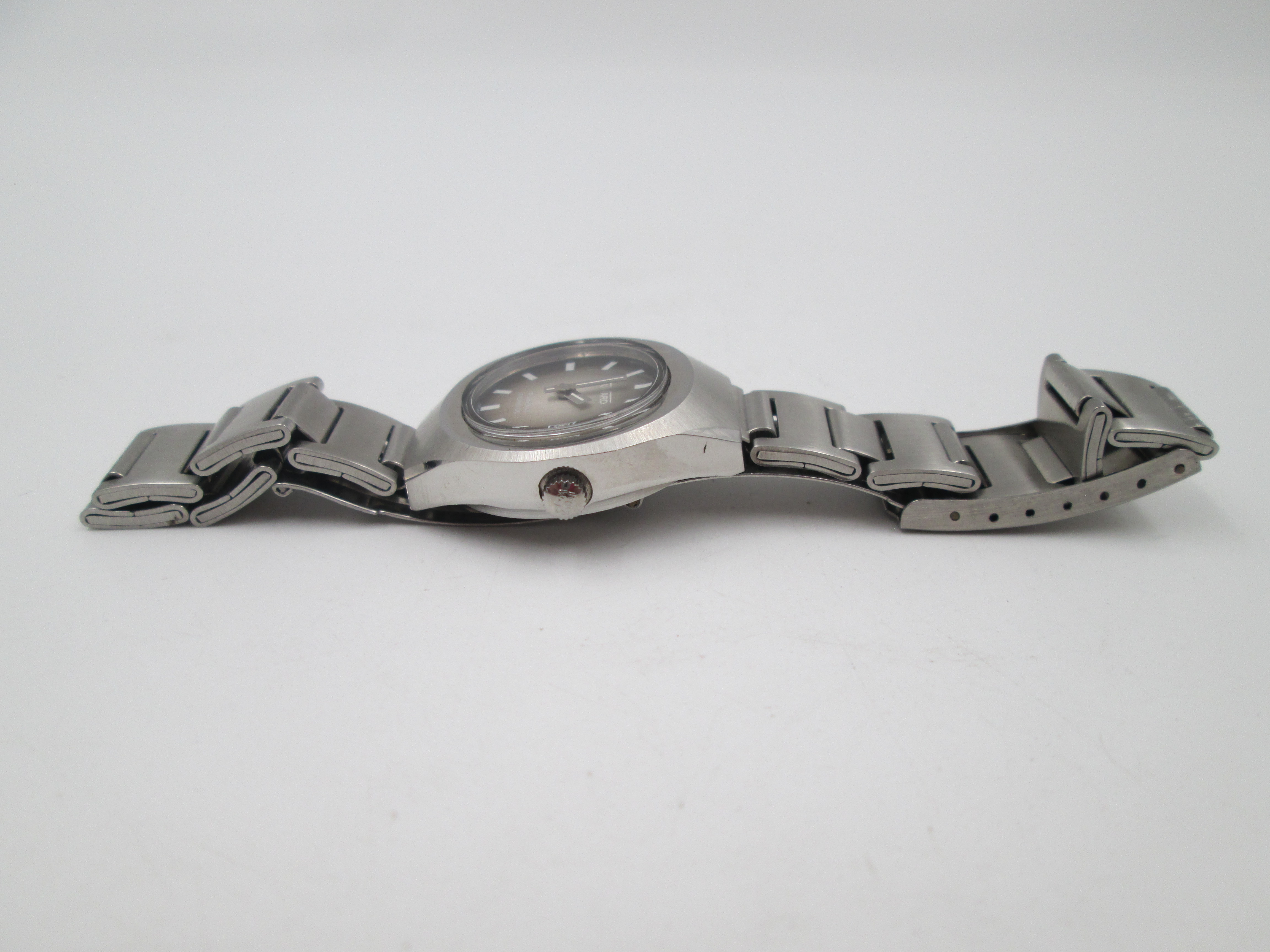 Presenta una esfera tornasolada de tonos grises y marrones, con índices en blanco, agujas plateadas y calendario (fecha) de cambio tradicional en ventana a las tres.