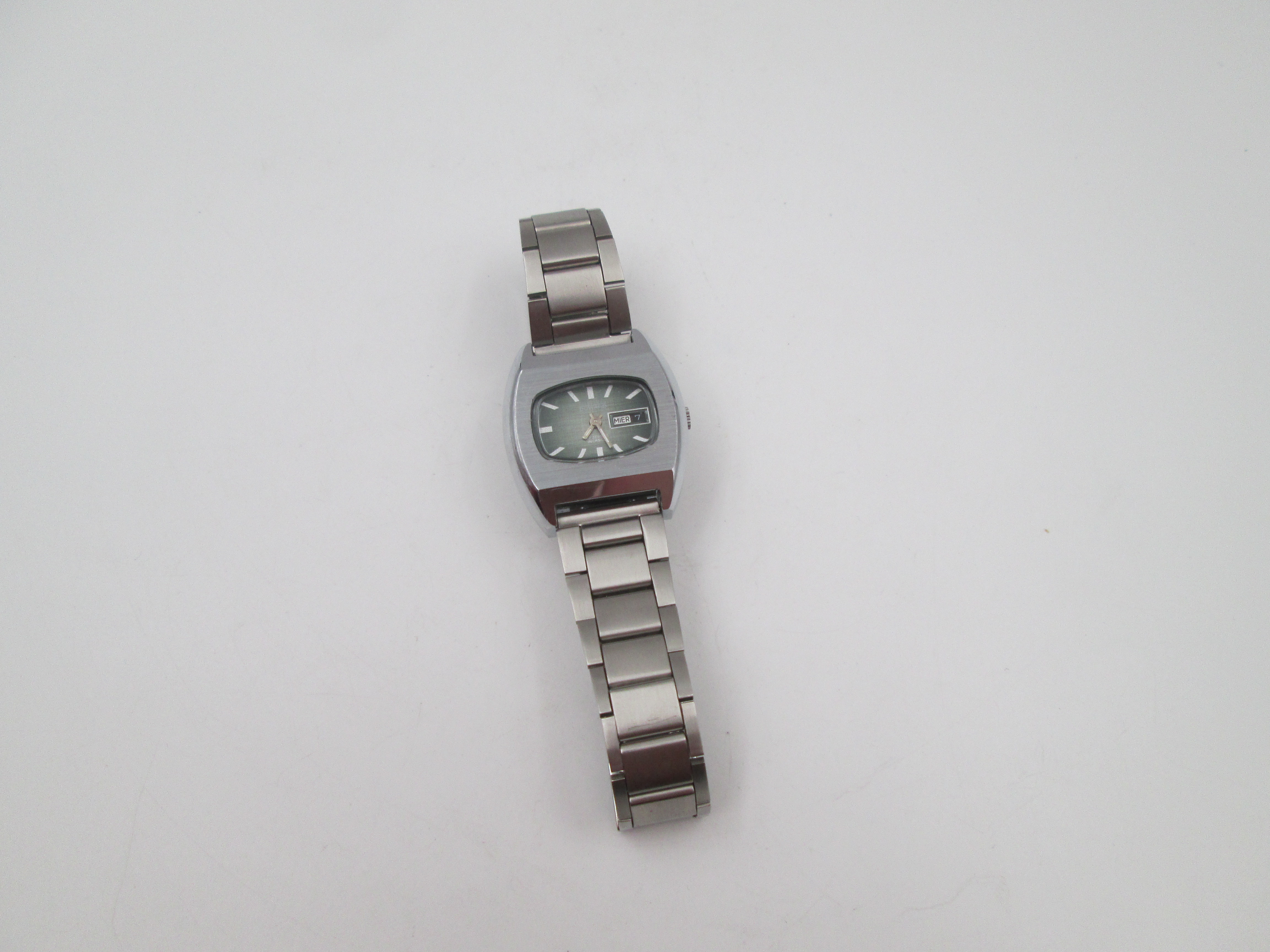 Presenta una esfera metálica verde, con índices y agujas en blanco y plata y calendario (día y fecha) de cambio tradicional en ventana a las tres.
