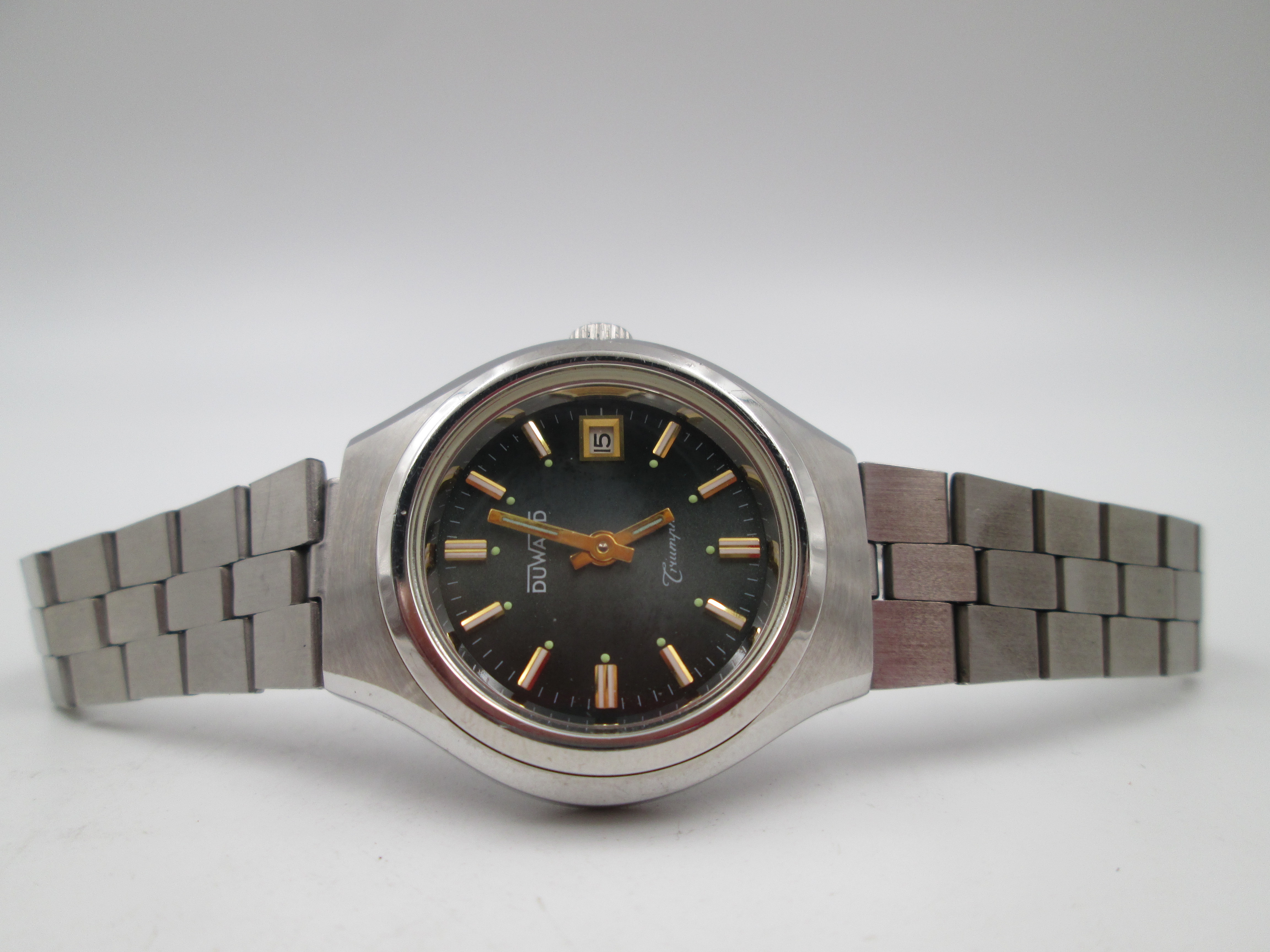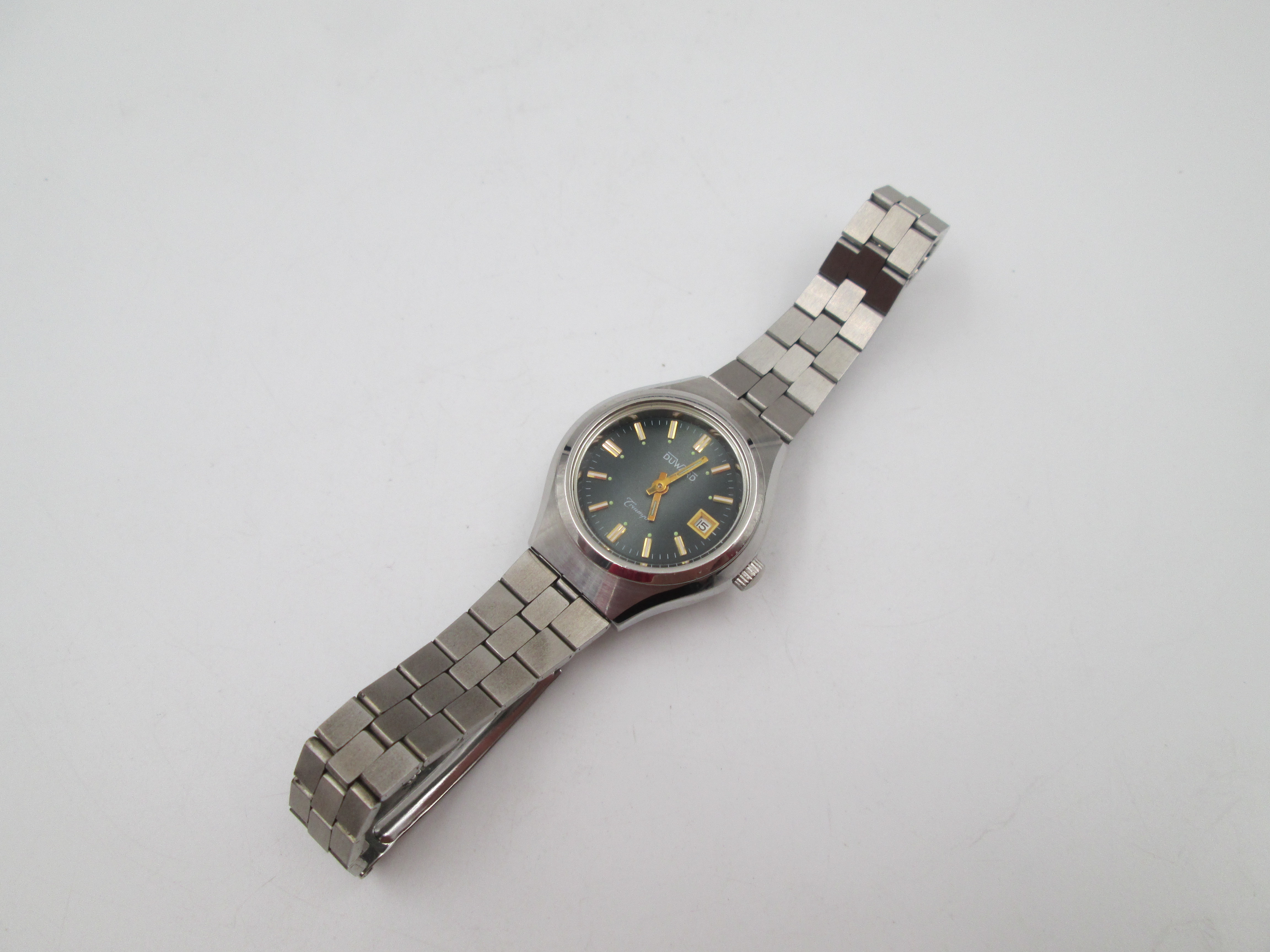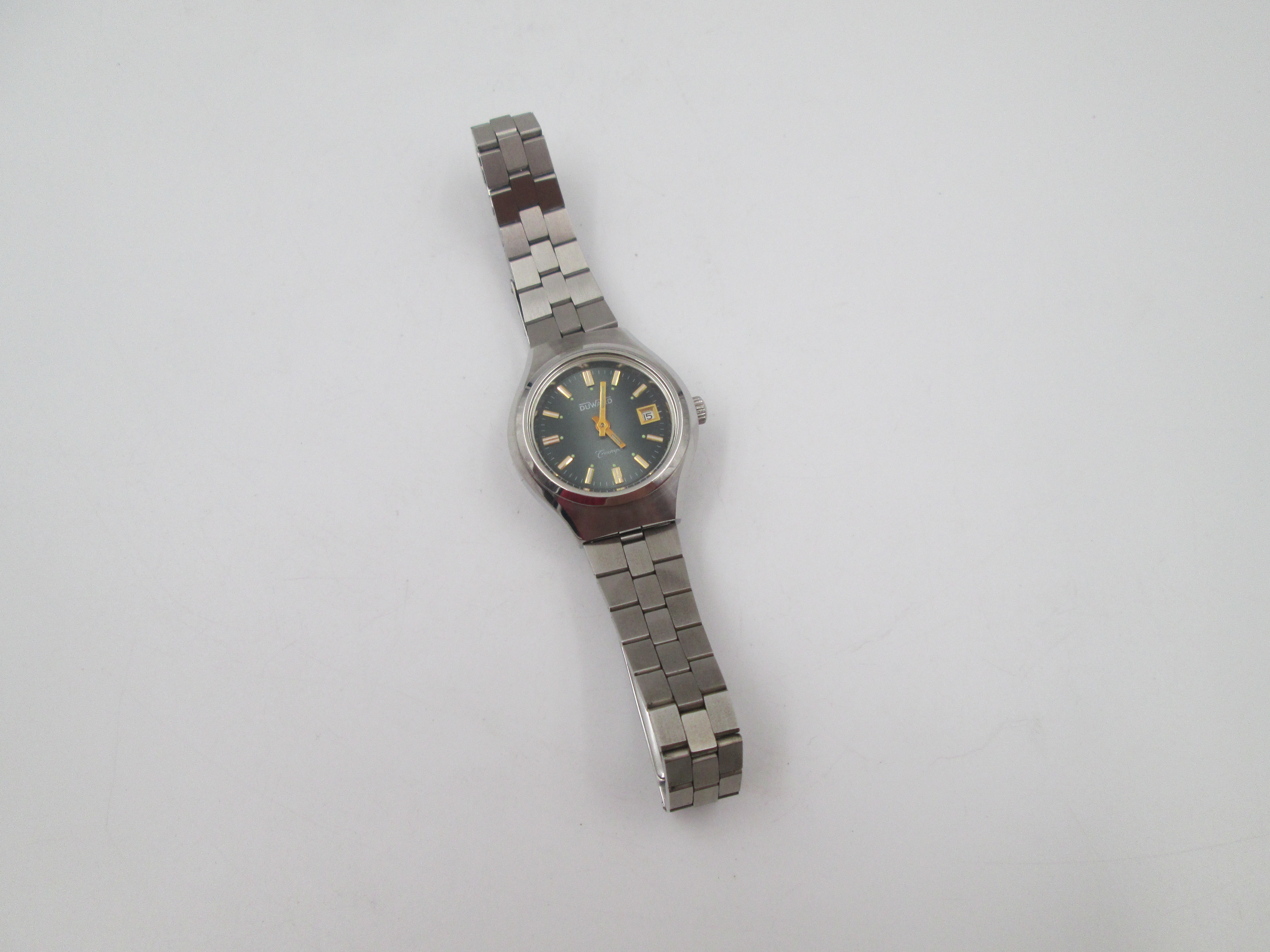 Duward Triumph mujer. Acero. Cuerda manual. Calendario. Brazalete. Esfera verde. 1970