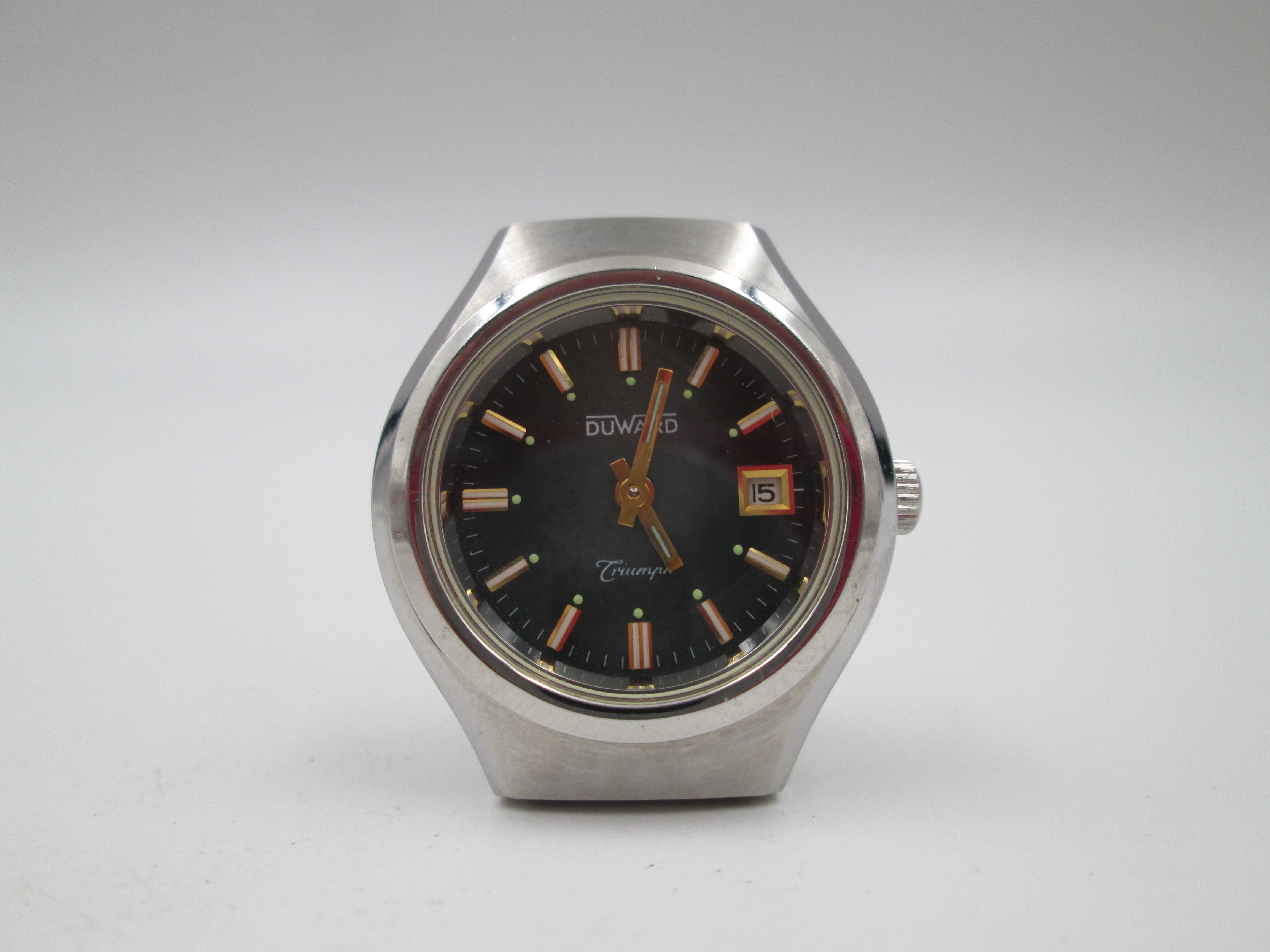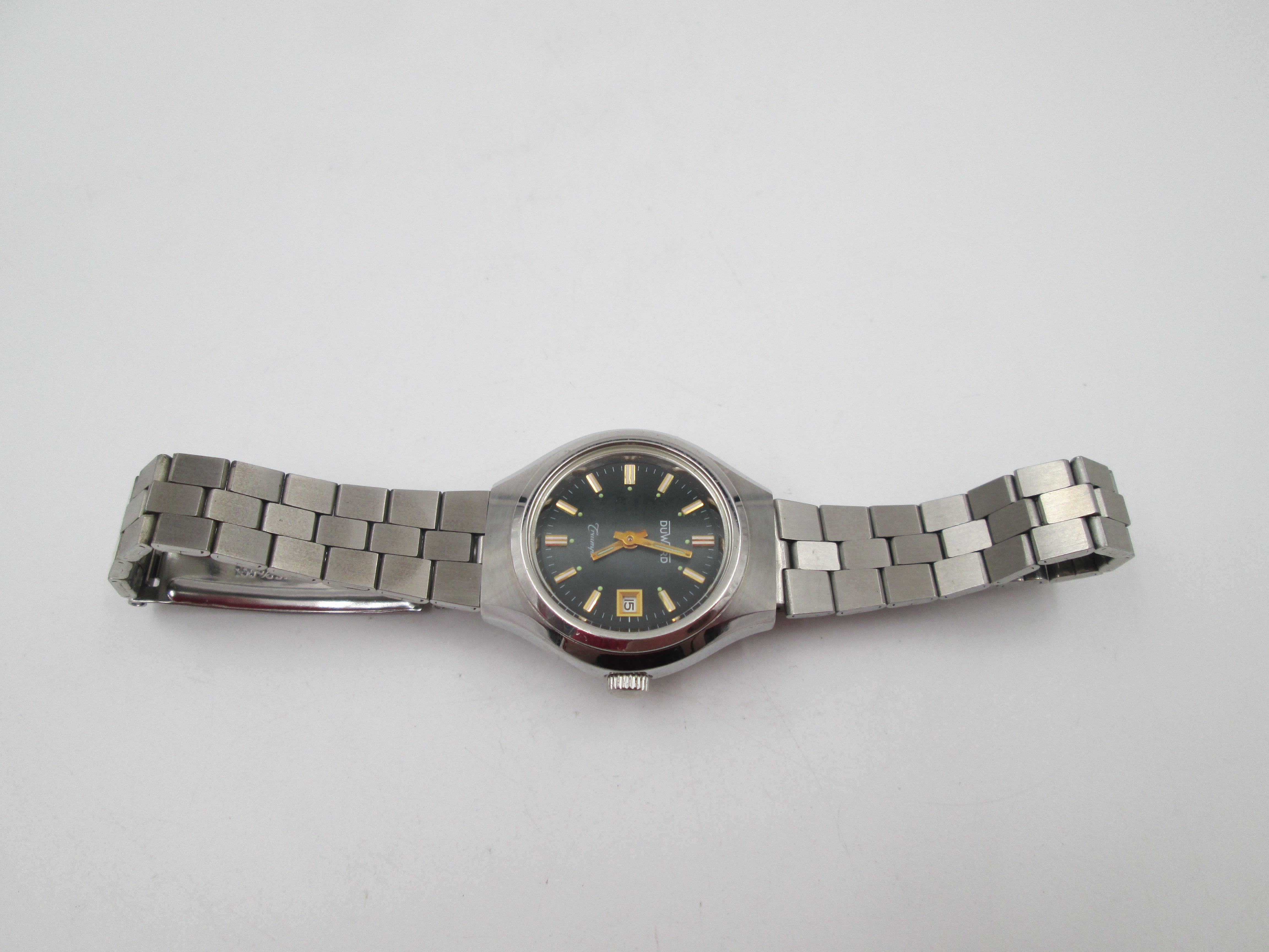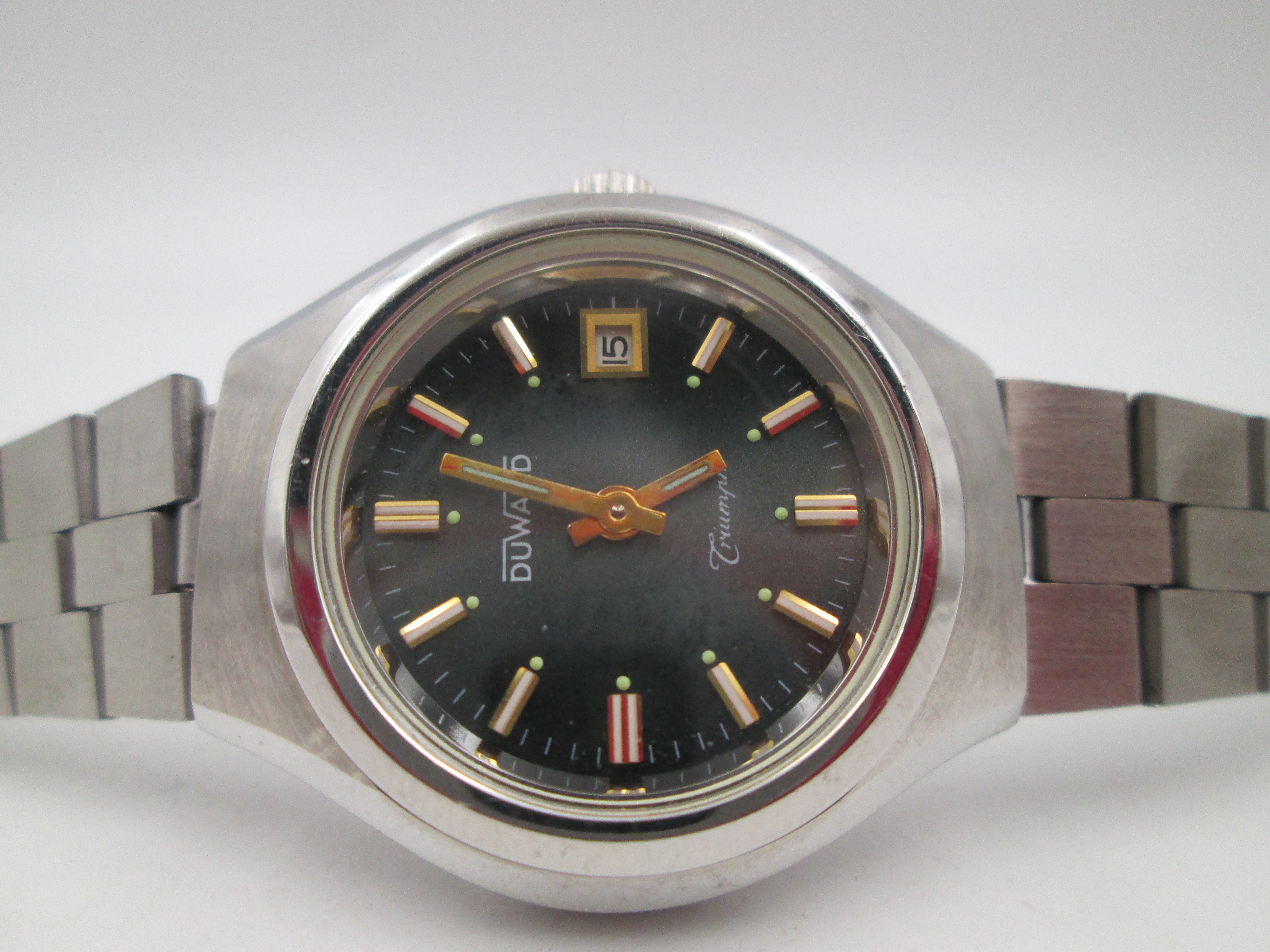 Duward Triumph mujer. Acero. Cuerda manual. Calendario. Brazalete. Esfera verde. 1970
