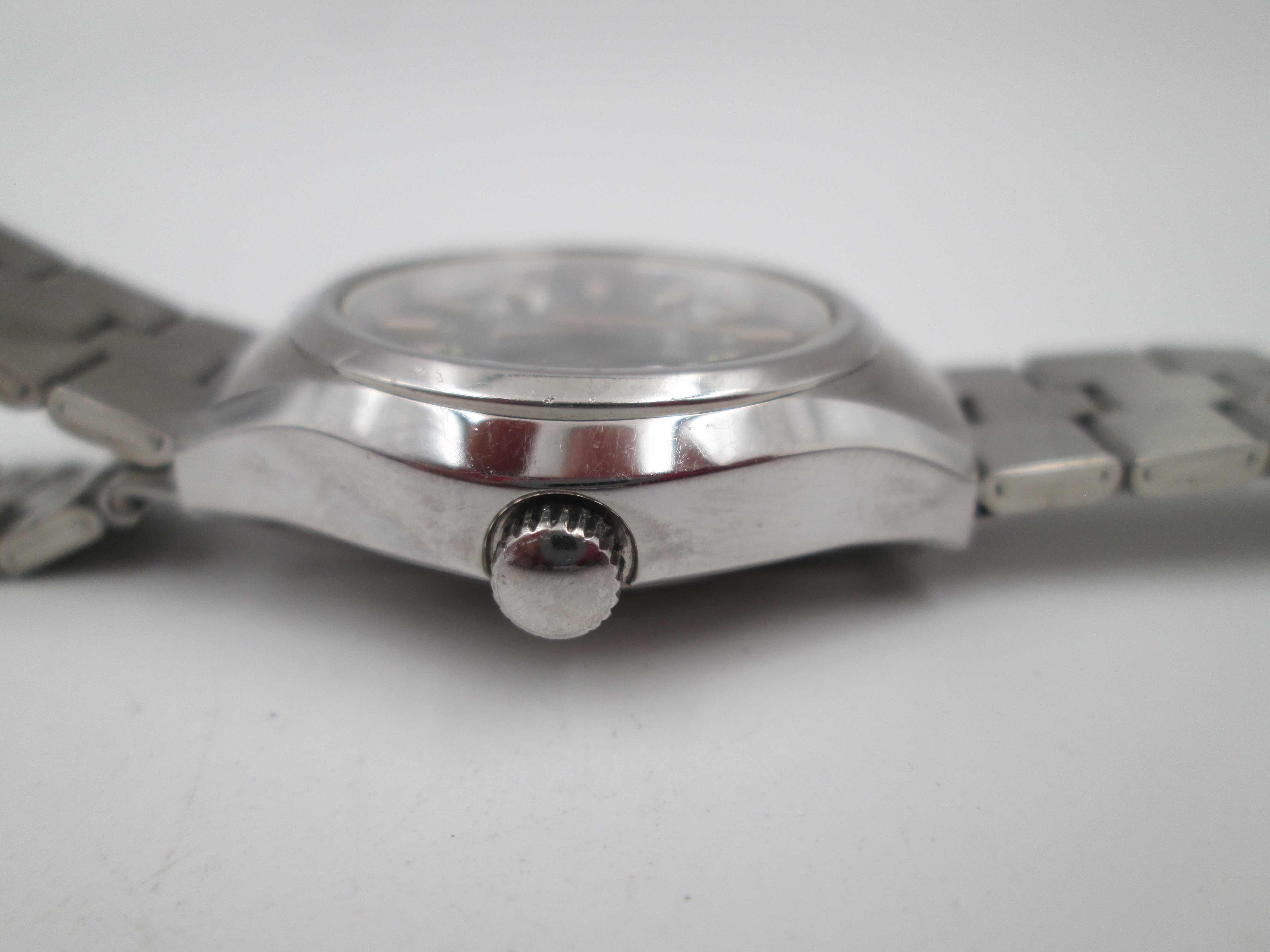 Presenta una esfera verde, con índices y agujas luminiscentes en blanco y dorado y calendario (fecha) de cambio tradicional en ventana a las tres.