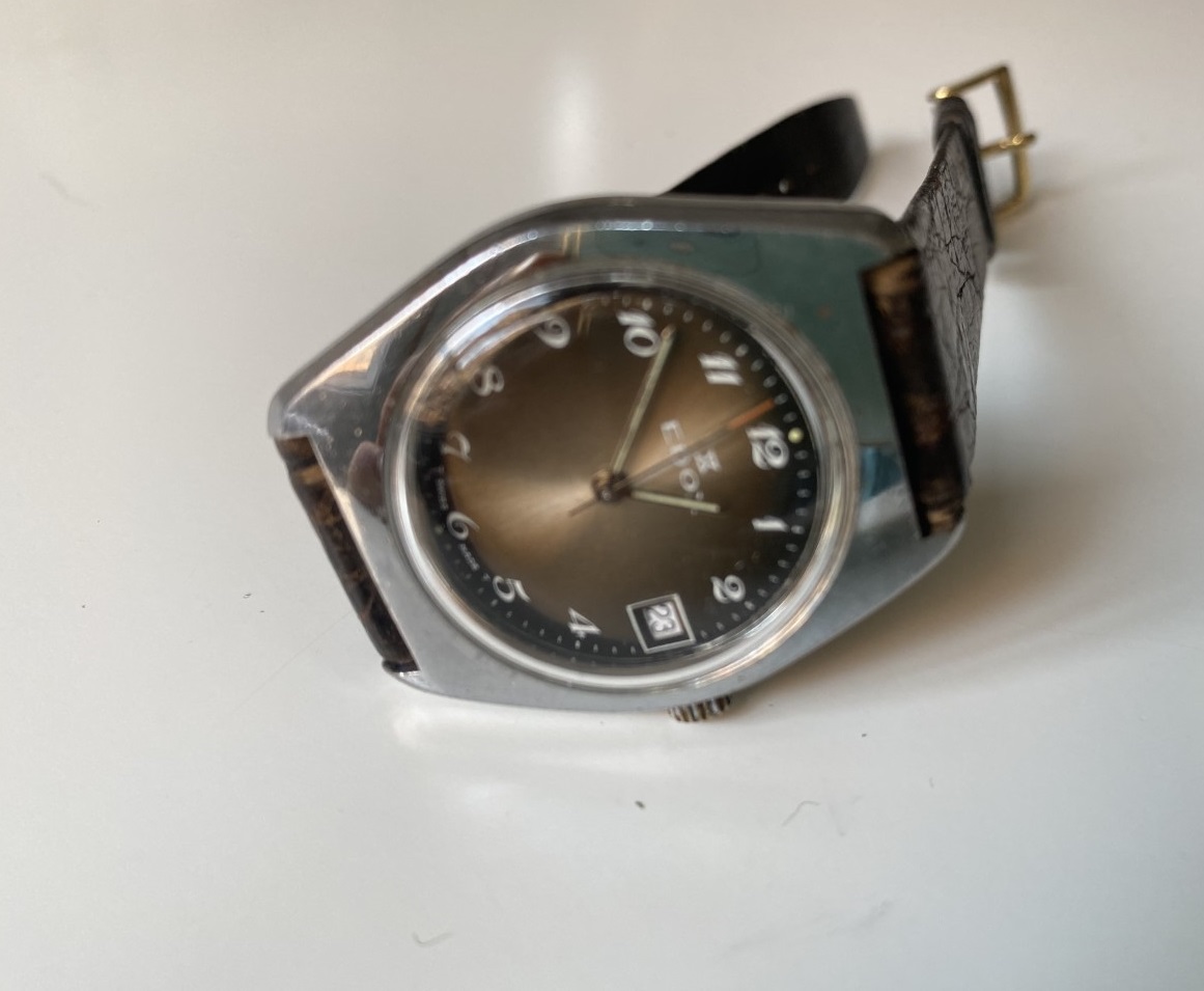Edox. Acero y metal. Calendario. Cuerda manual. Correa. 1970. Suiza