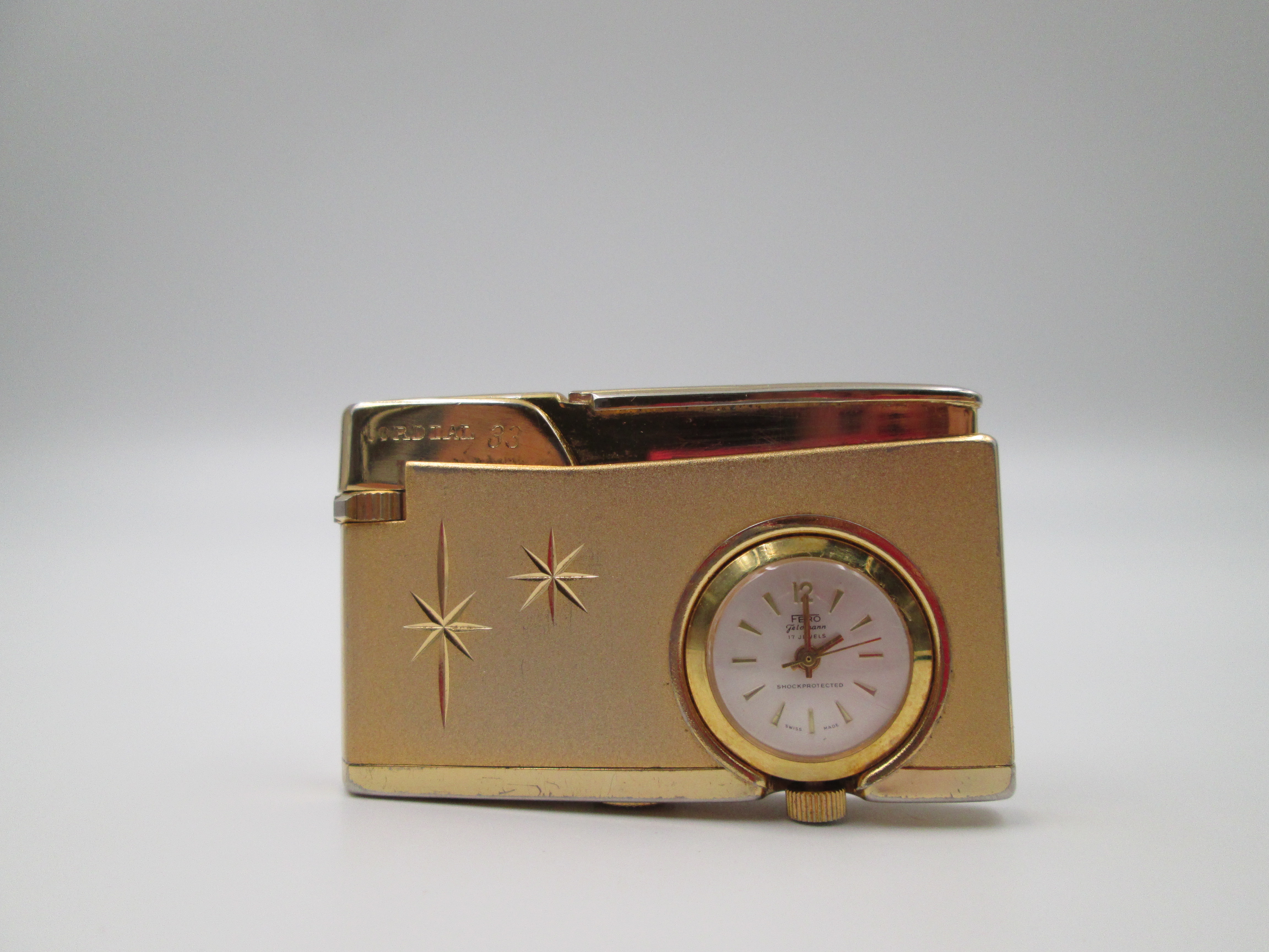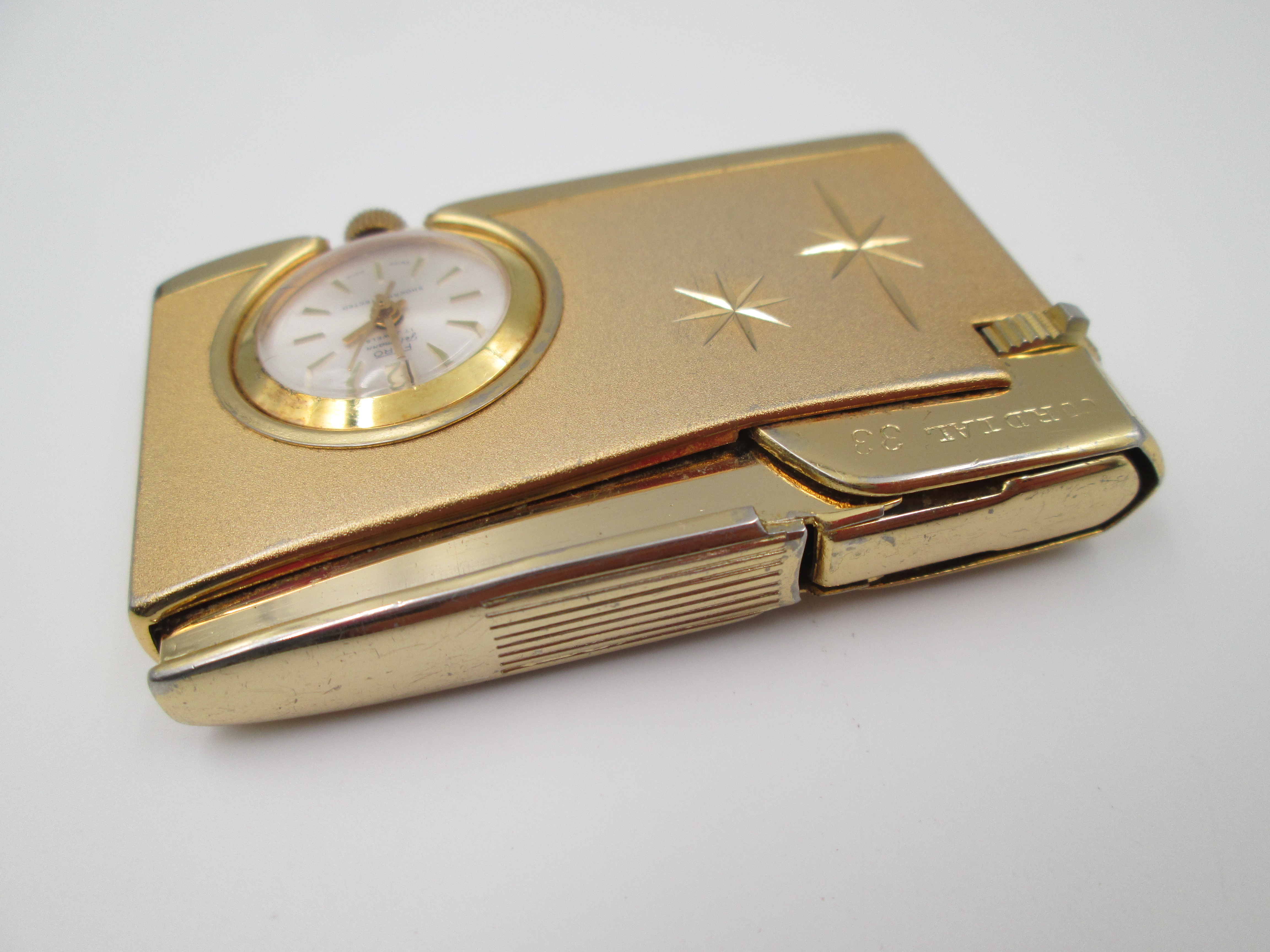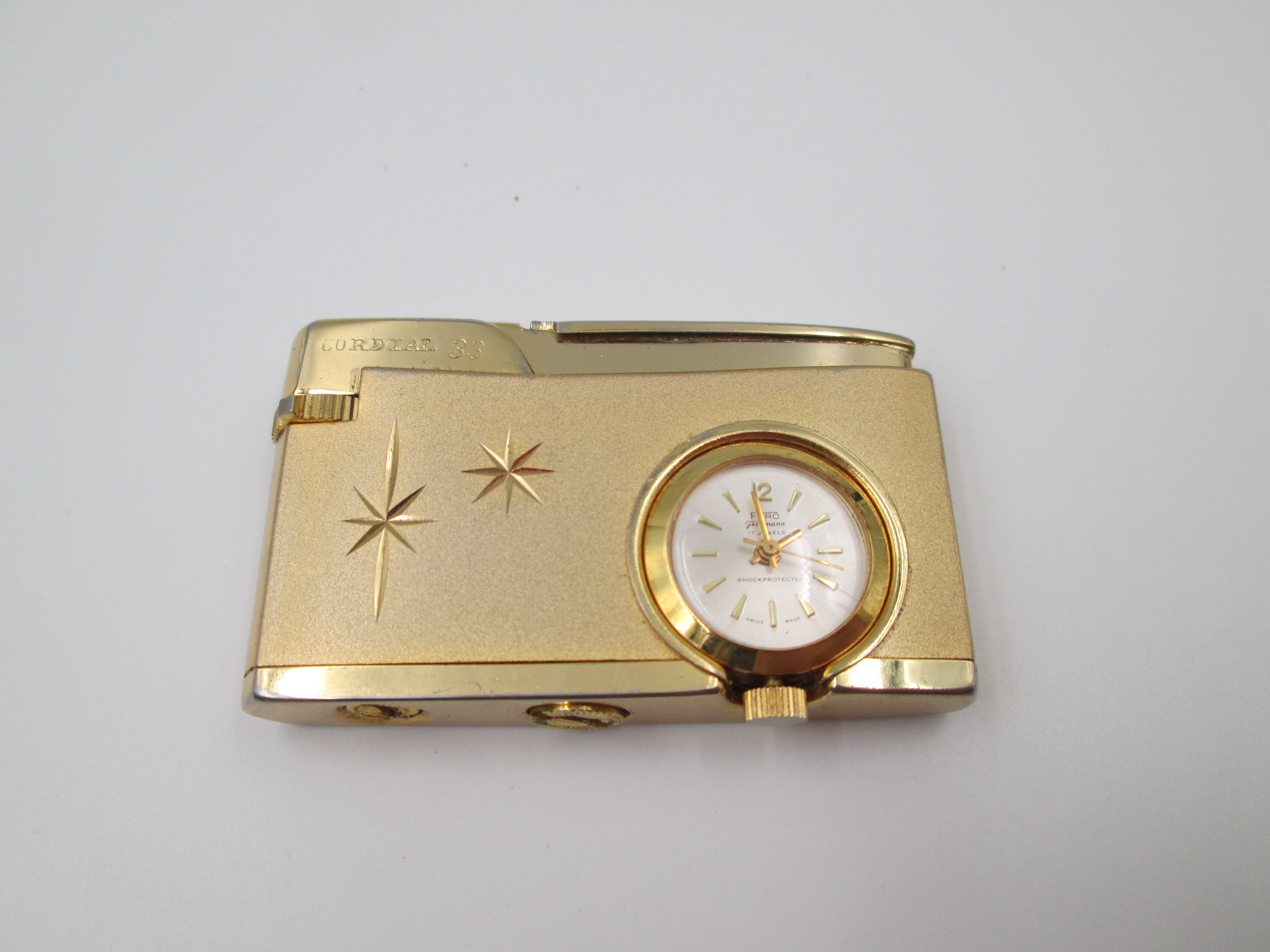 Encendedor a gas Cordial 33 con reloj mecánico Fero. Metal chapado oro. Suiza. 1960