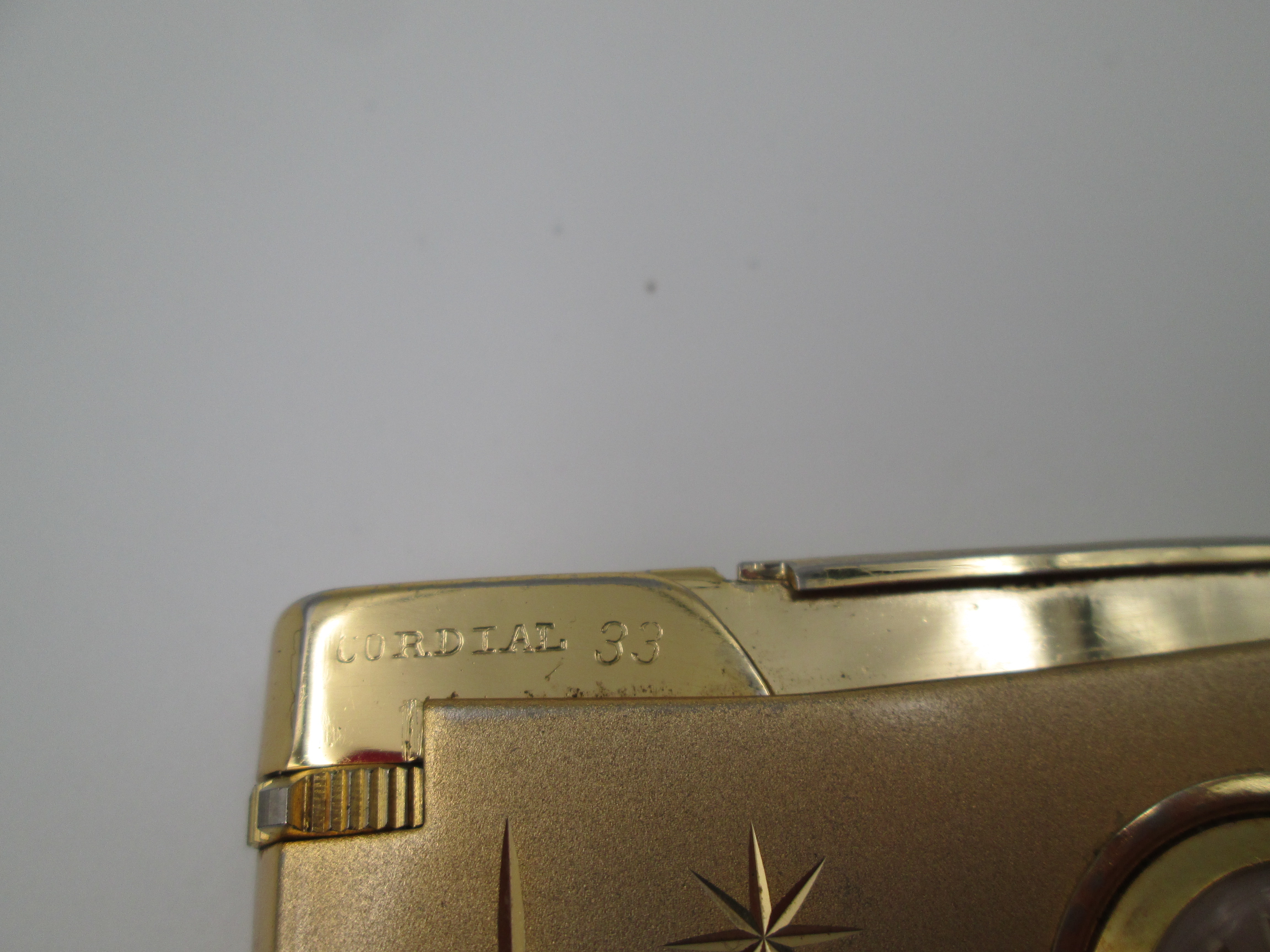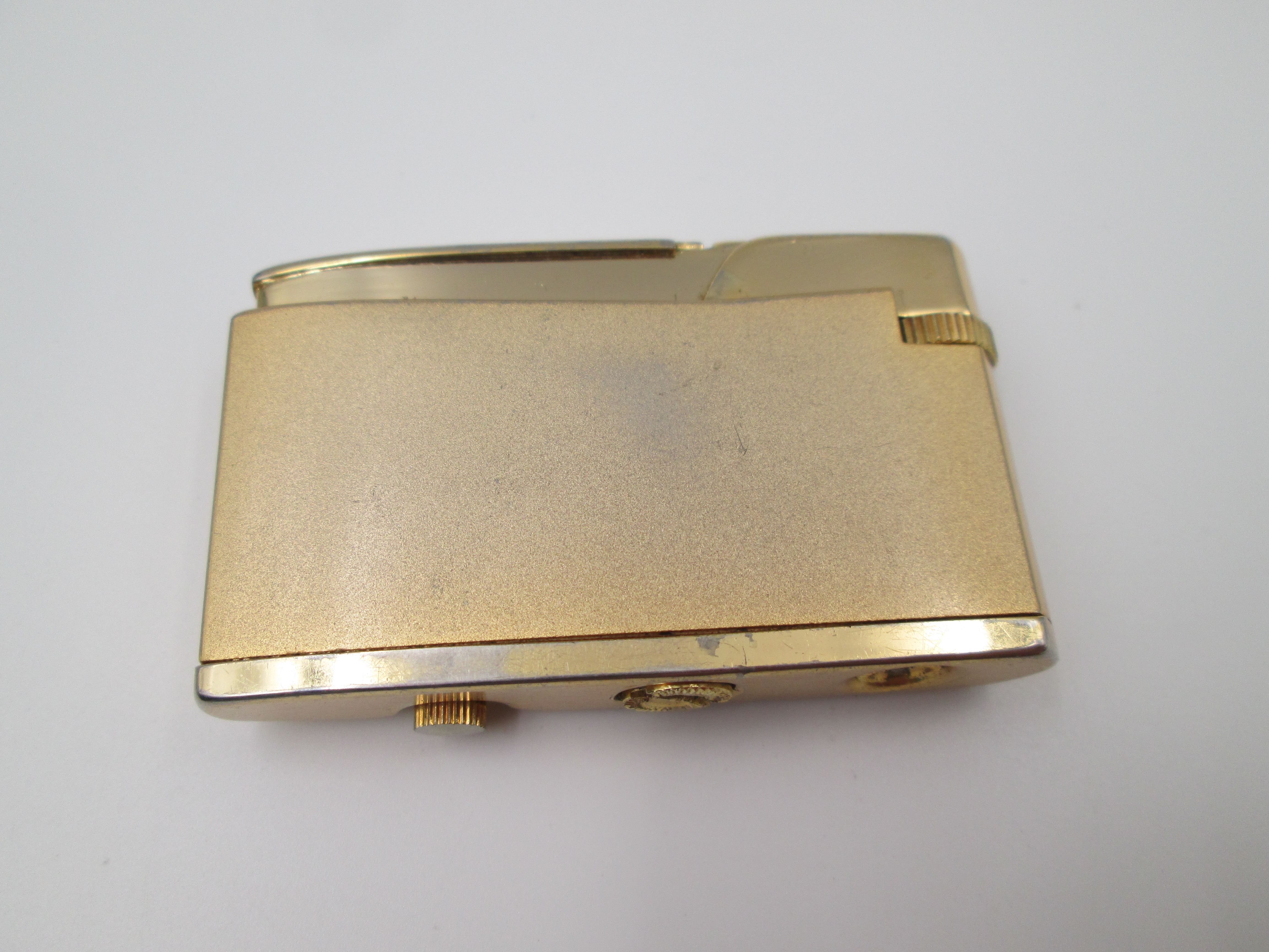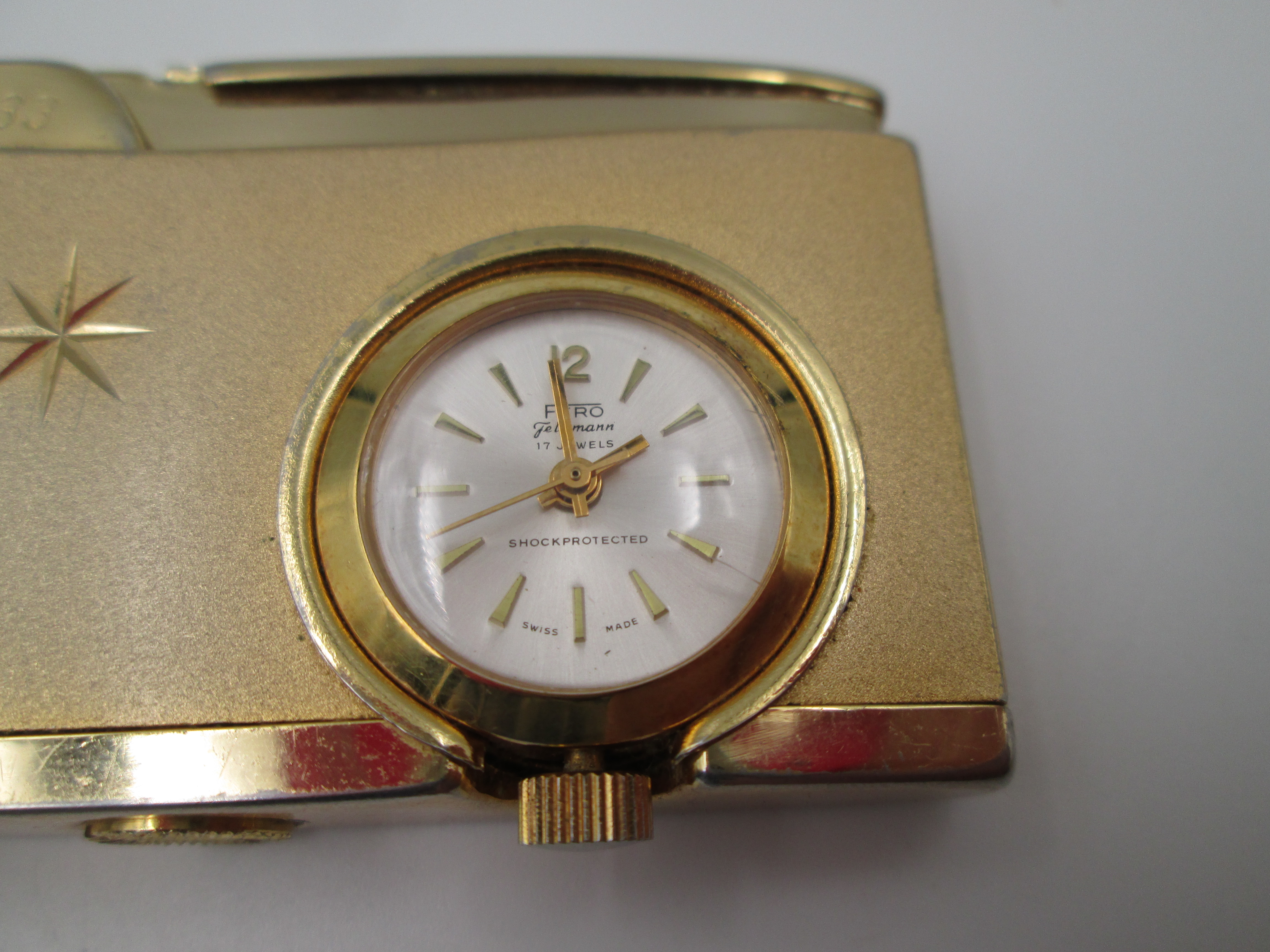 Encendedor a gas Cordial 33 con reloj mecánico Fero. Metal chapado oro. Suiza. 1960