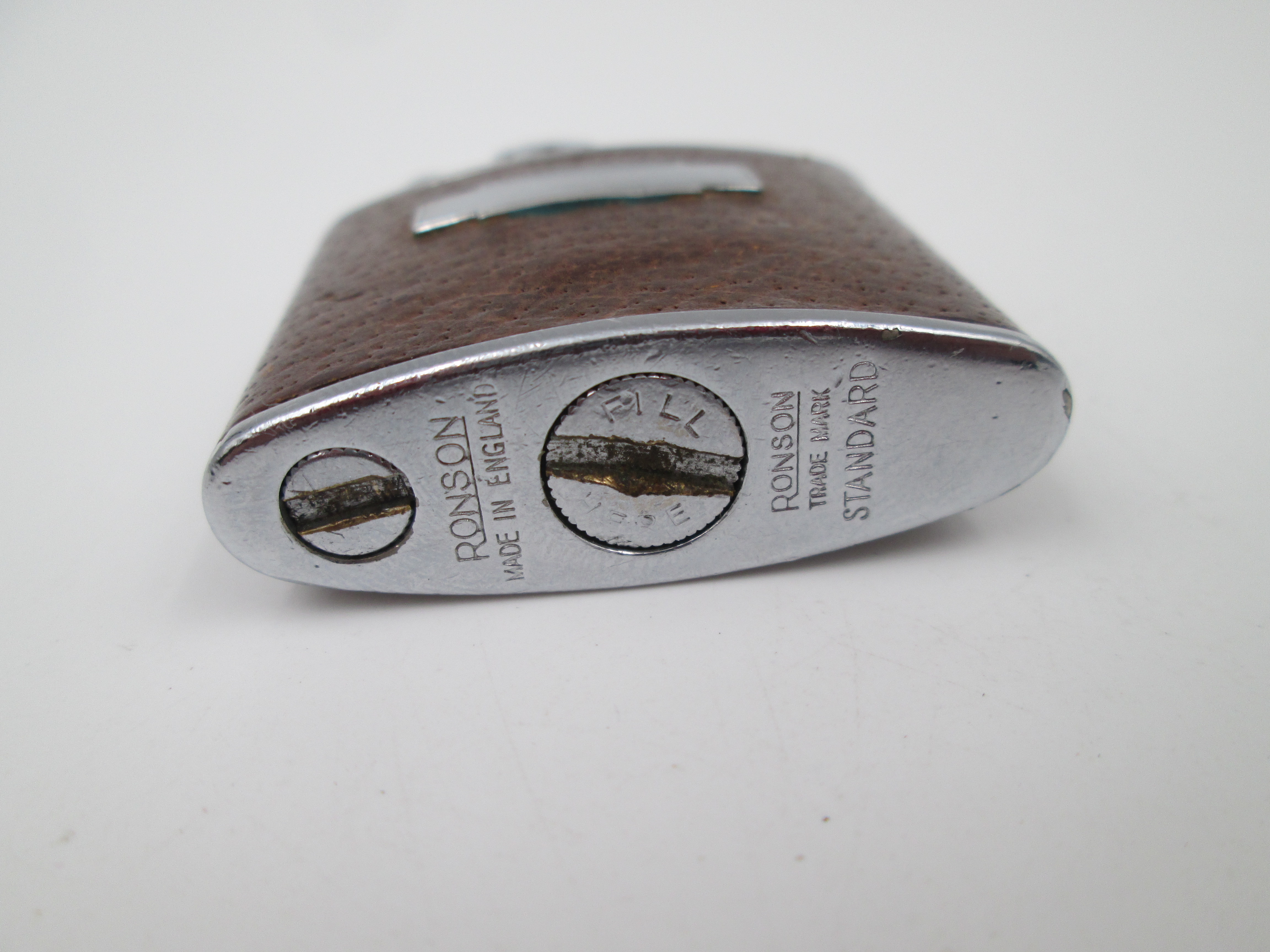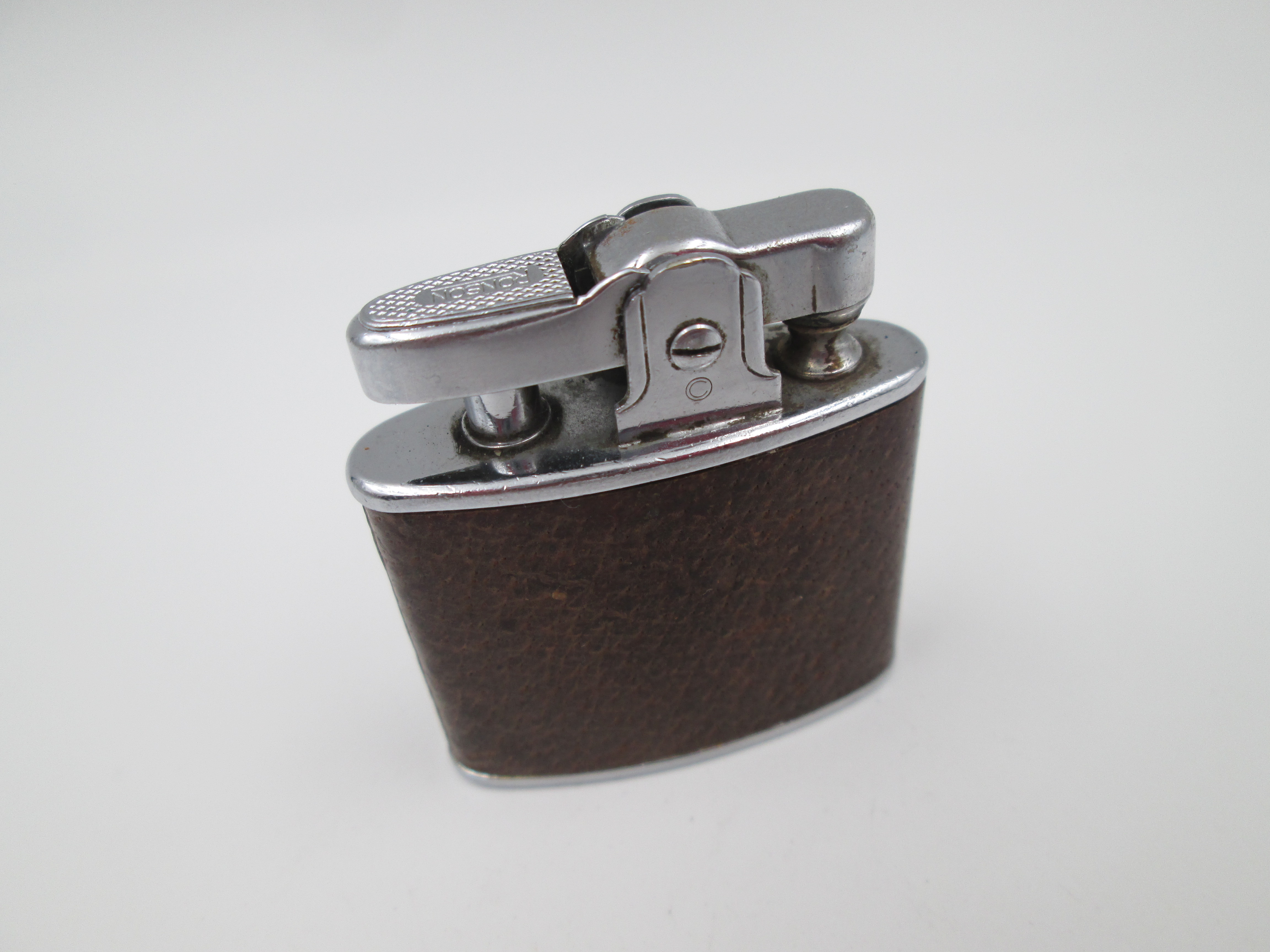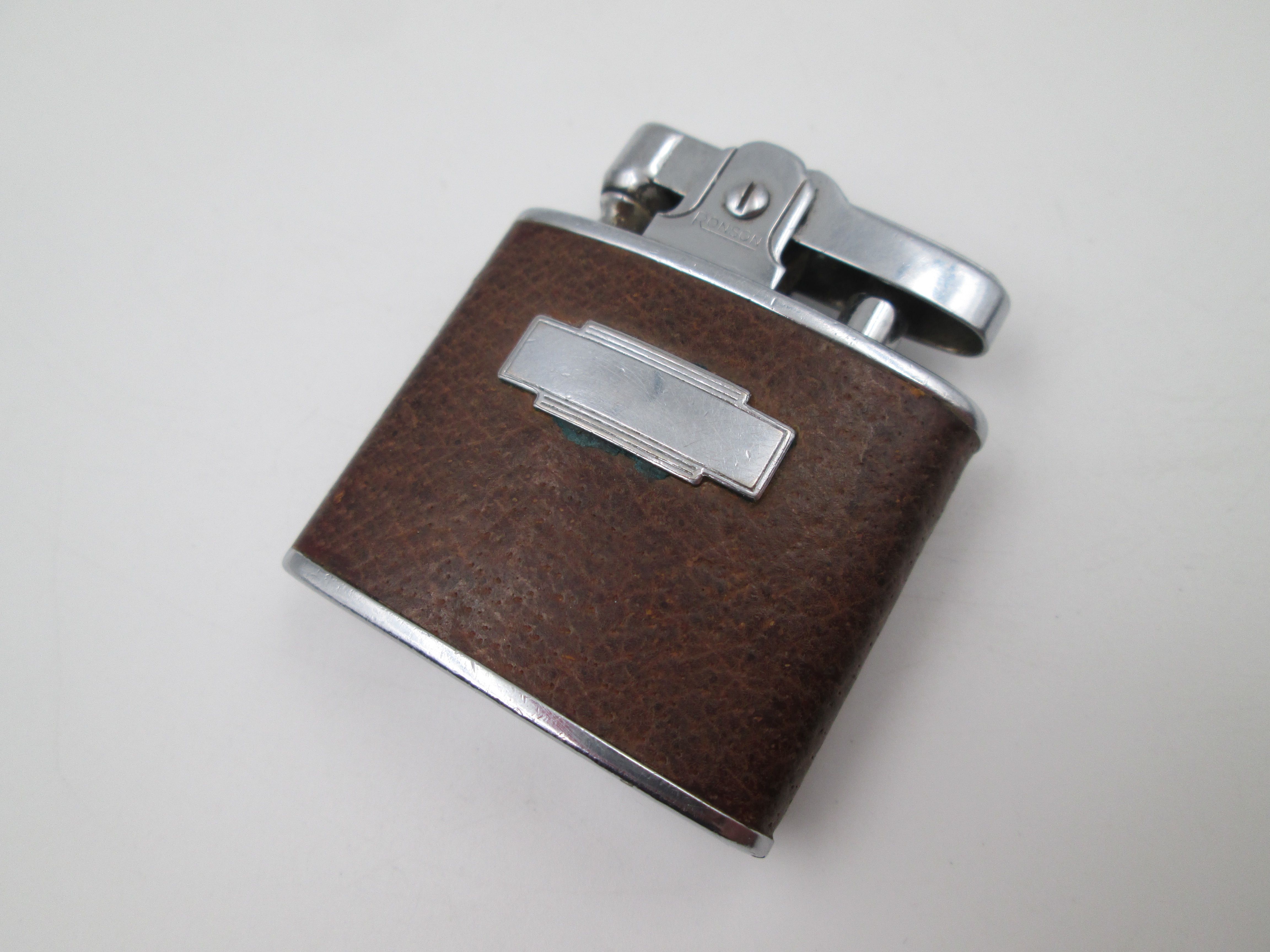 Encendedor de bolsillo a gasolina Ronson Standard. Metal cromado y piel. 1940