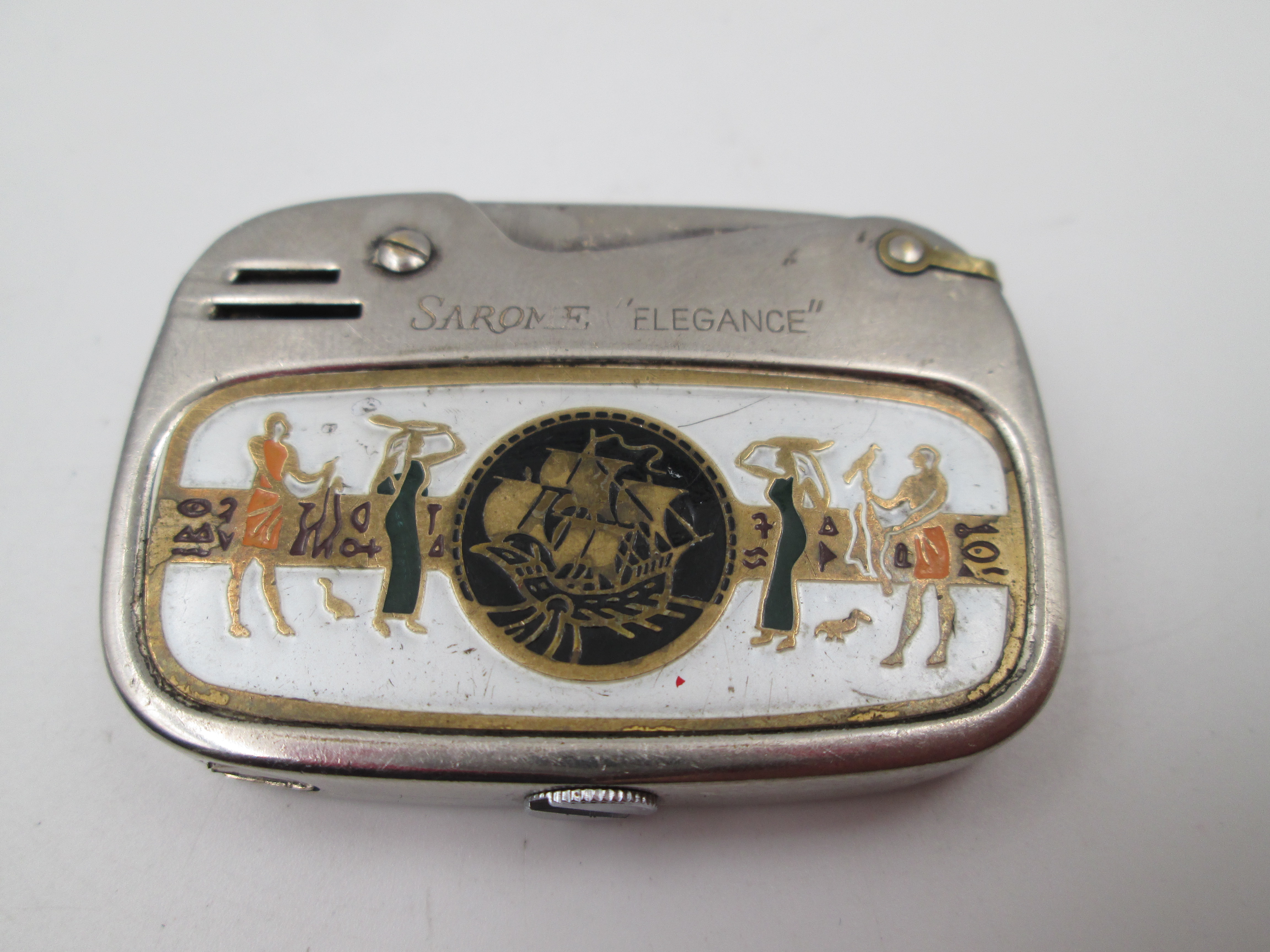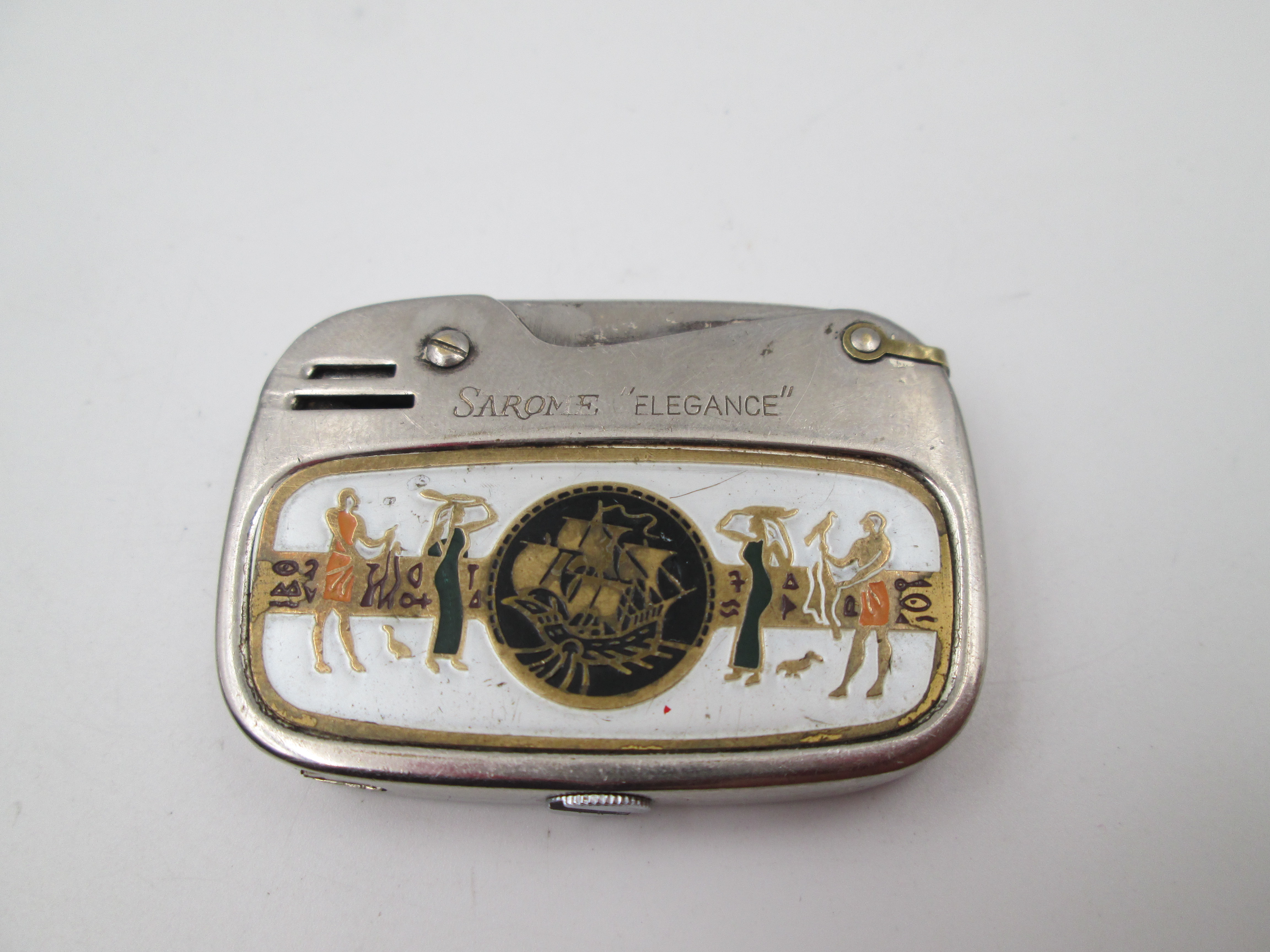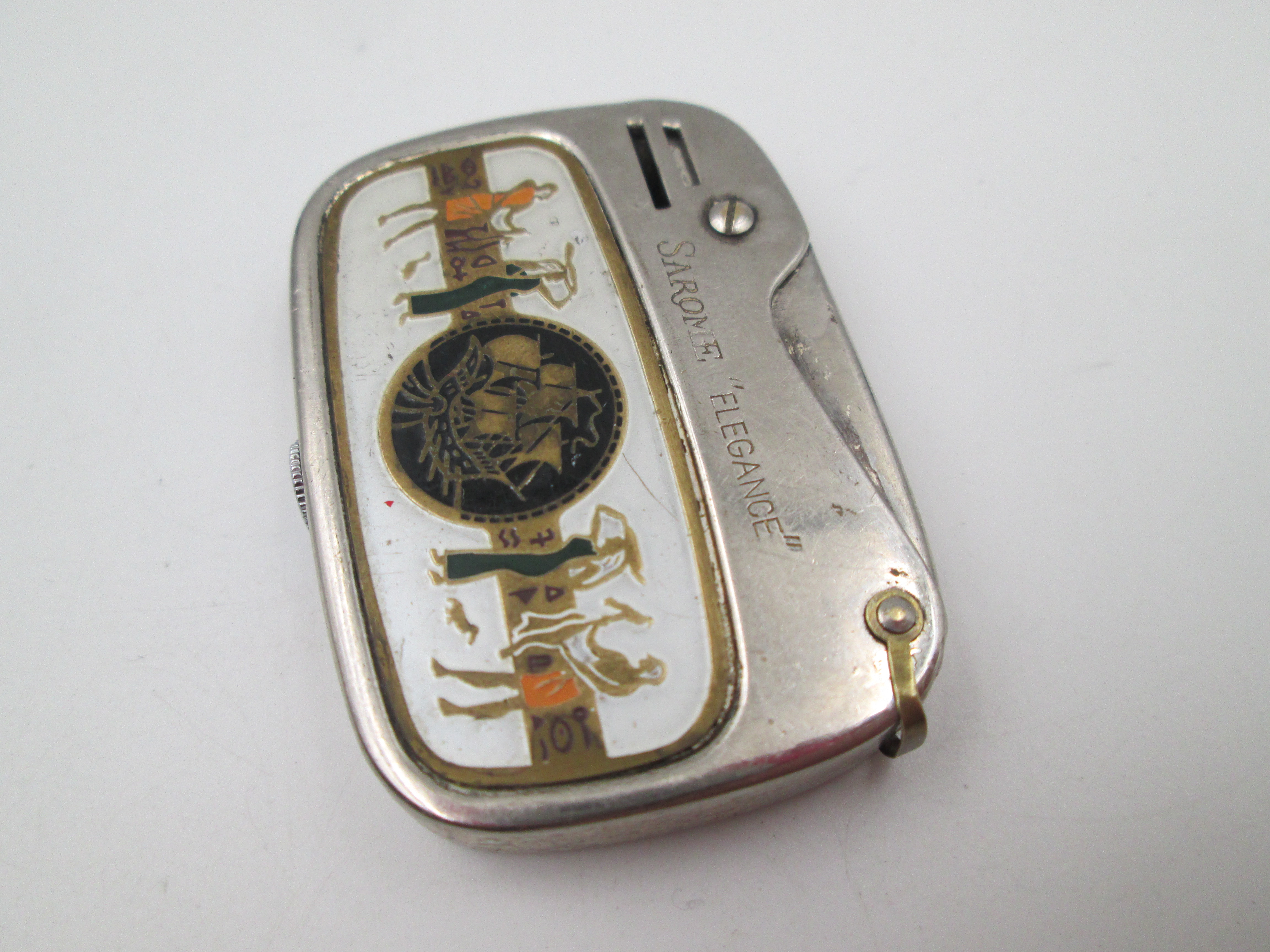 La unidad, realizada por la prestigiosa marca Sarome, corresponde al modelo Elegance y viene acabada en latón plateado y decorada en el frontal con una escena egipcia en esmalte de colores.