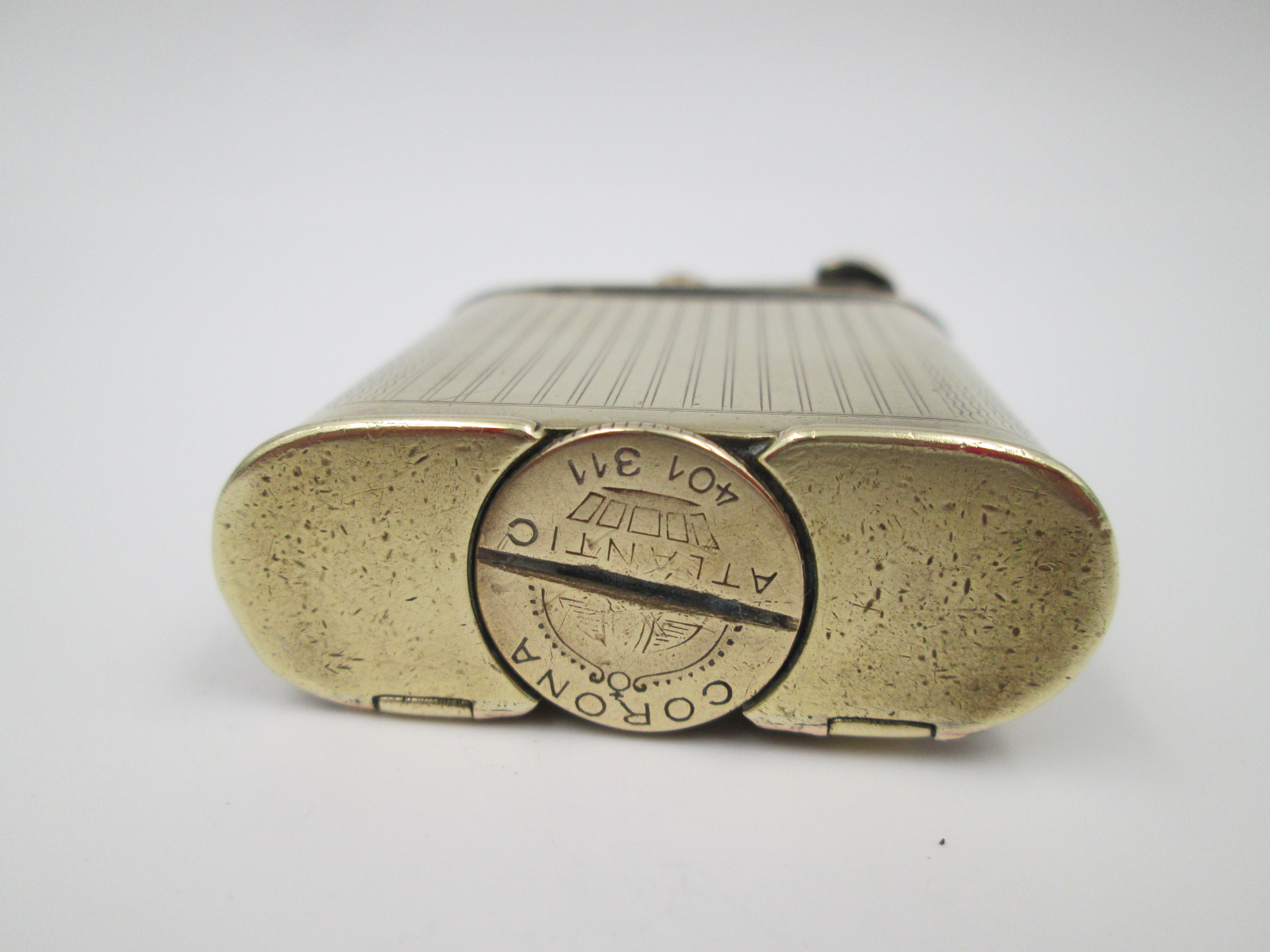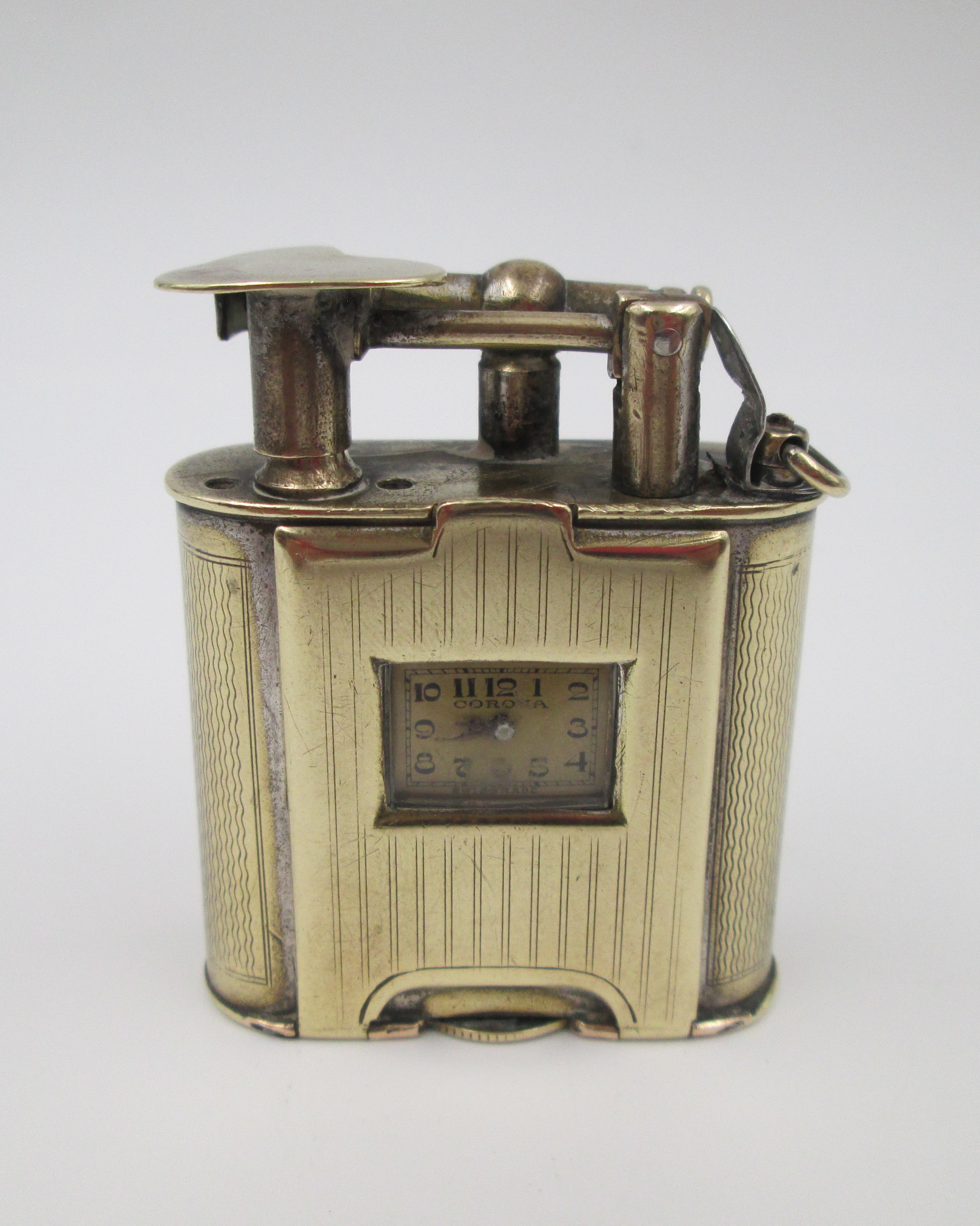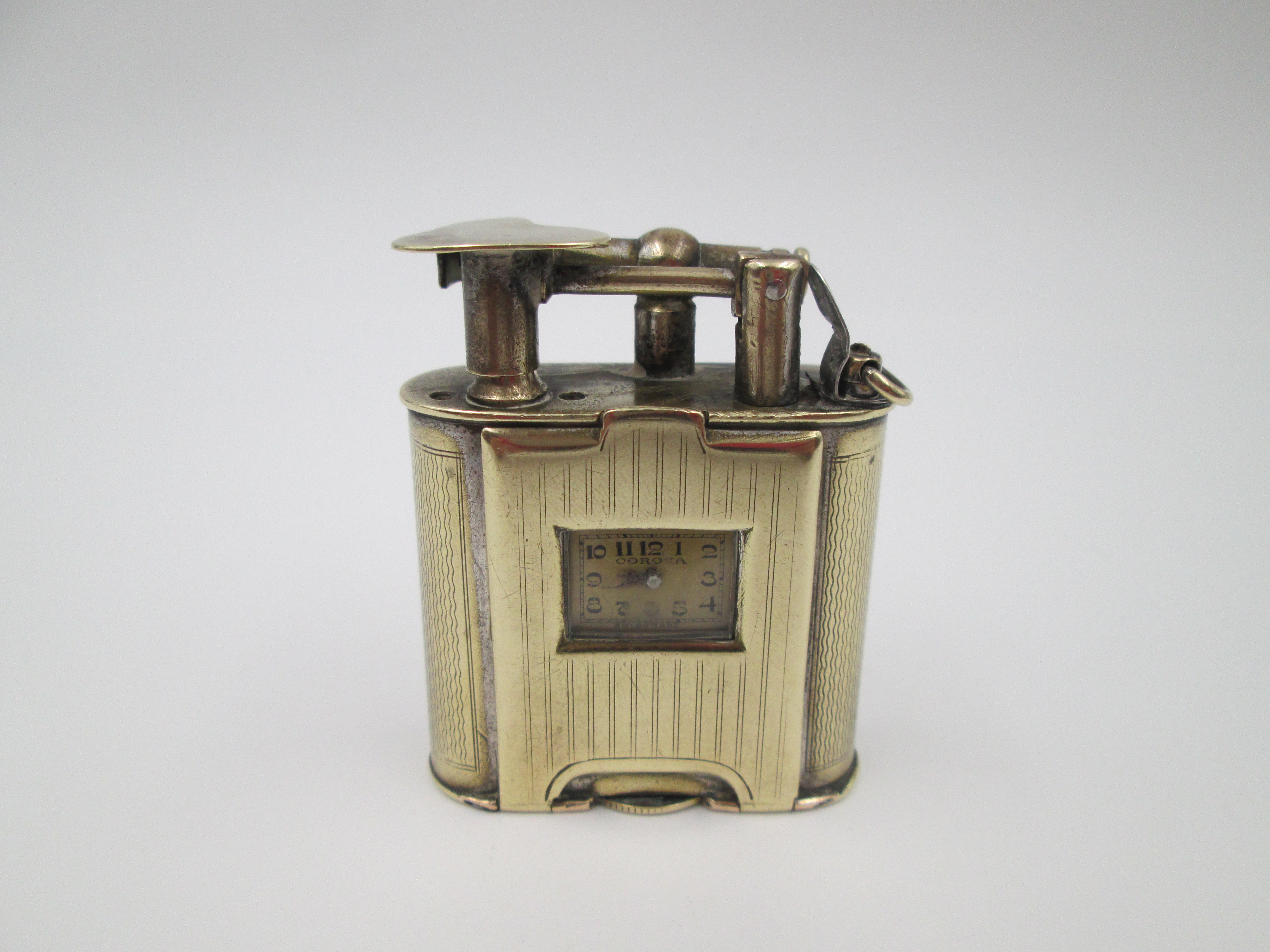 Encendedor de gasolina Corona con reloj mecánico Atlantic. Metal dorado. 1940