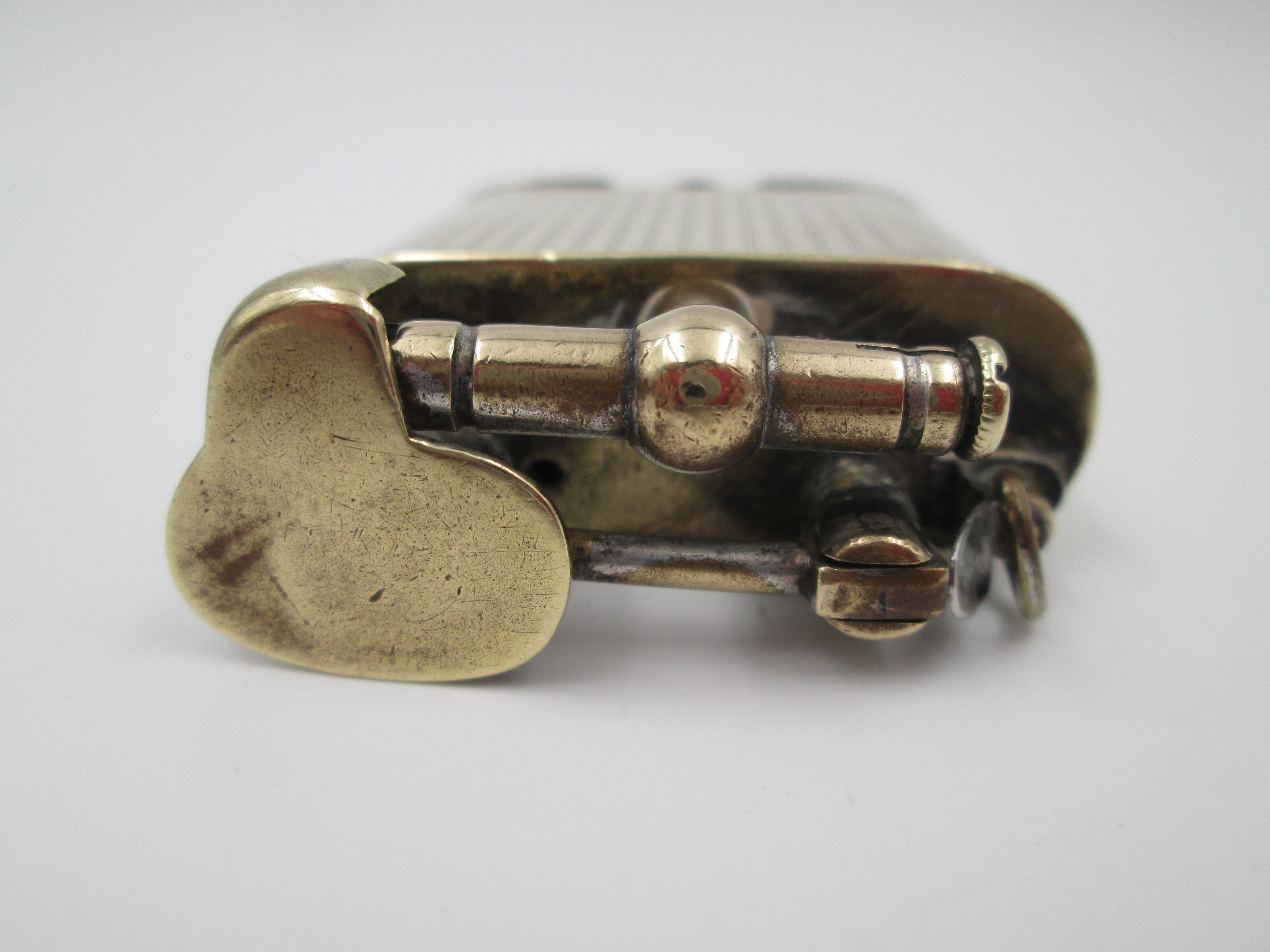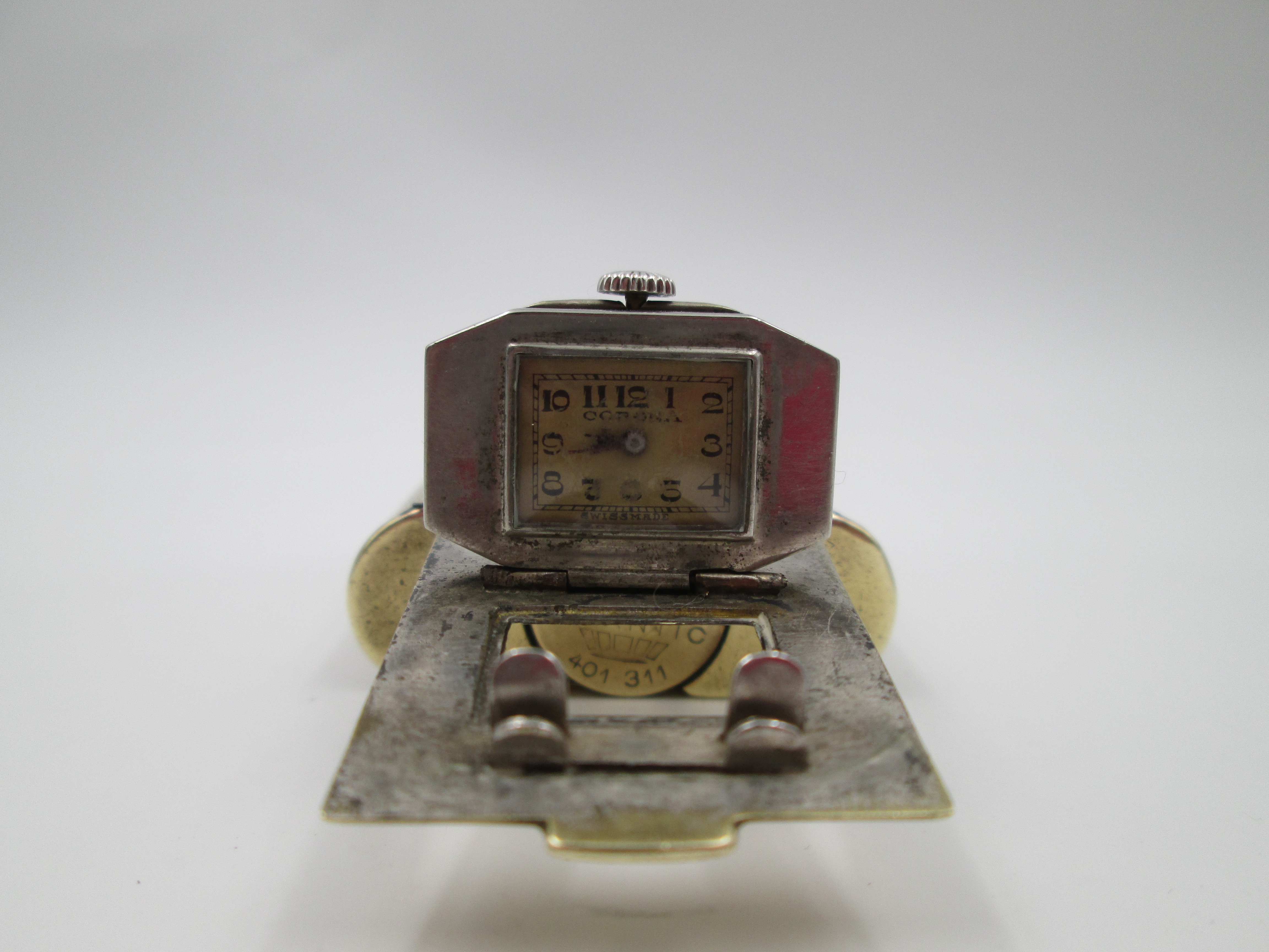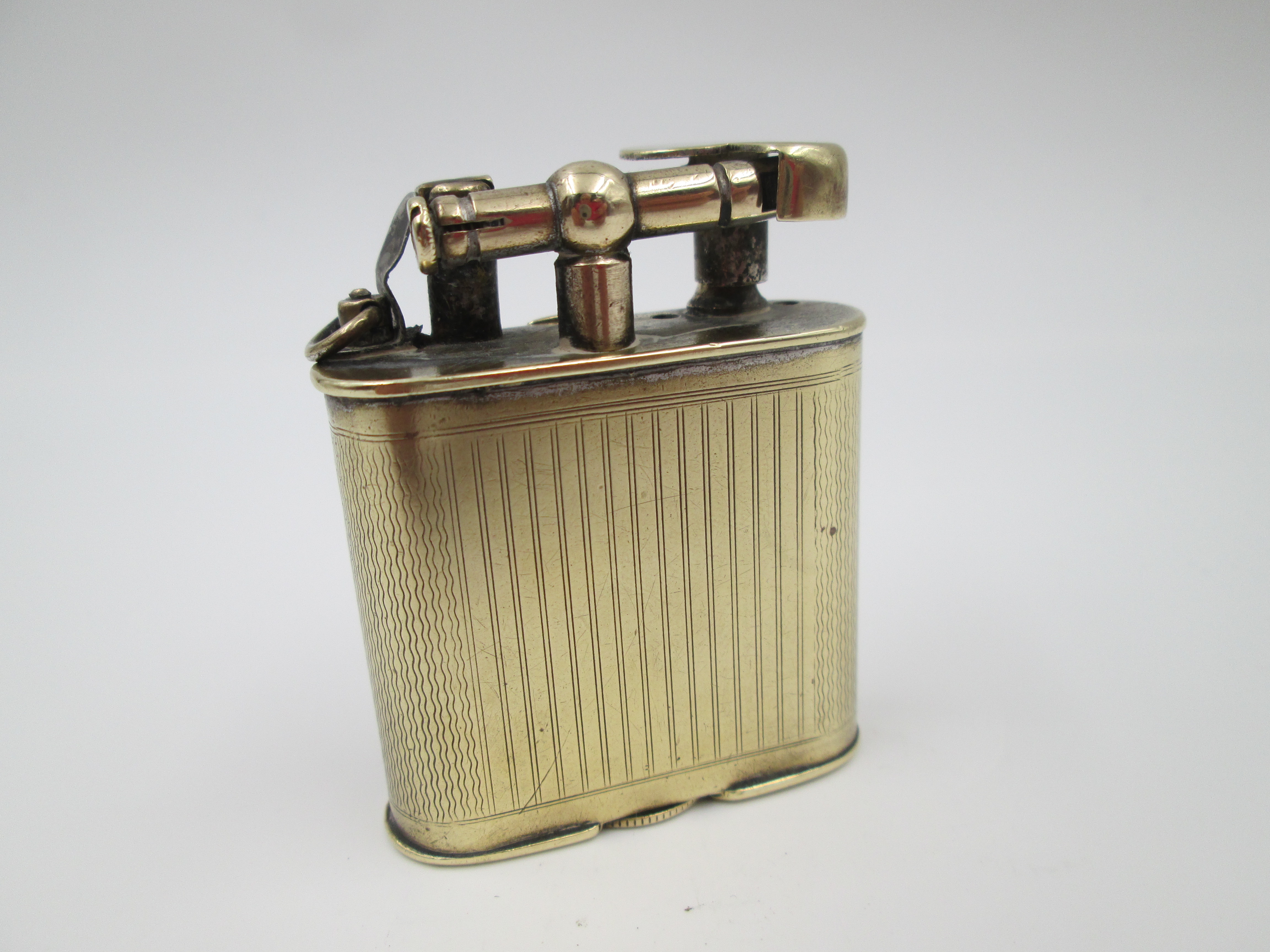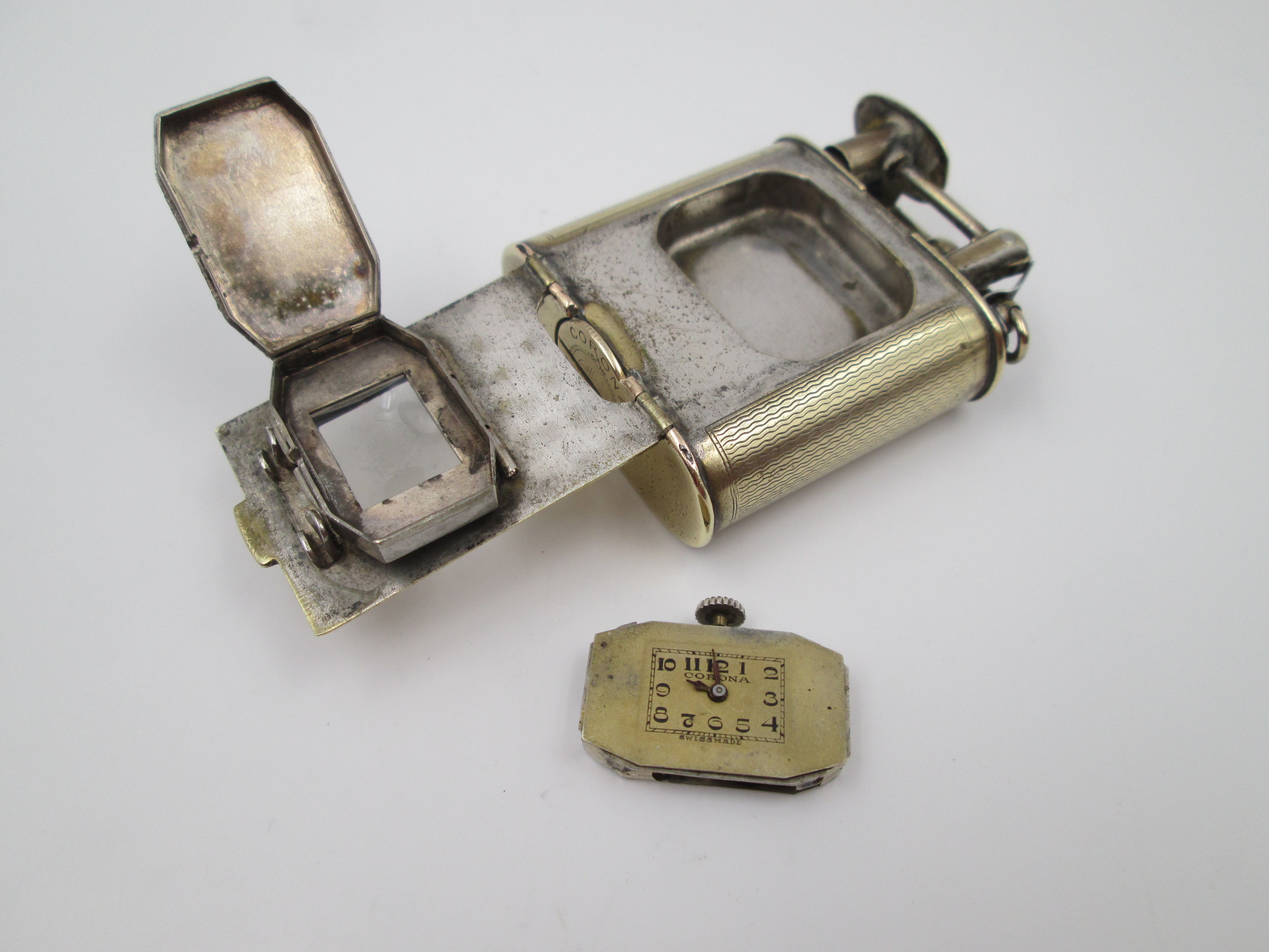 Encendedor de gasolina Corona con reloj mecánico Atlantic. Metal dorado. 1940