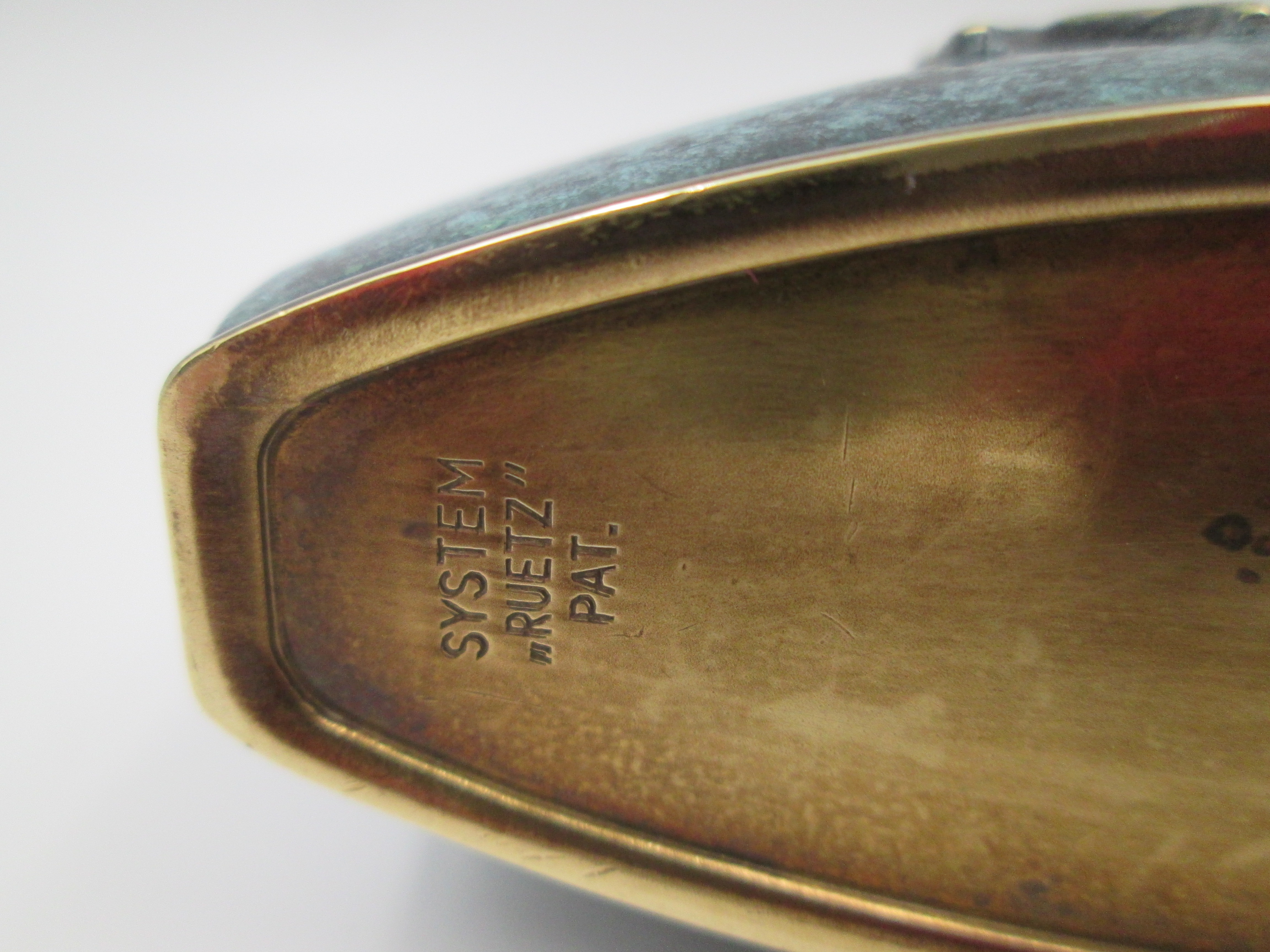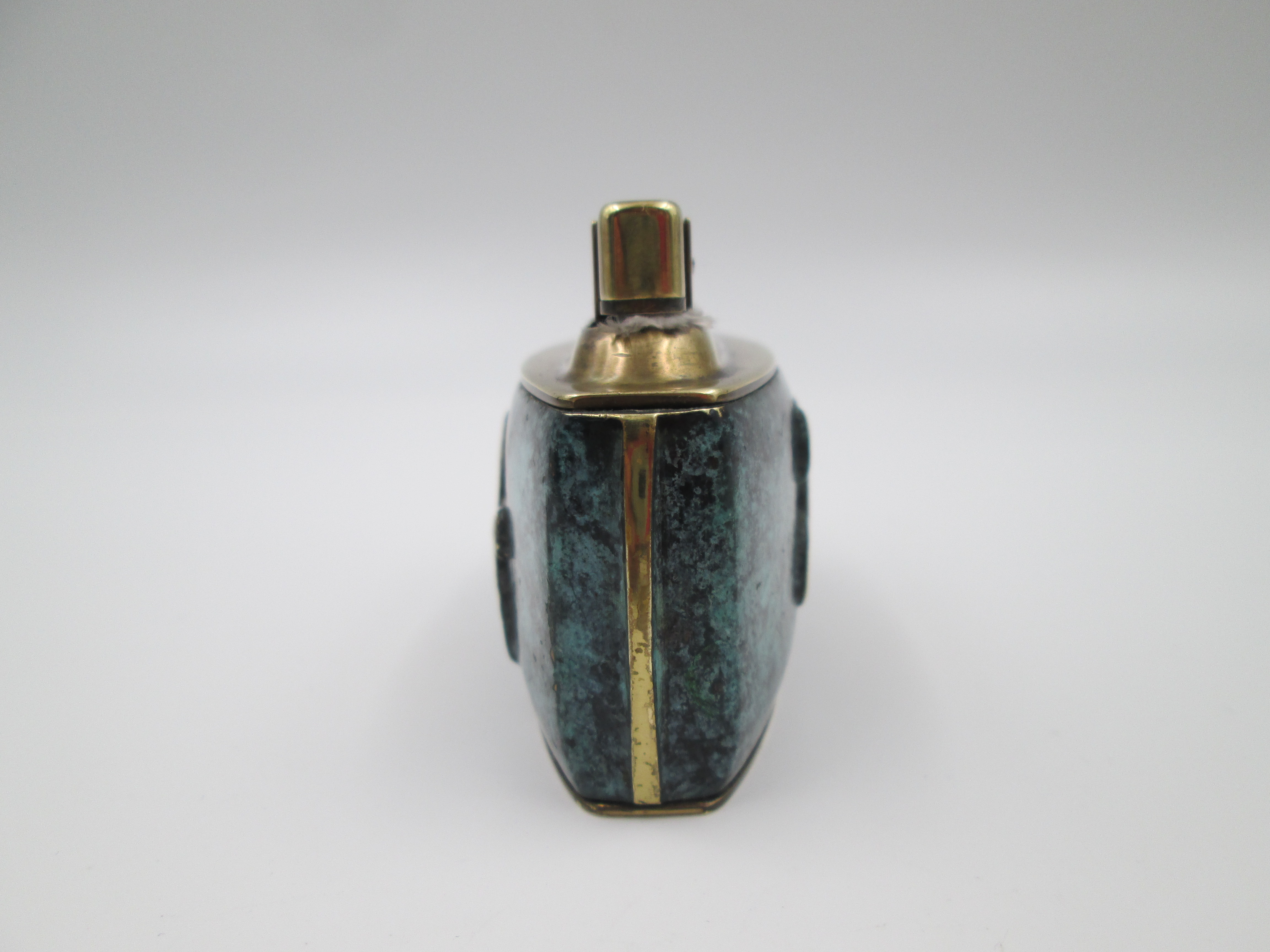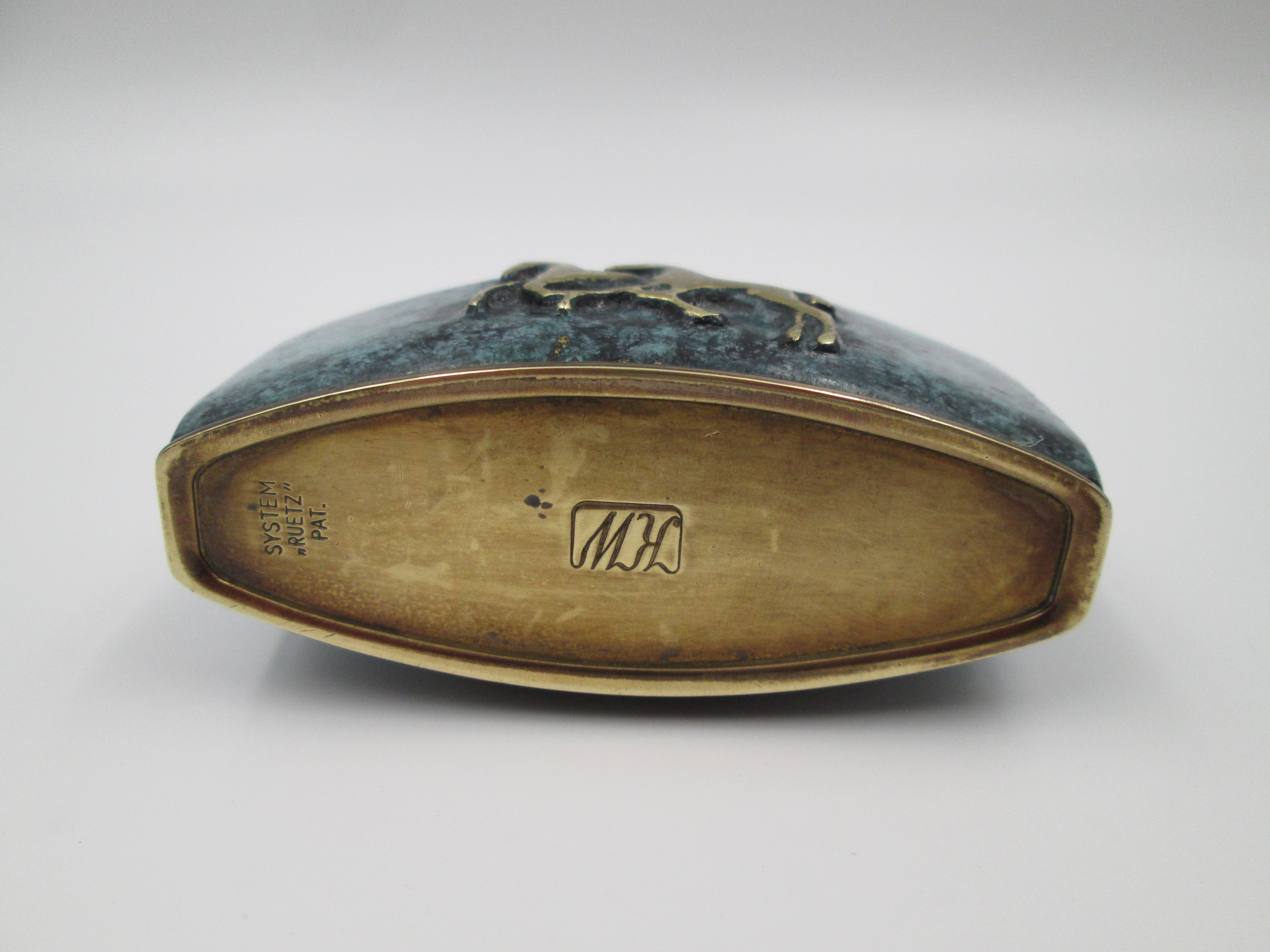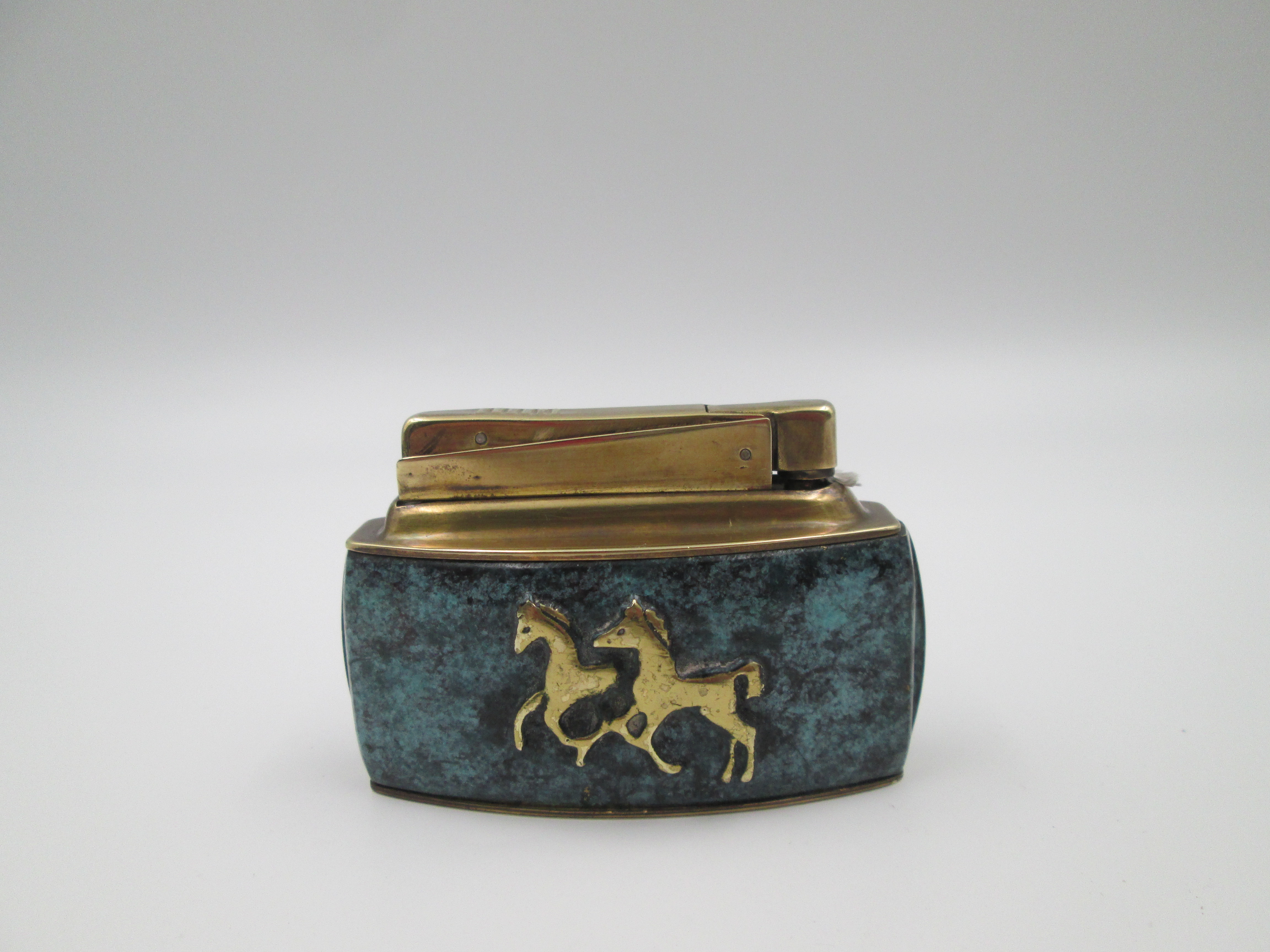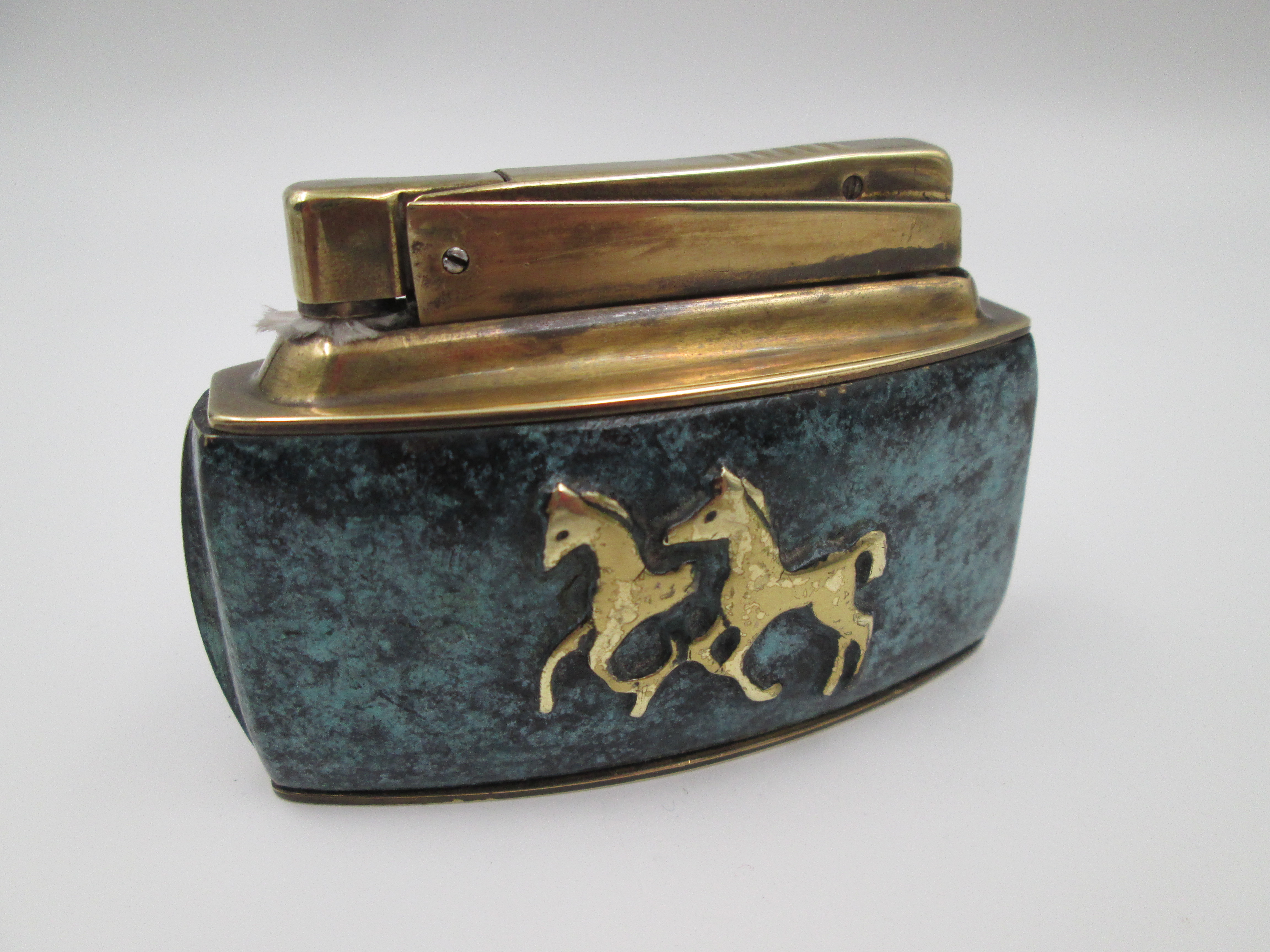Encendedor de gasolina Karl Wieden. Bronce y malaquita. Motivo de caballos. Alemania. 1930
