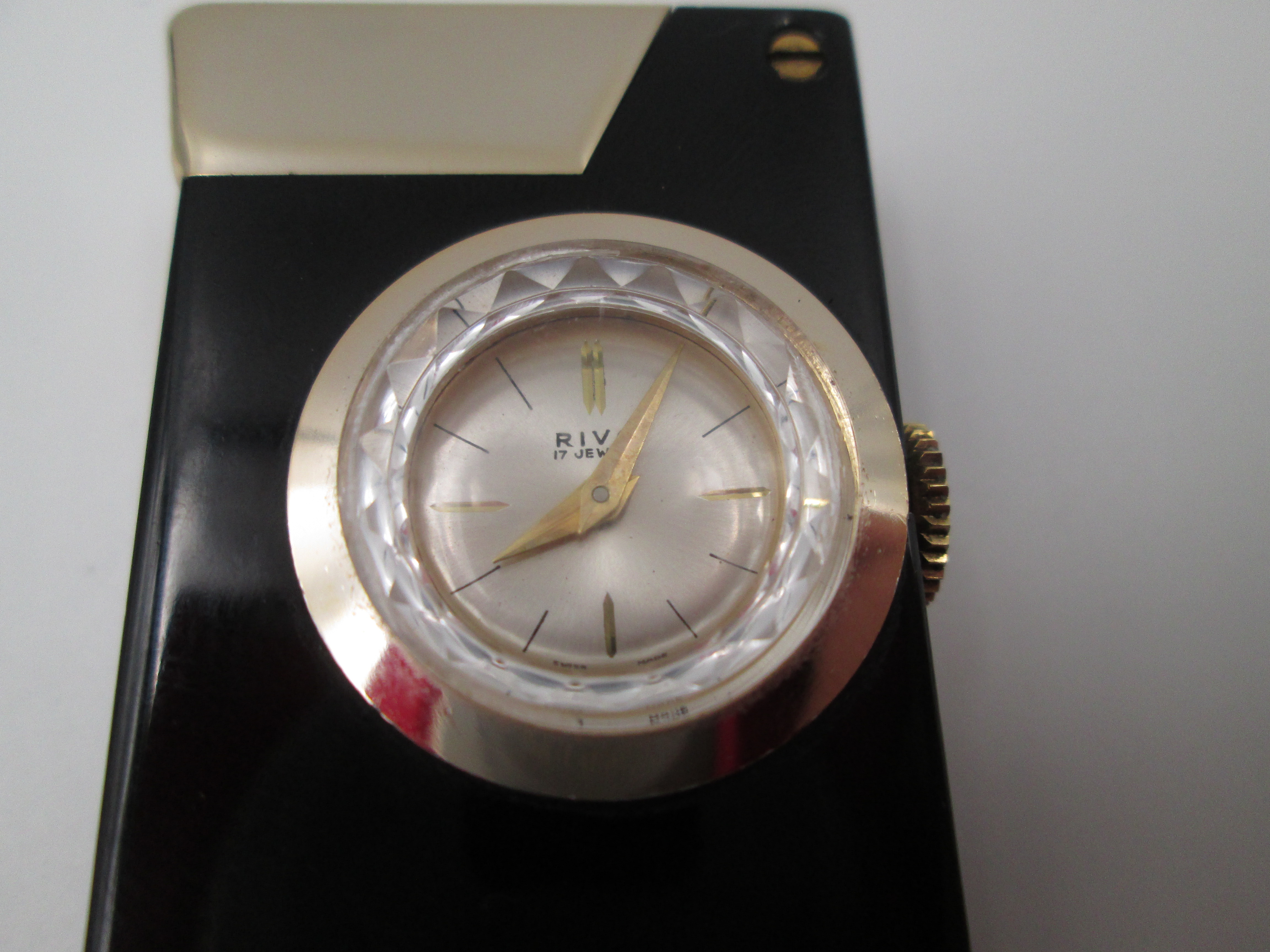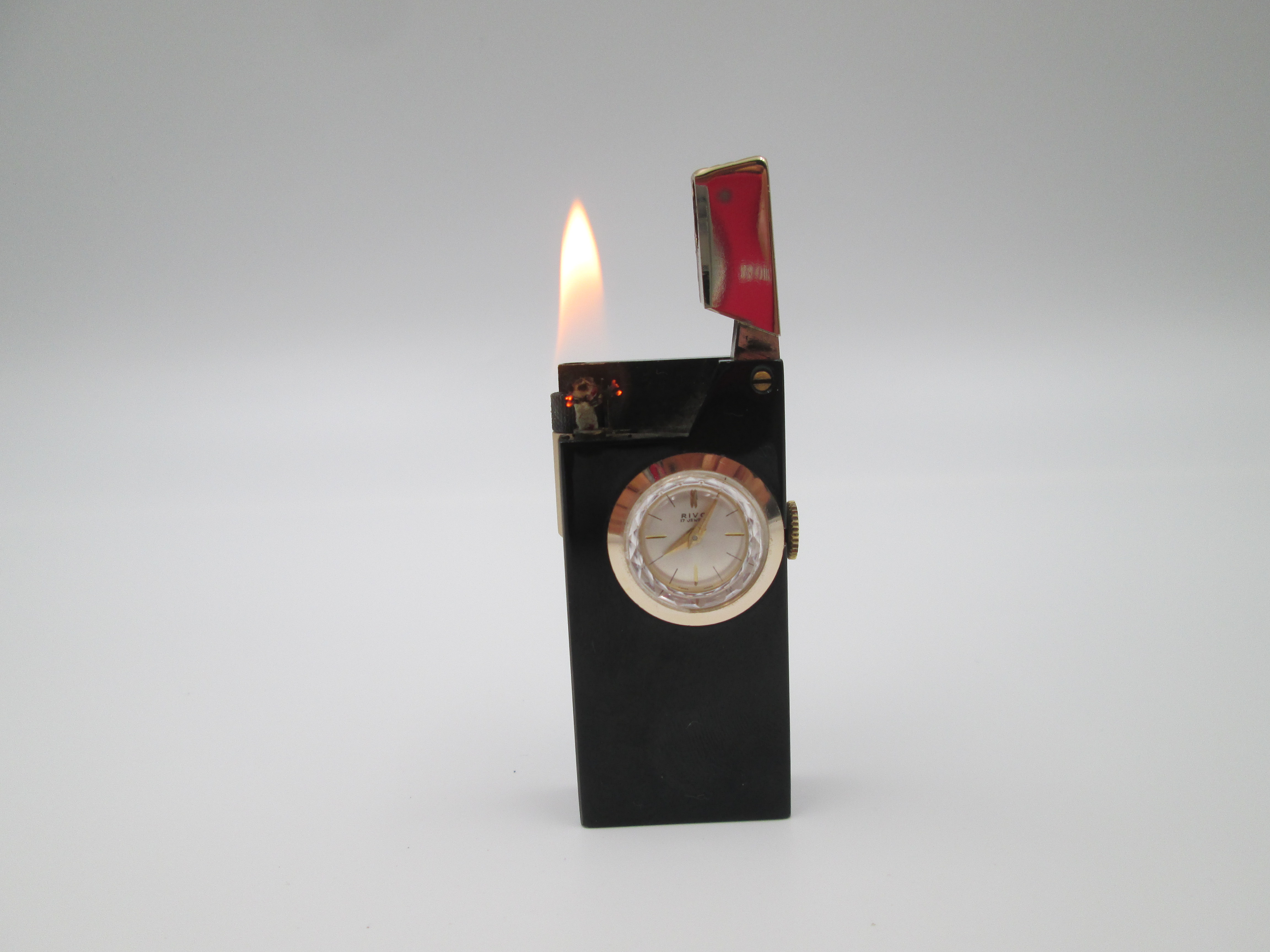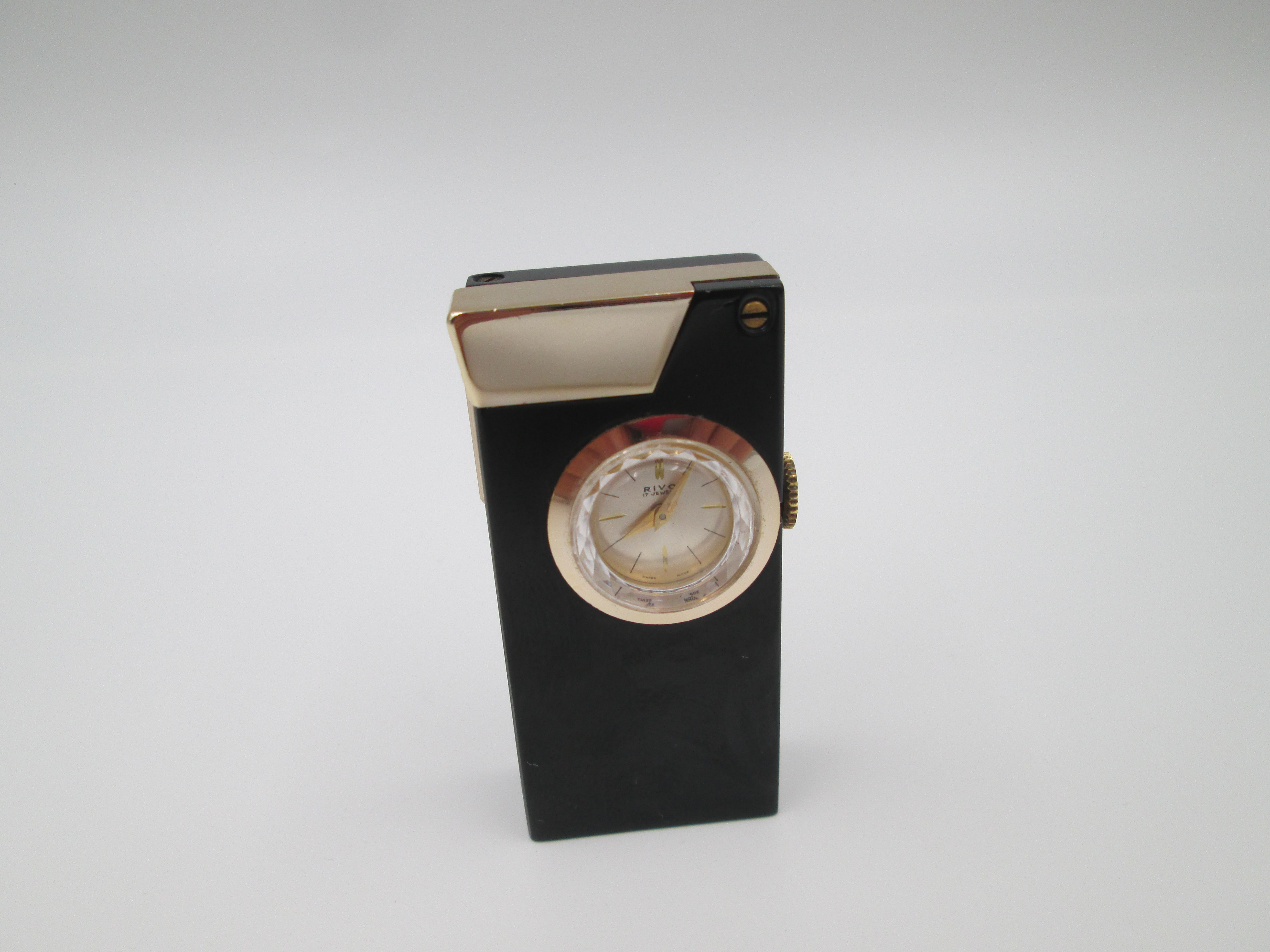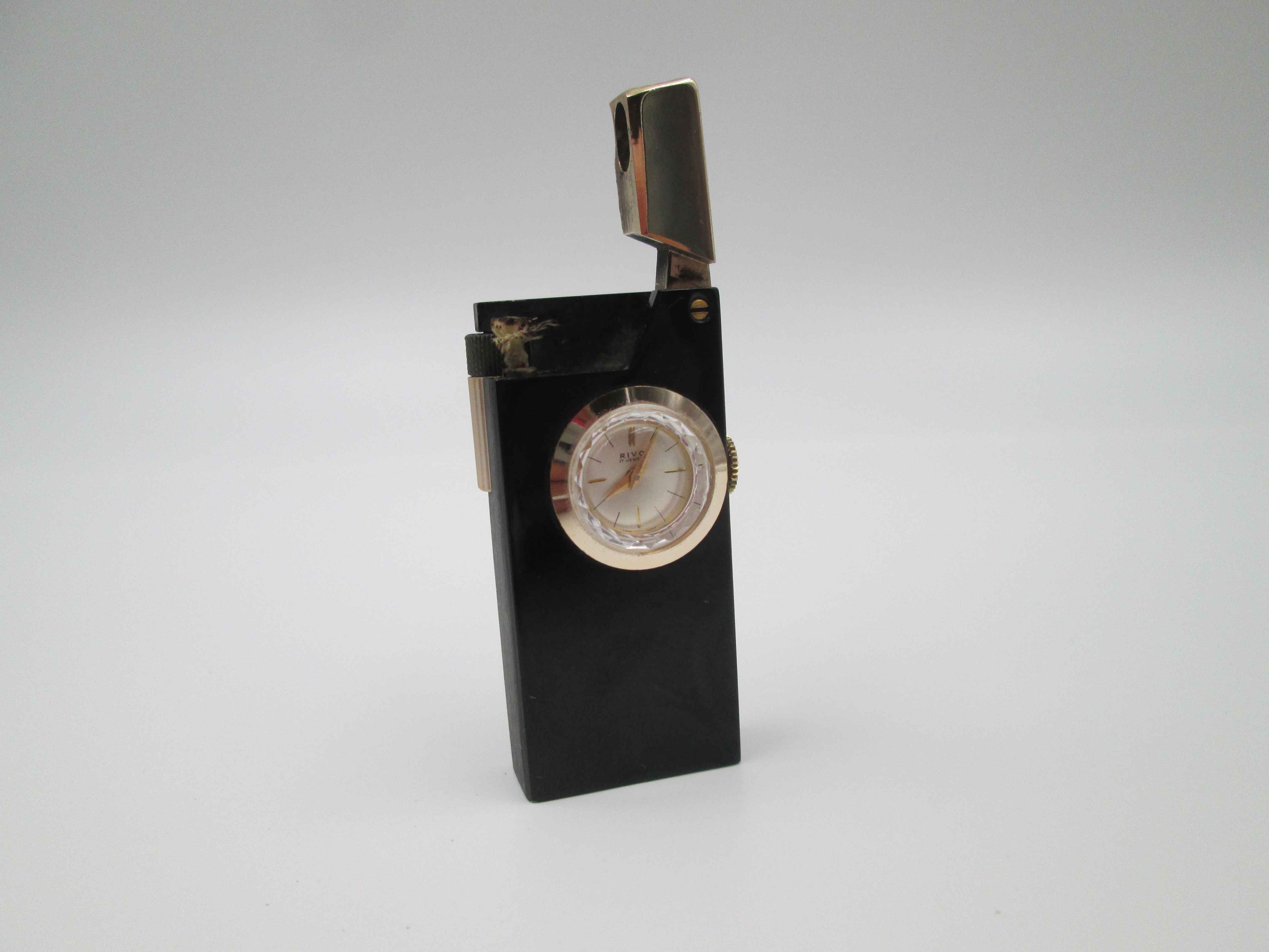 Encendedor gasolina / reloj mecánico Rivo. Metal lacado negro y chapado oro. Suiza. 1960