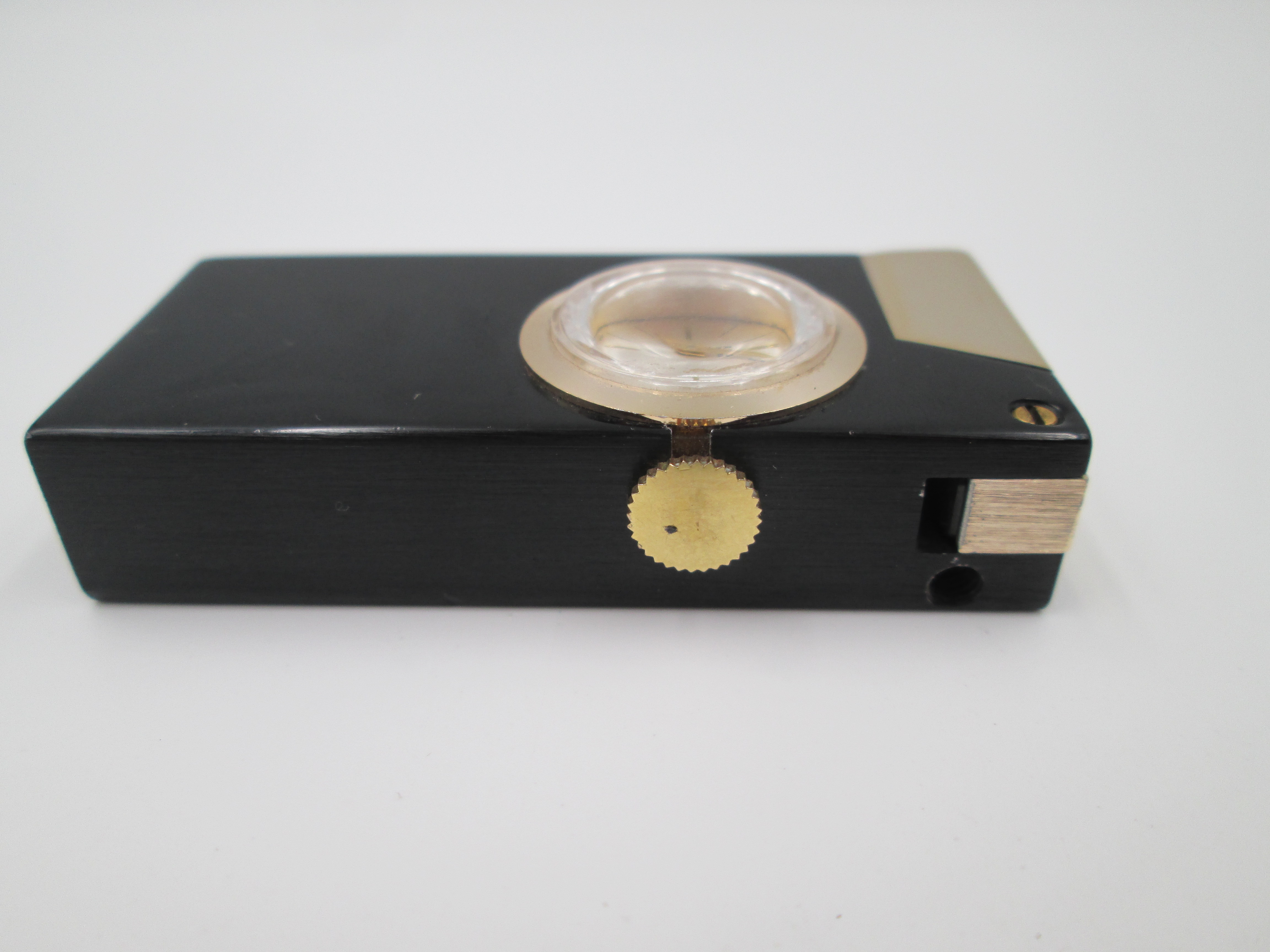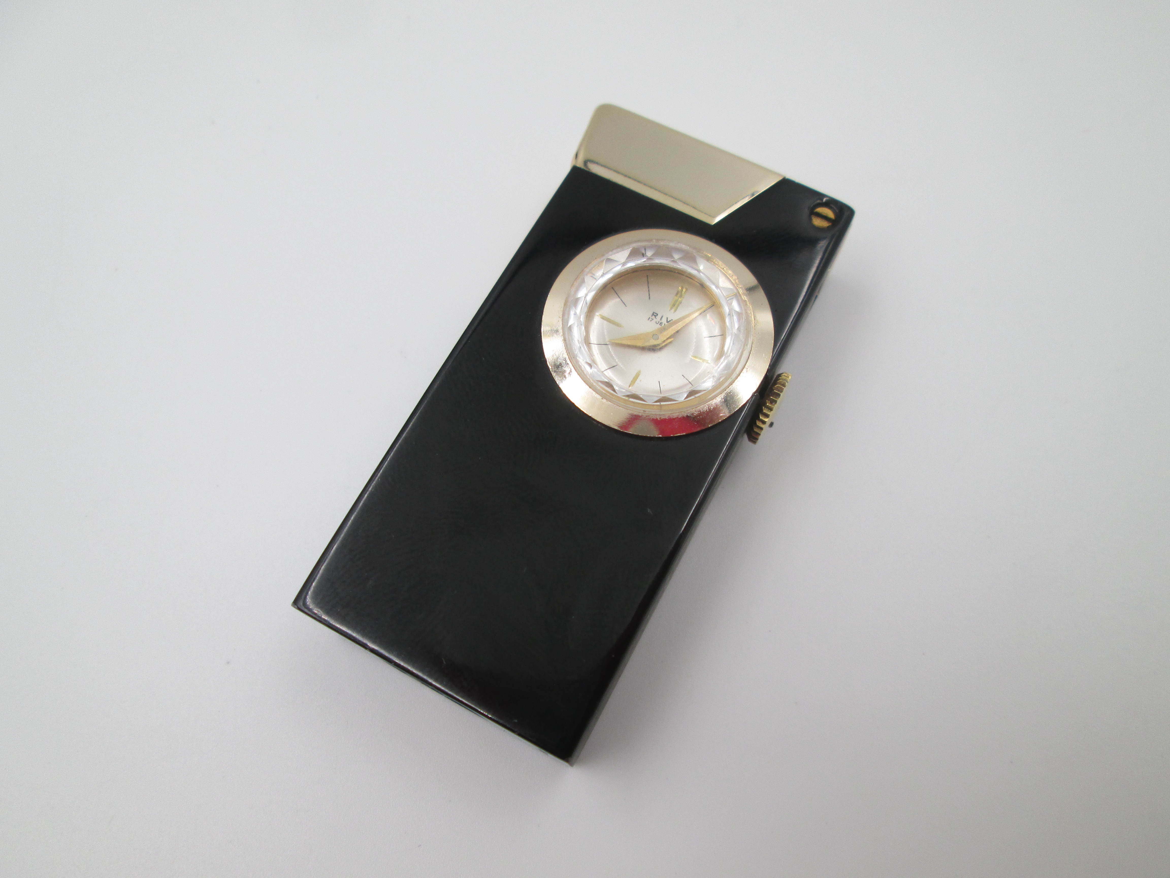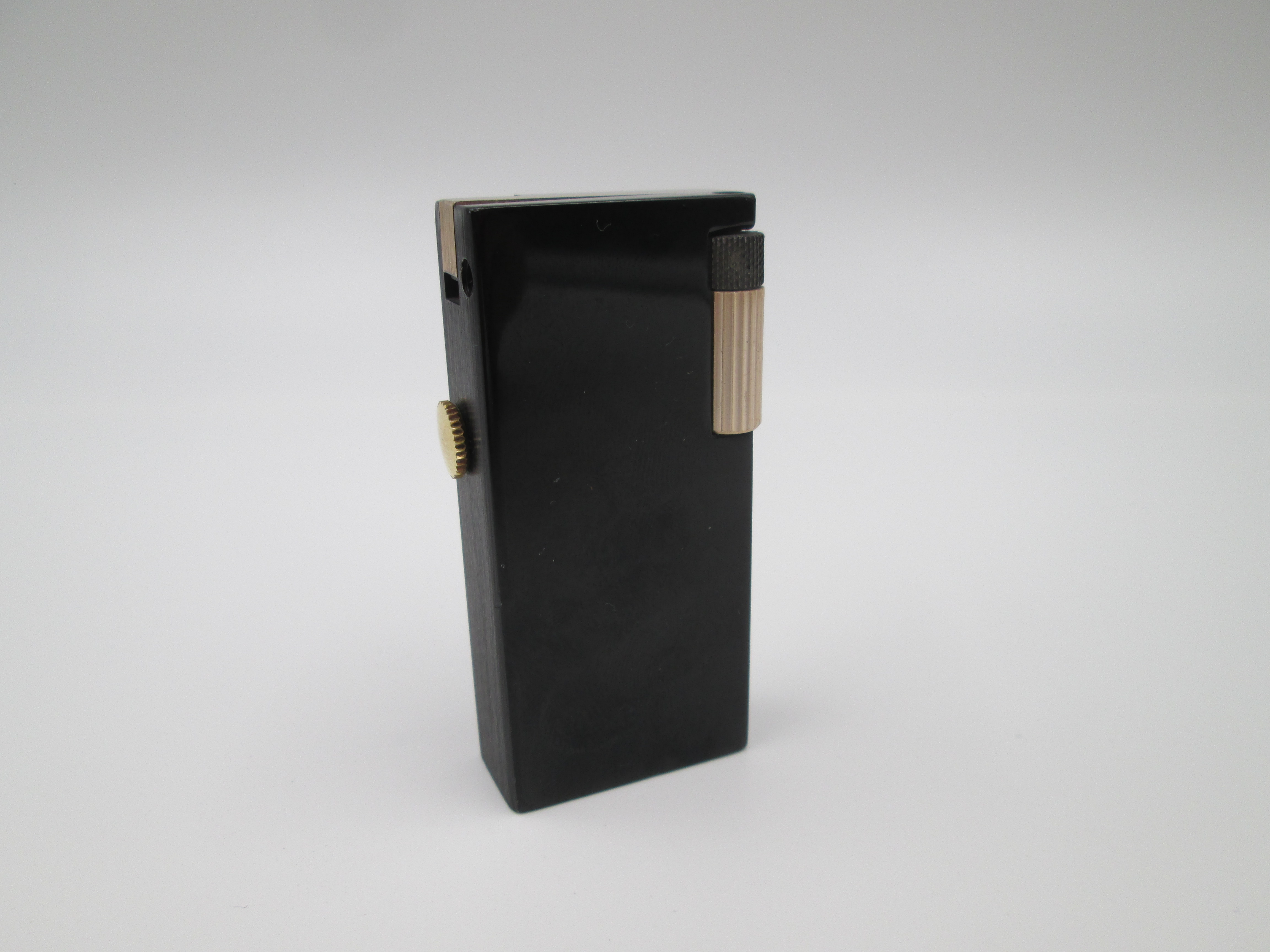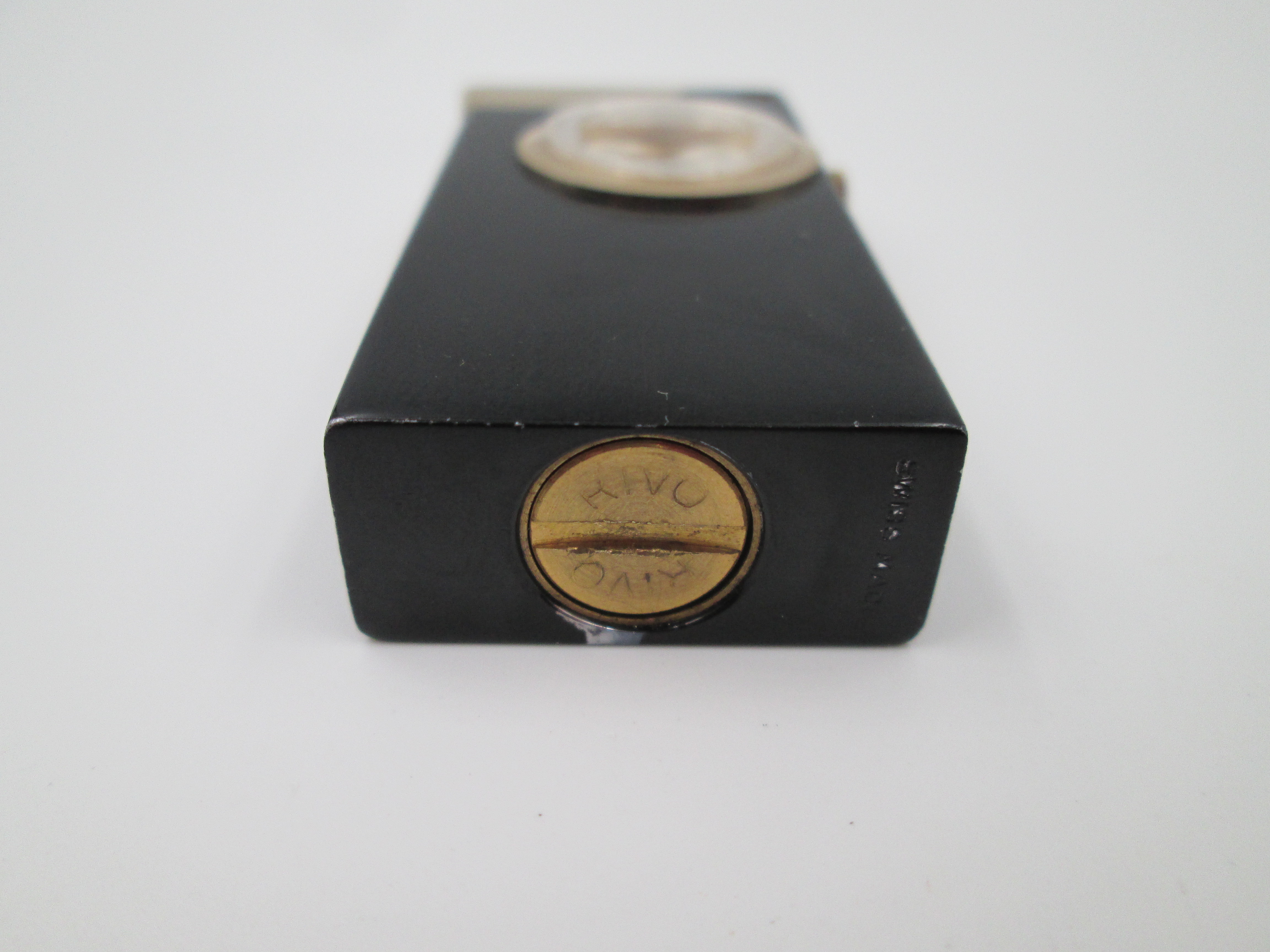 Encendedor gasolina / reloj mecánico Rivo. Metal lacado negro y chapado oro. Suiza. 1960