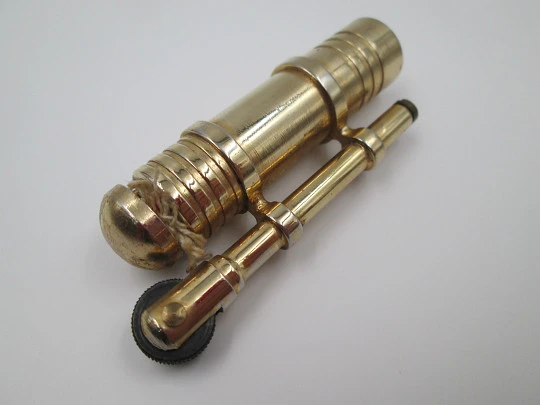 Encendedor de mecha. Metal dorado. Forma tubular. Adornos acanalados. 1980