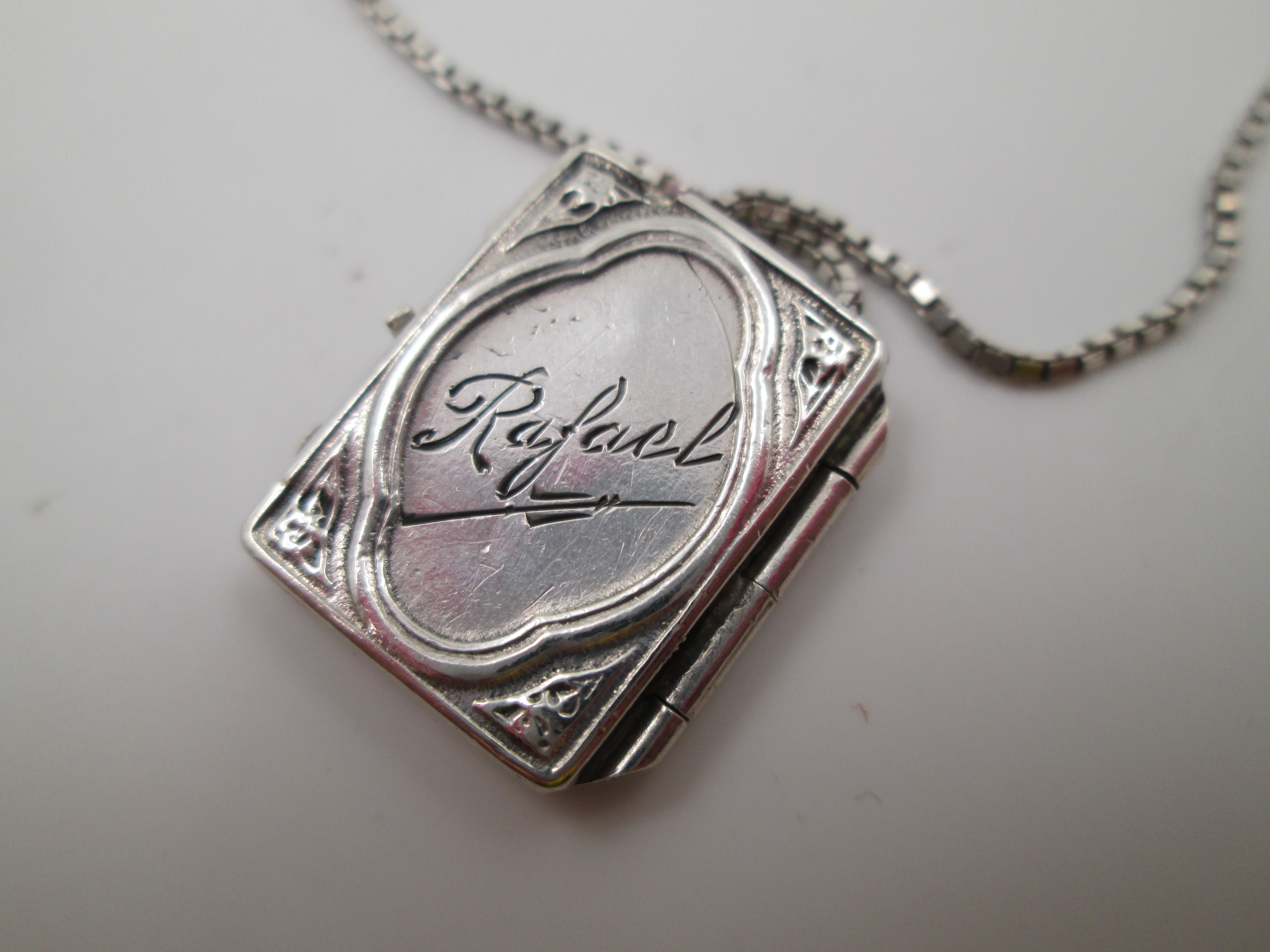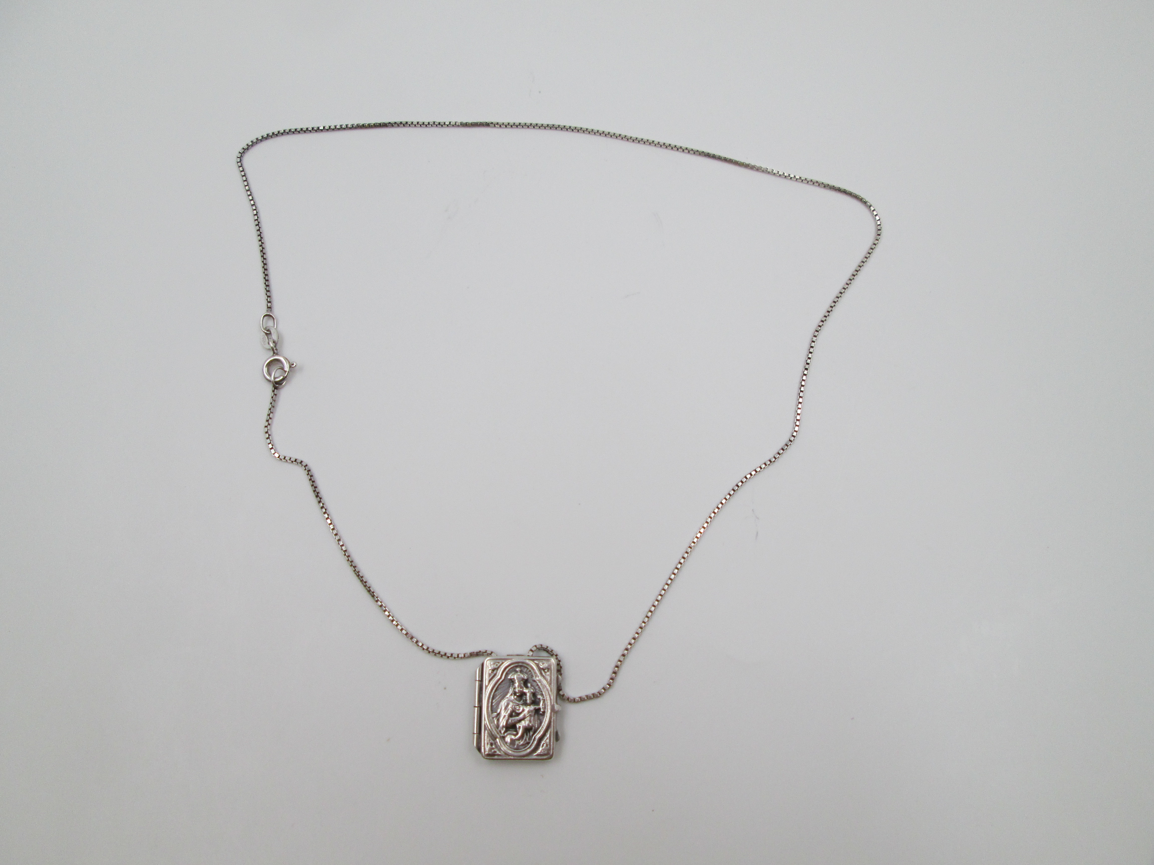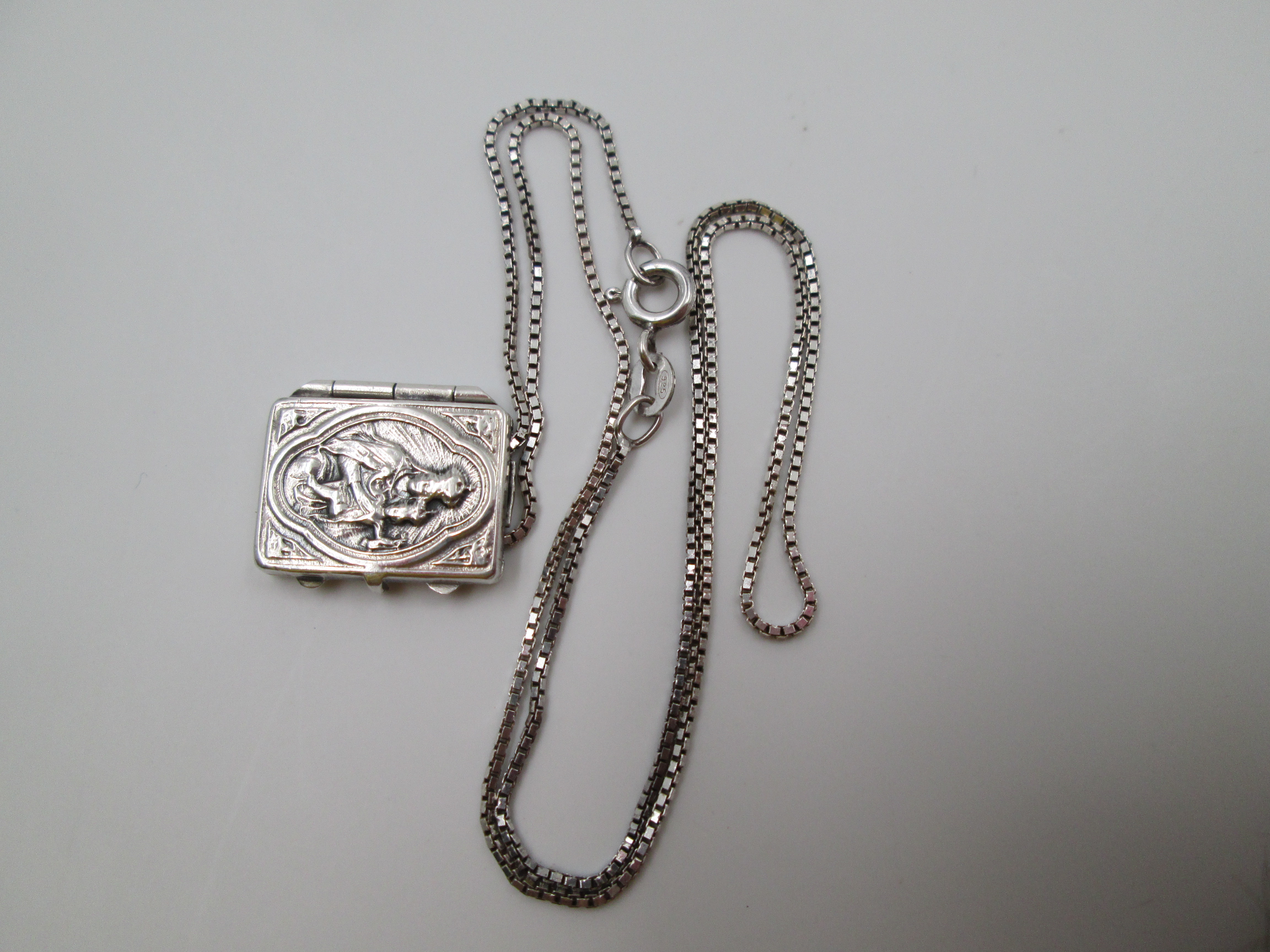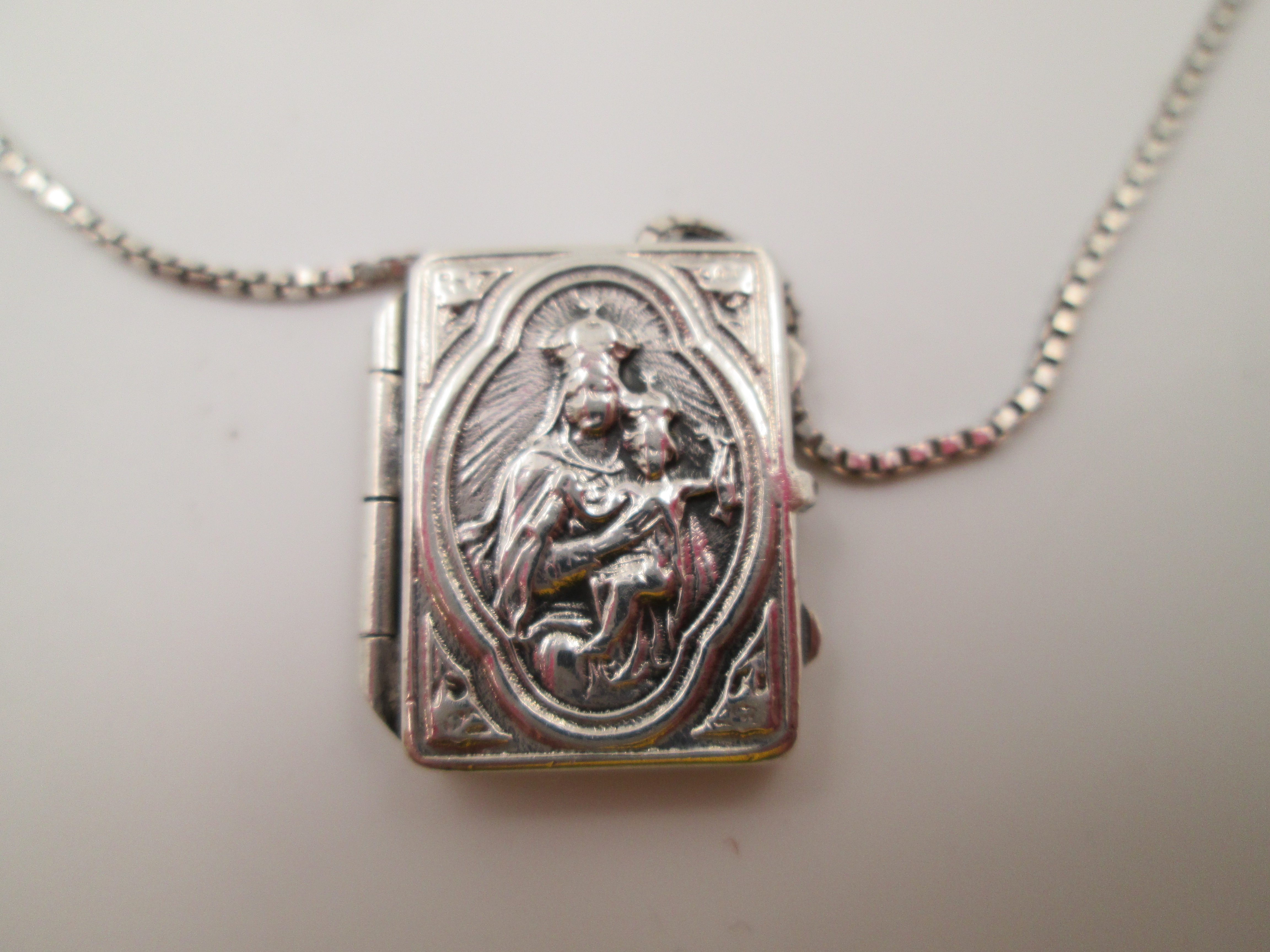 El artículo, que se acompaña de una cadena de eslabones trenzados del mismo material, esconde en el interior otra medalla circular con la imagen de un santo con hábito y pluma.
