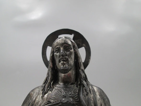 Escultura Sagrado Corazón de Jesús. Peltre y peana oval mármol blanco. España. 1940