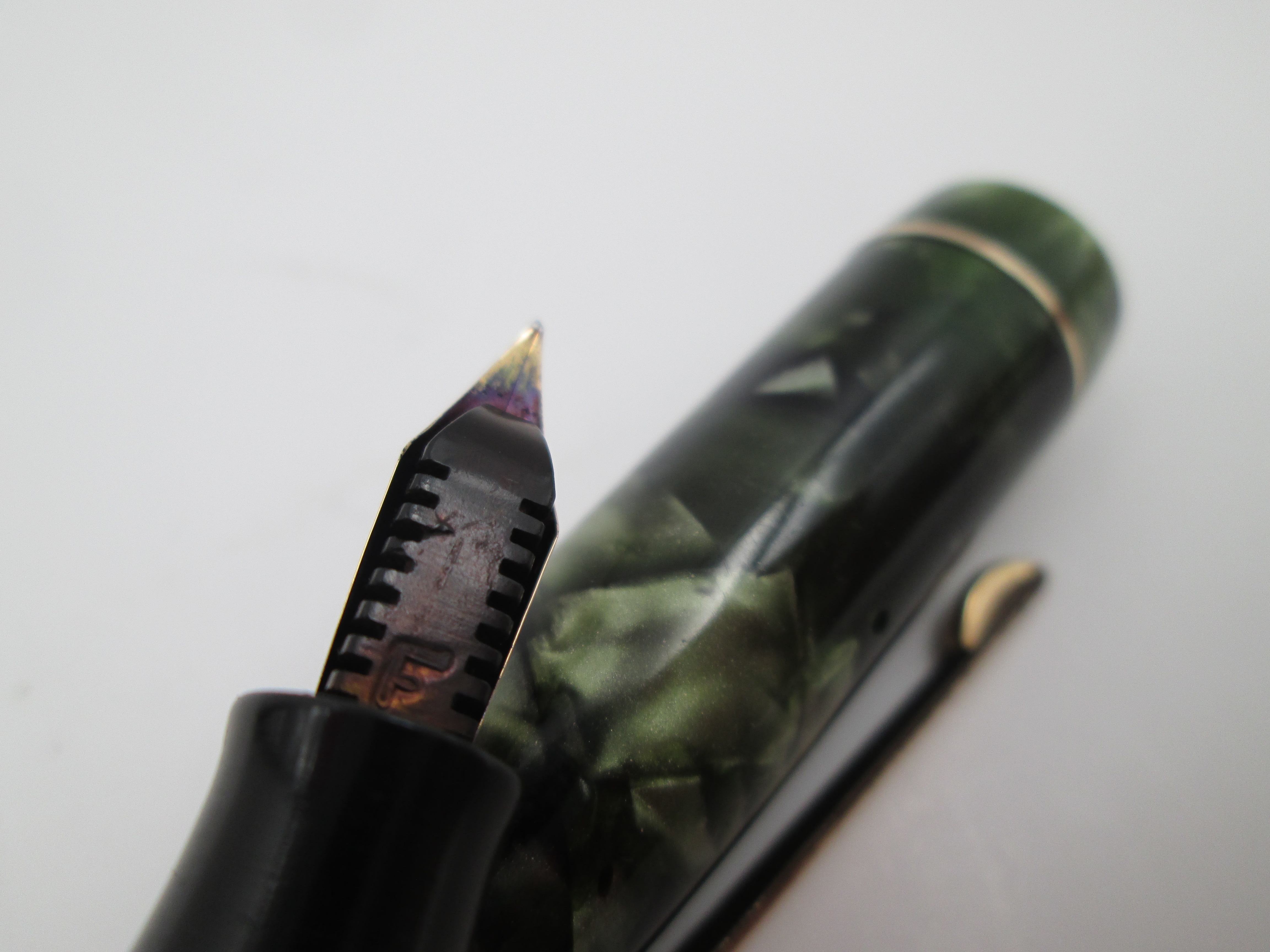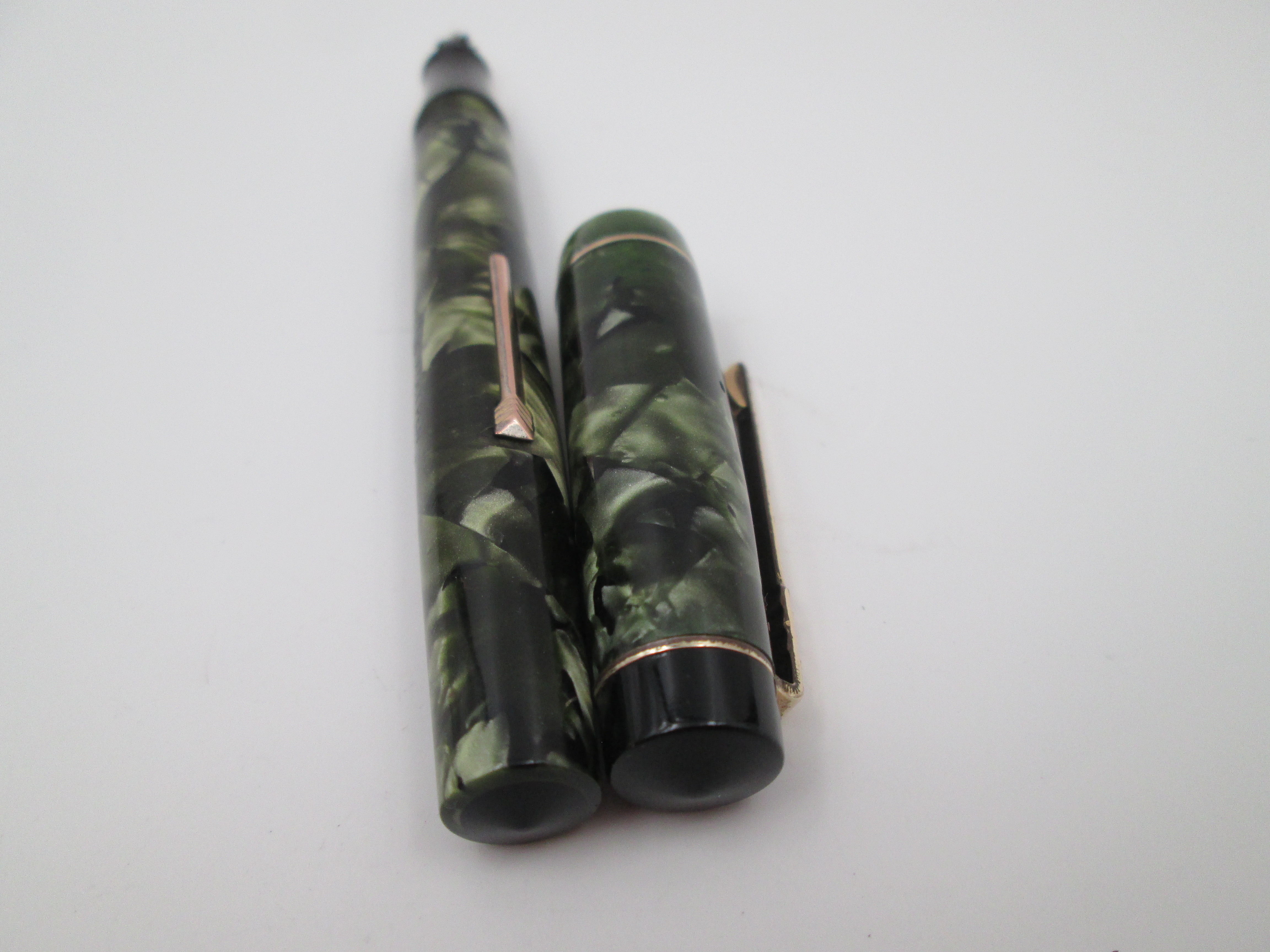 La unidad, que trabaja con sistema de llenado de palanca lateral, viene realizada en celuloide marmolizado en tonos verdes, con los detalles acabados en metal dorado y la sección y el extremo del capuchón rematados en negro.