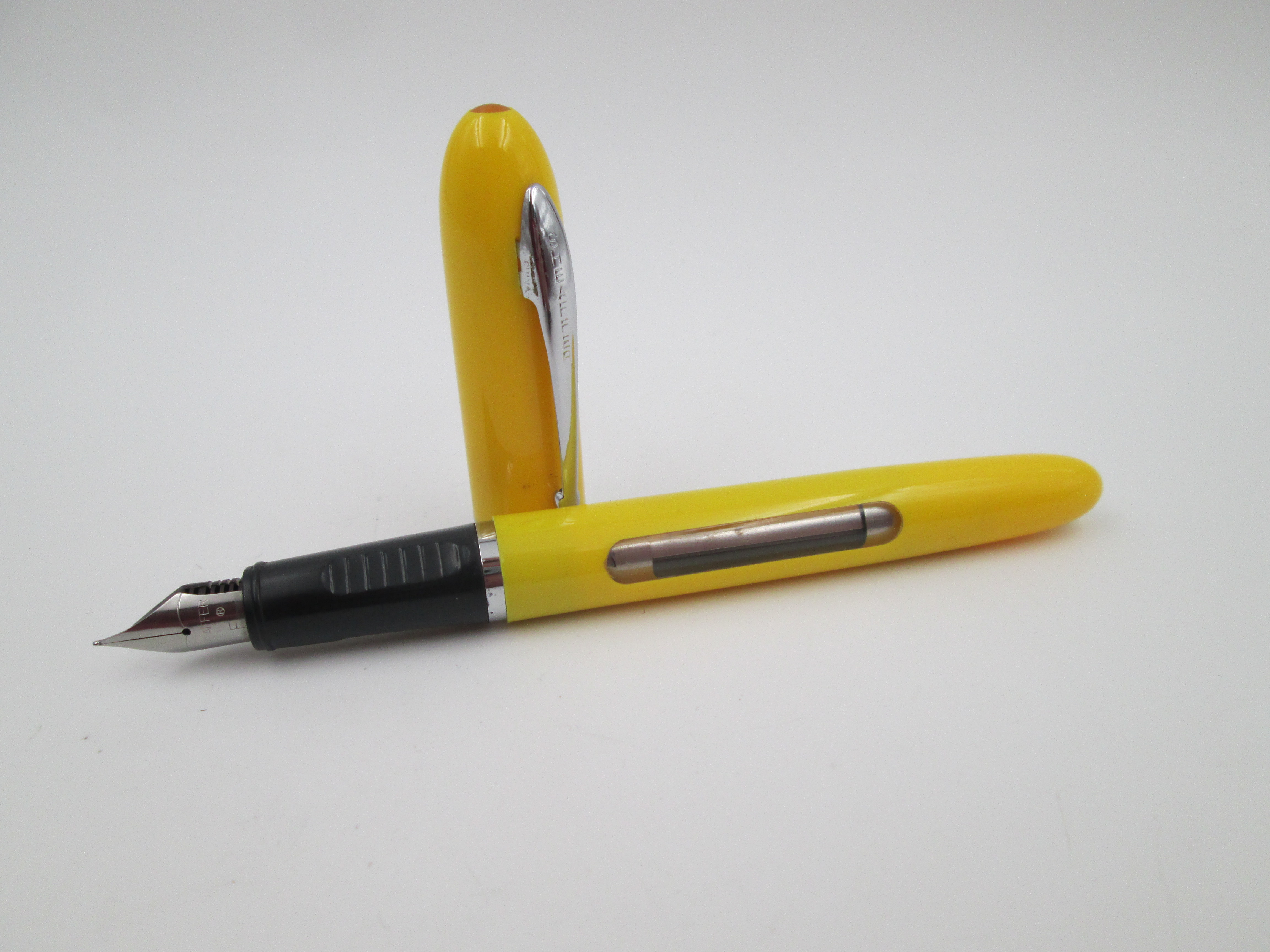 Estilográfica escolar Sheaffer. Plástico amarillo y metal plateado. Plumín acero. 1990