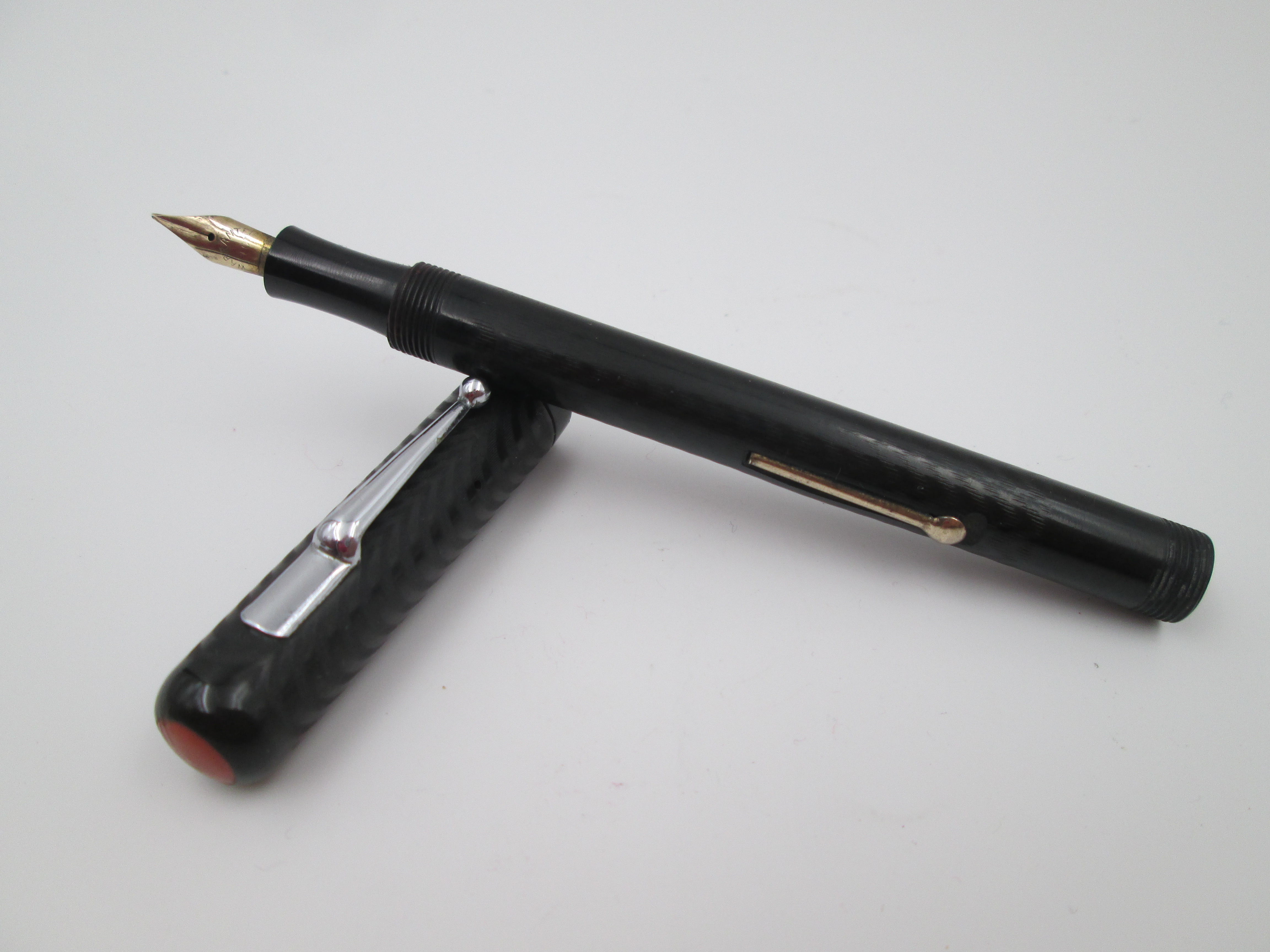 Estilográfica P.W. Ebonita negra decorada y metal bitono. Plumín oro 14k. Palanca. 1920