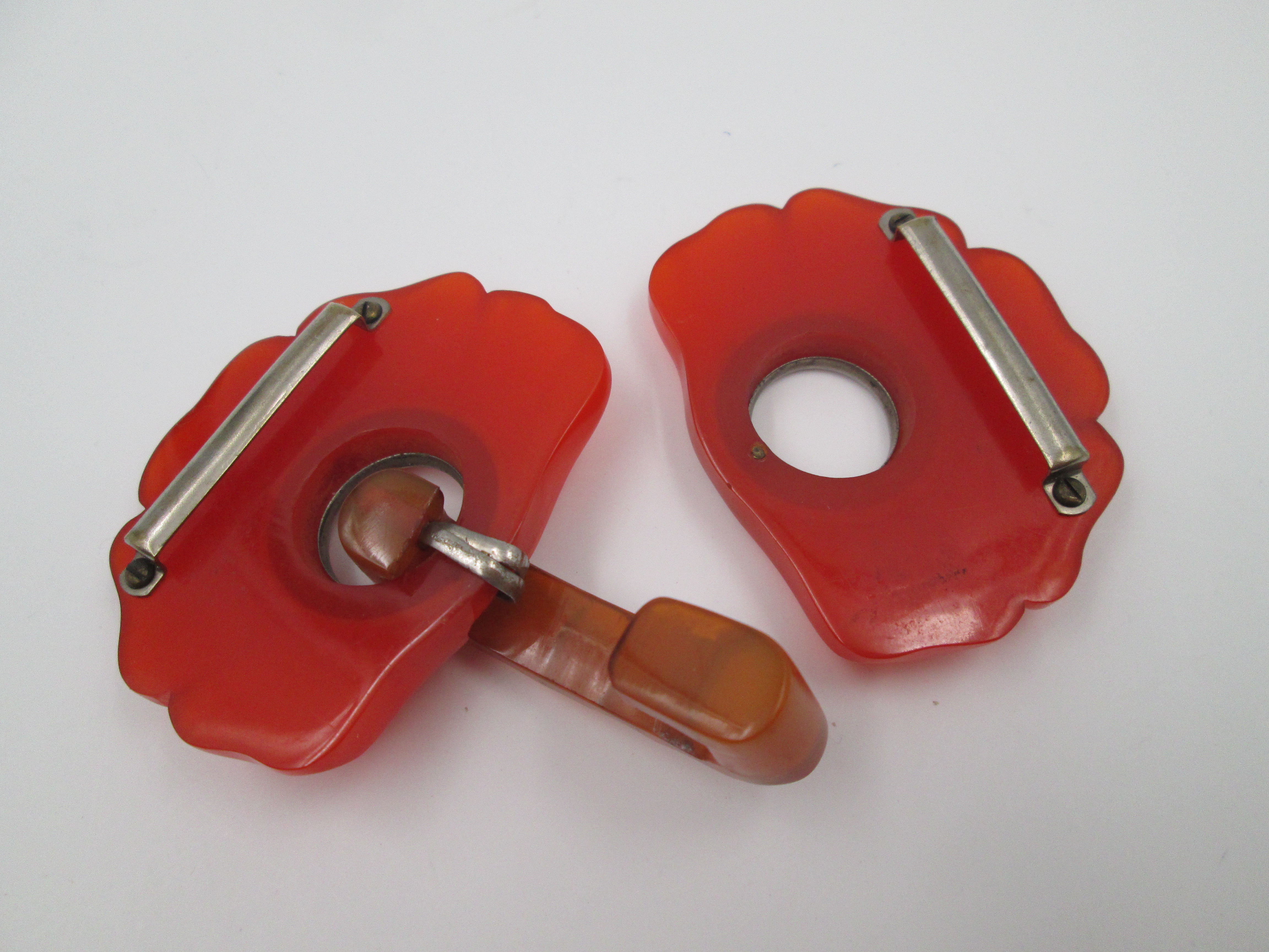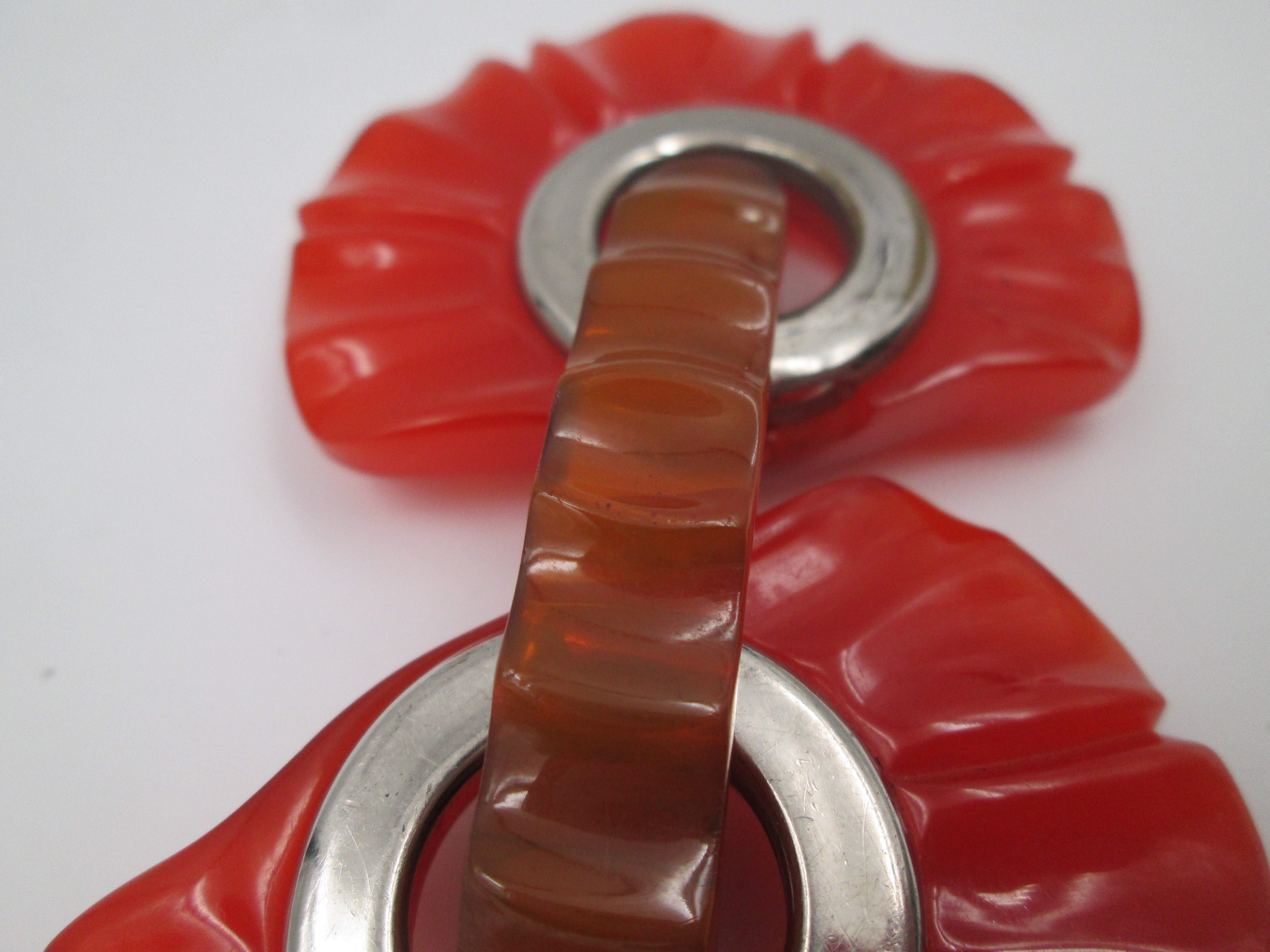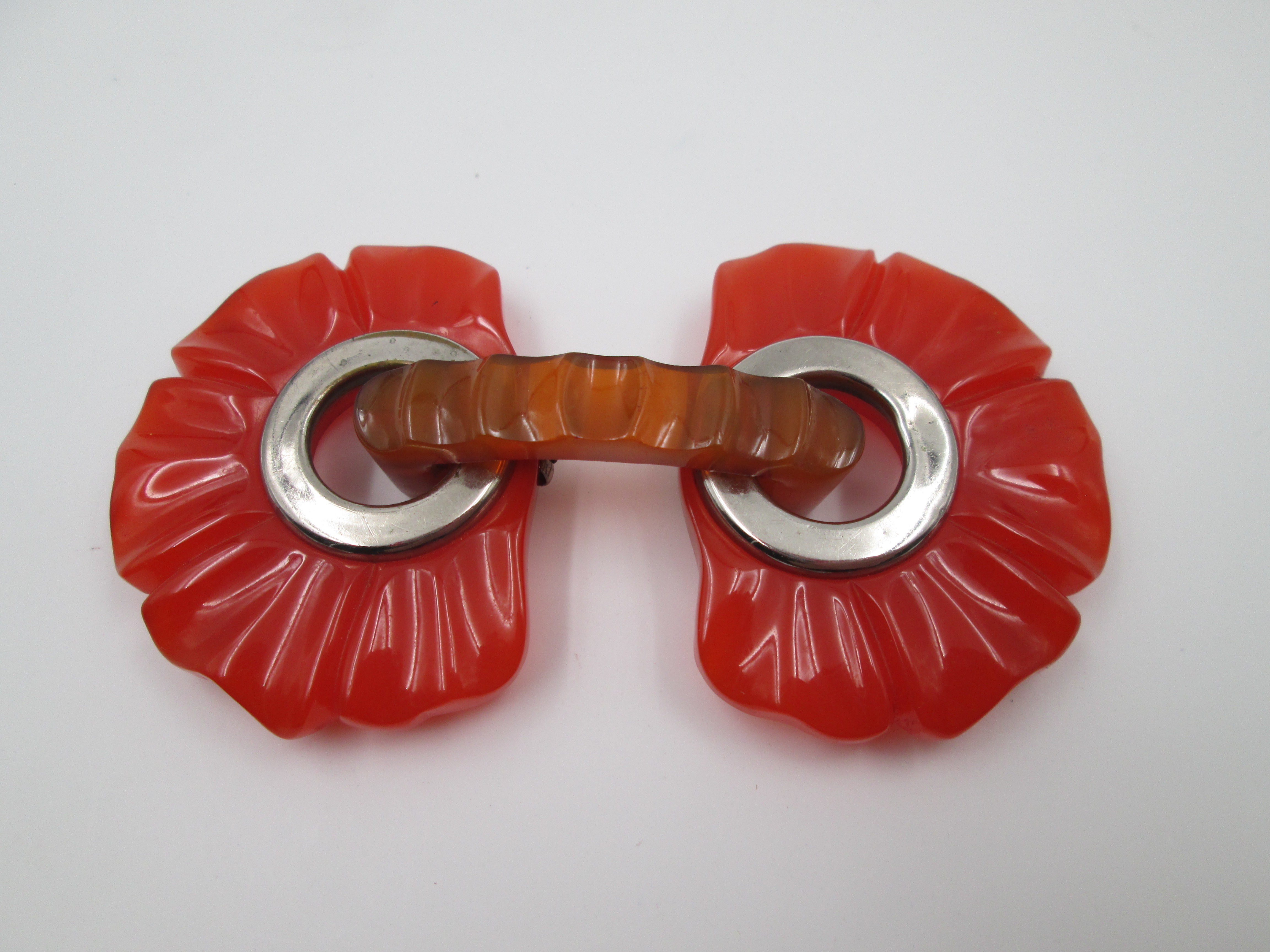 Hebilla de cinturón art decó en baquelita naranja y metal plateado. Diseño floral. 1930