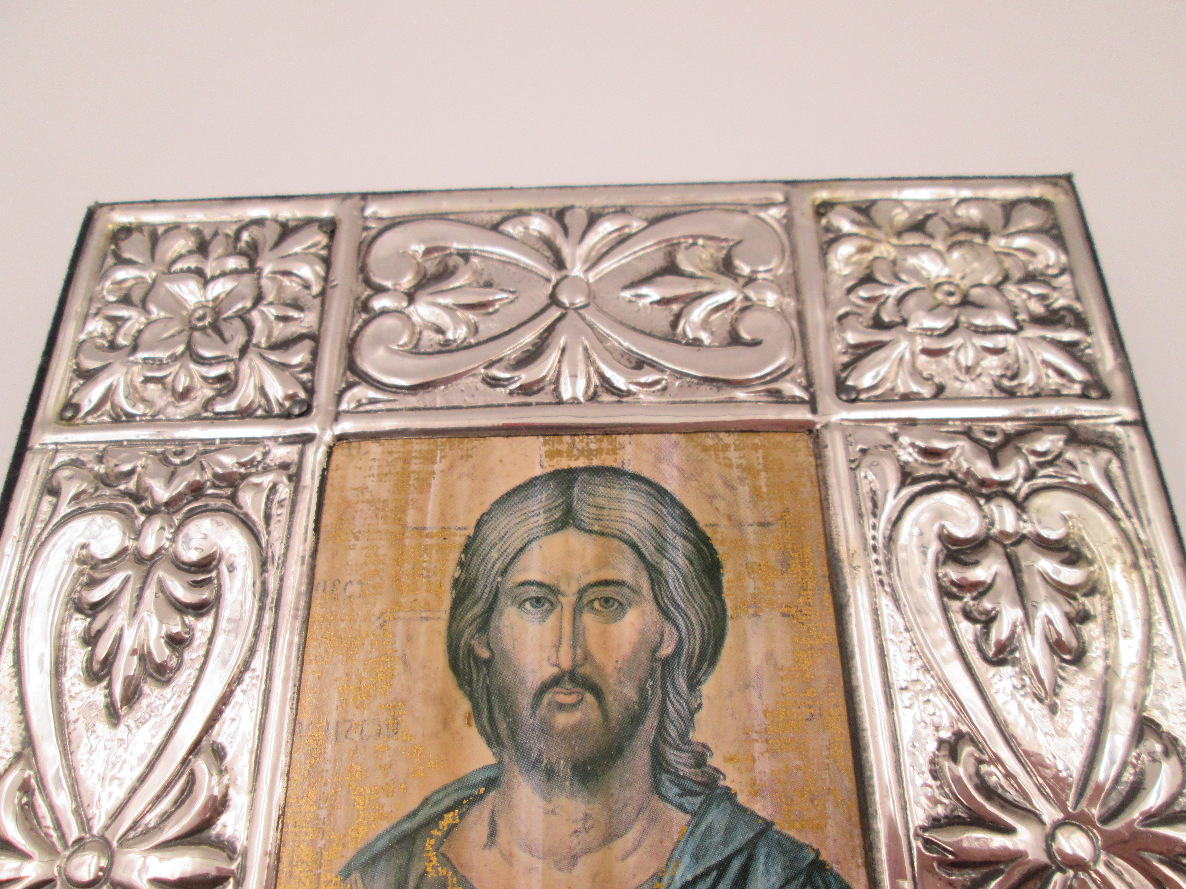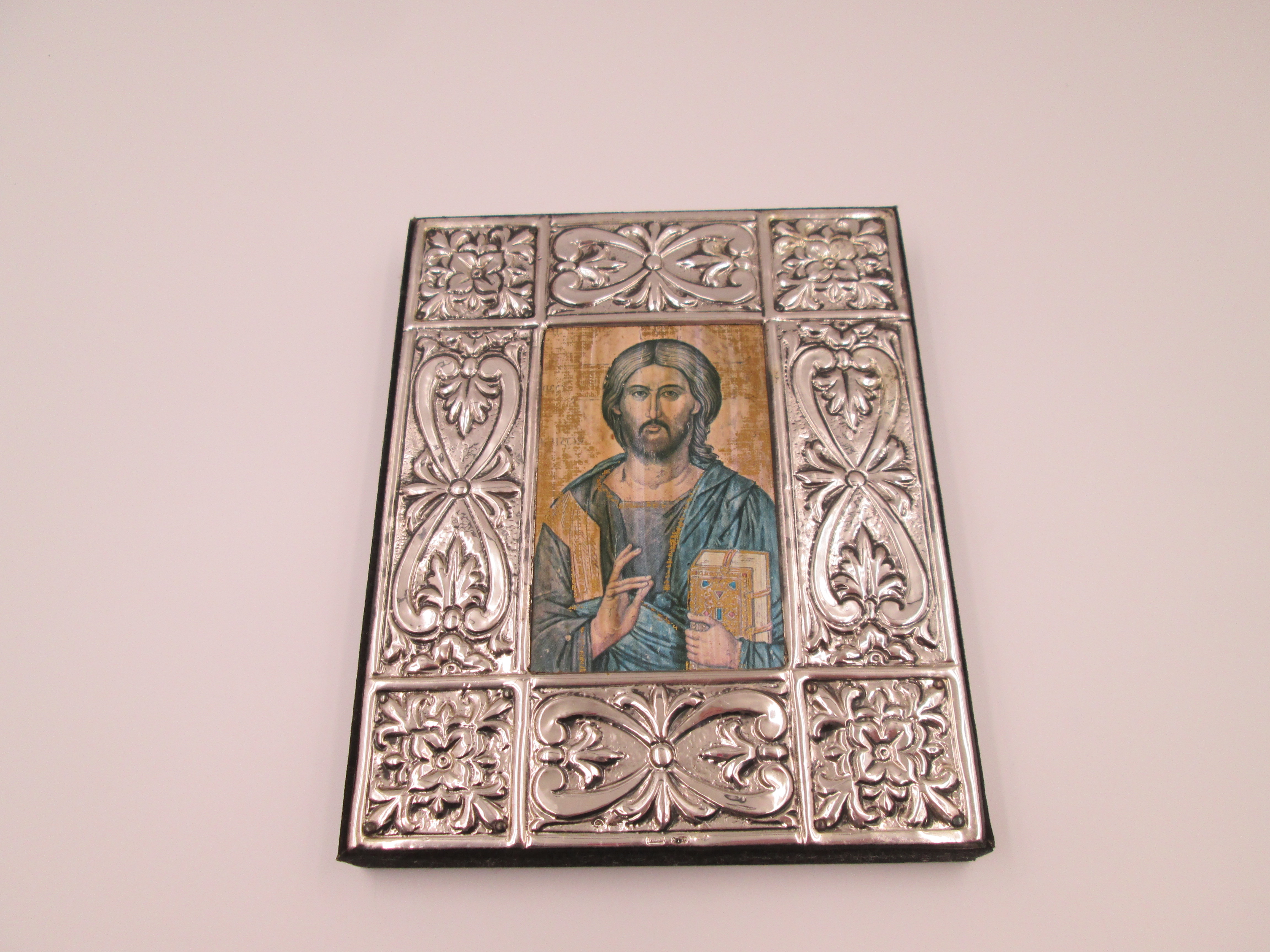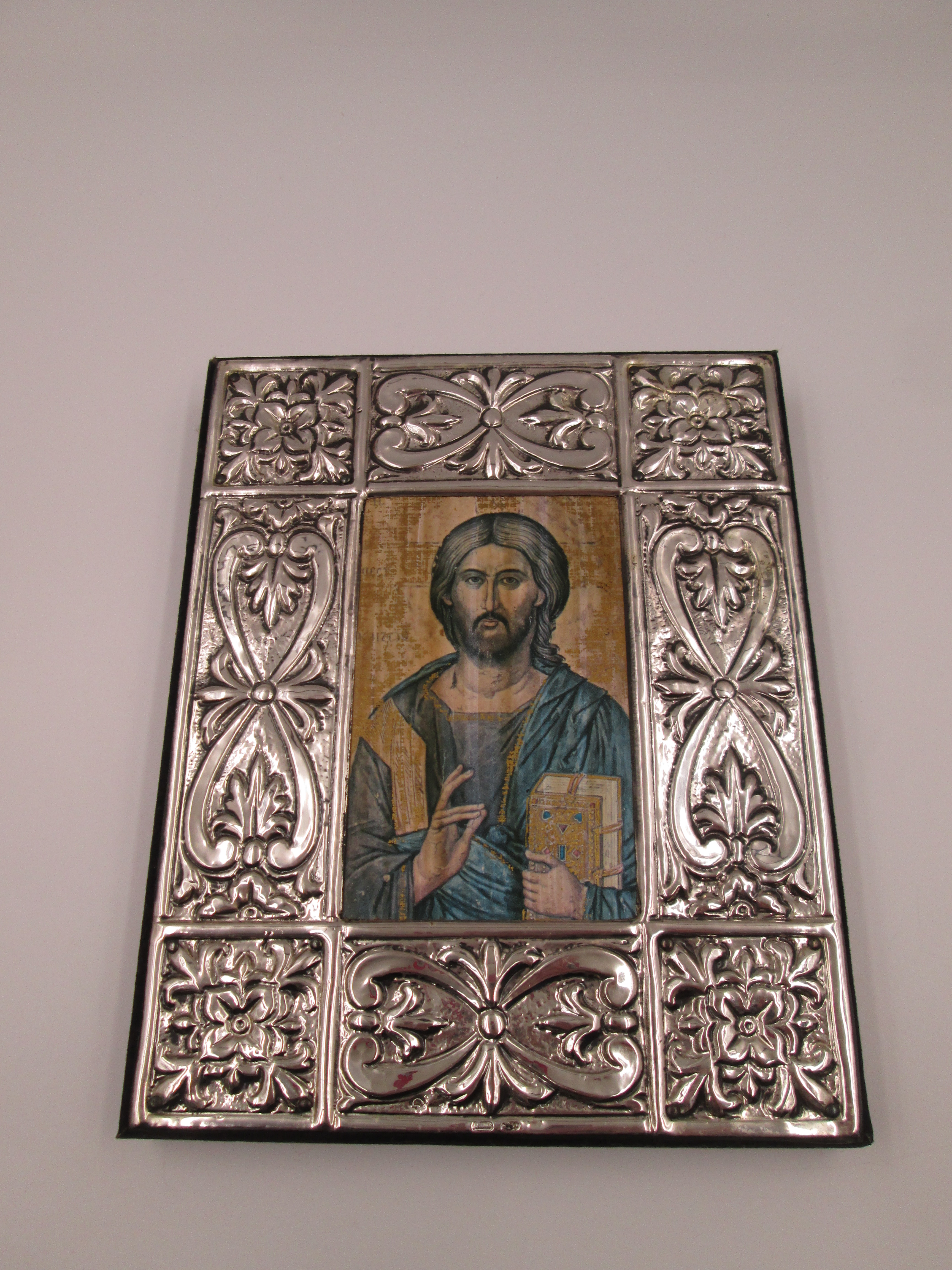 Icono bizantino rectangular Cristo Pantocrator. Plata de ley. Marco madera. Italia