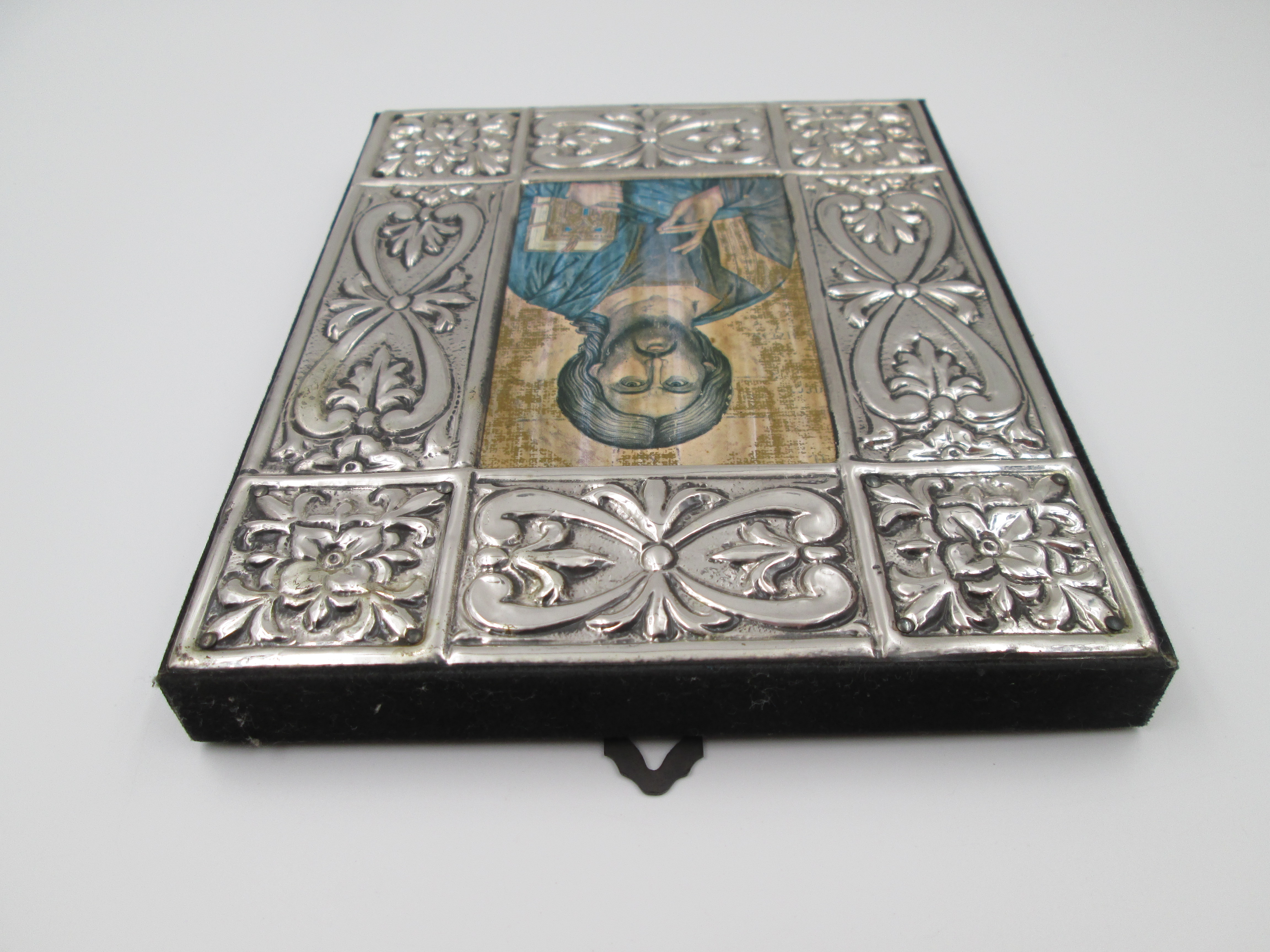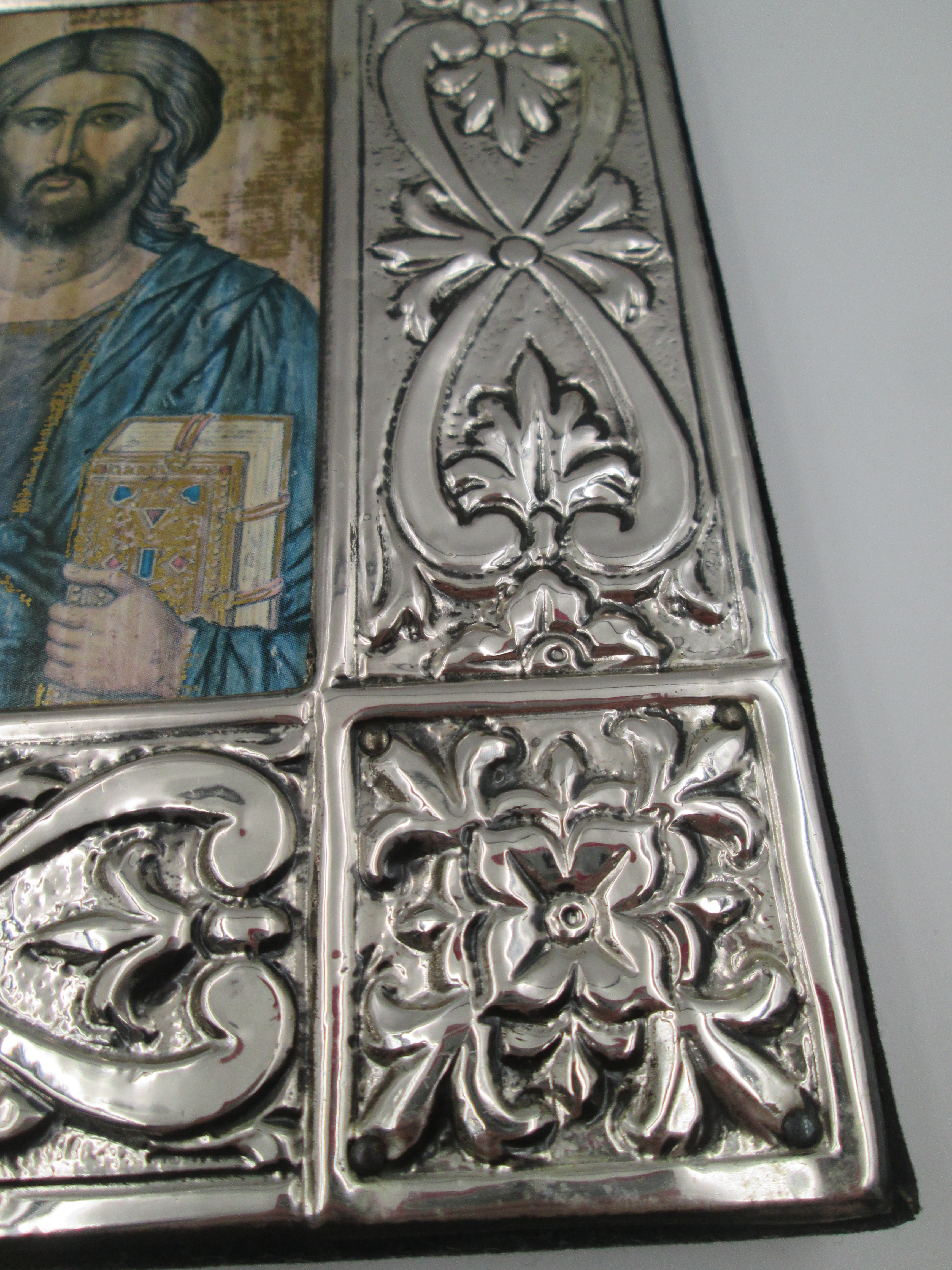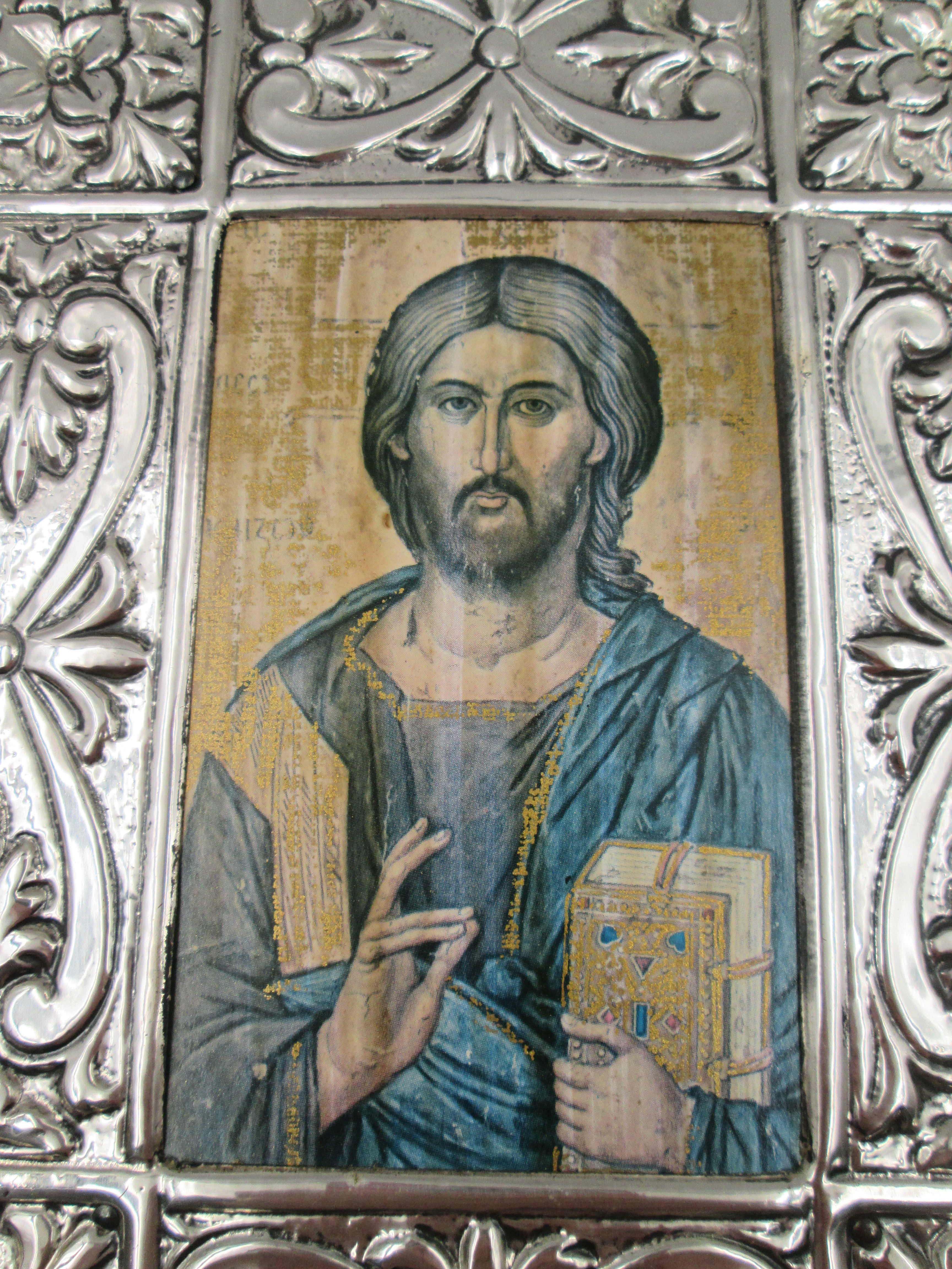 Icono bizantino rectangular Cristo Pantocrator. Plata de ley. Marco madera. Italia