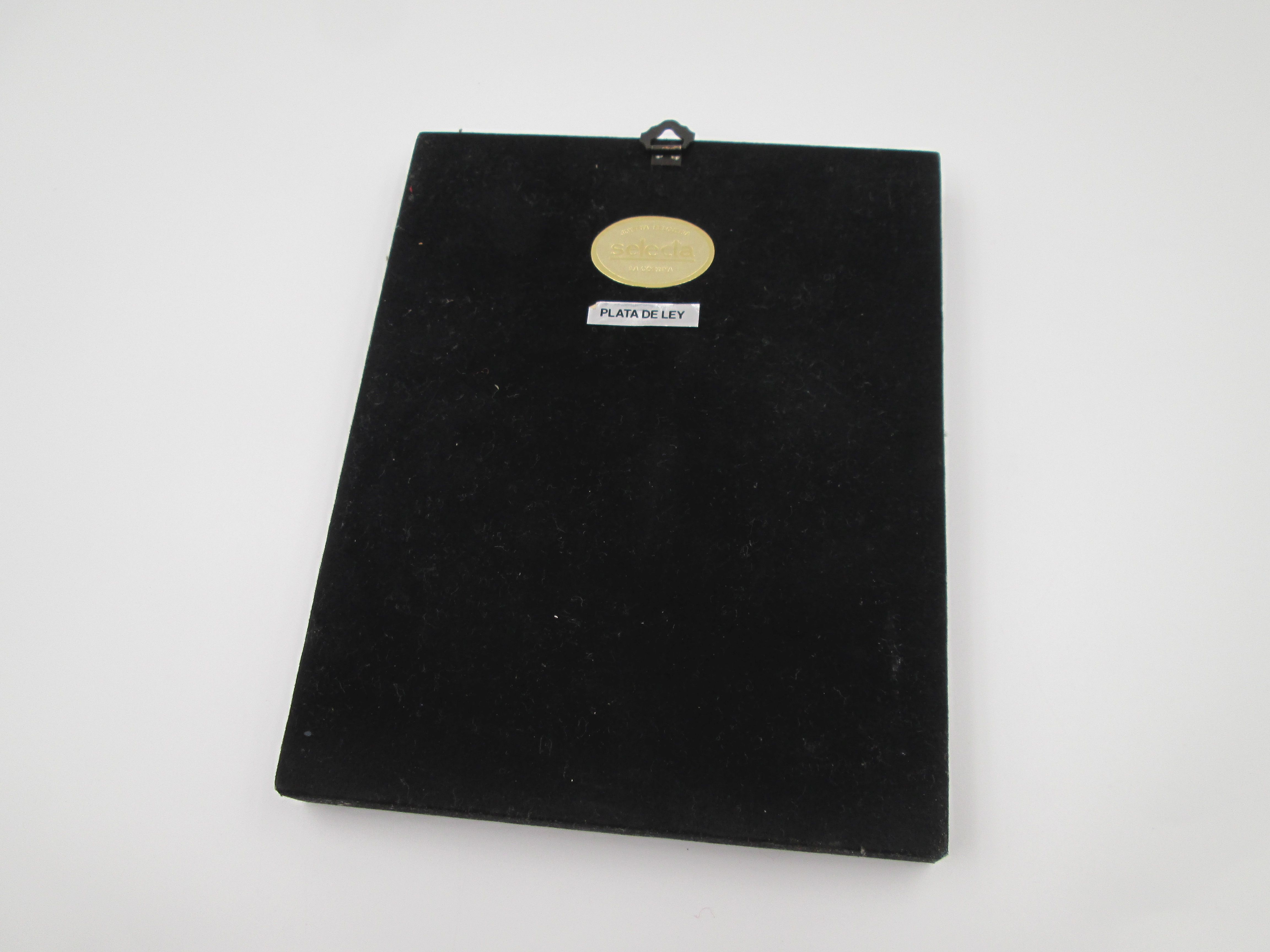 La pieza, de forma rectangular y con argolla en la parte posterior, viene realizada en plata de ley contrastada de 925 milésimas sobre marco de madera.
