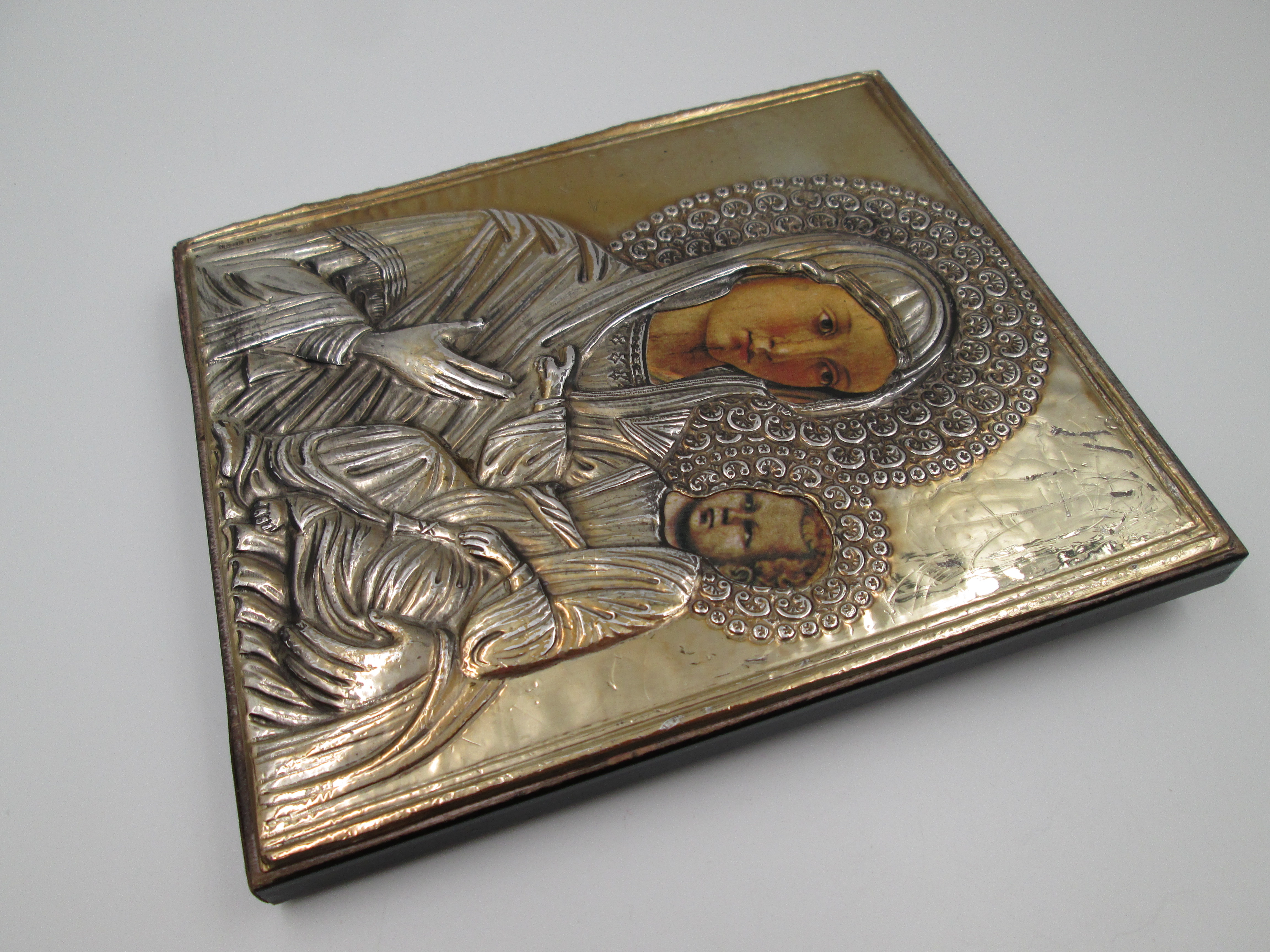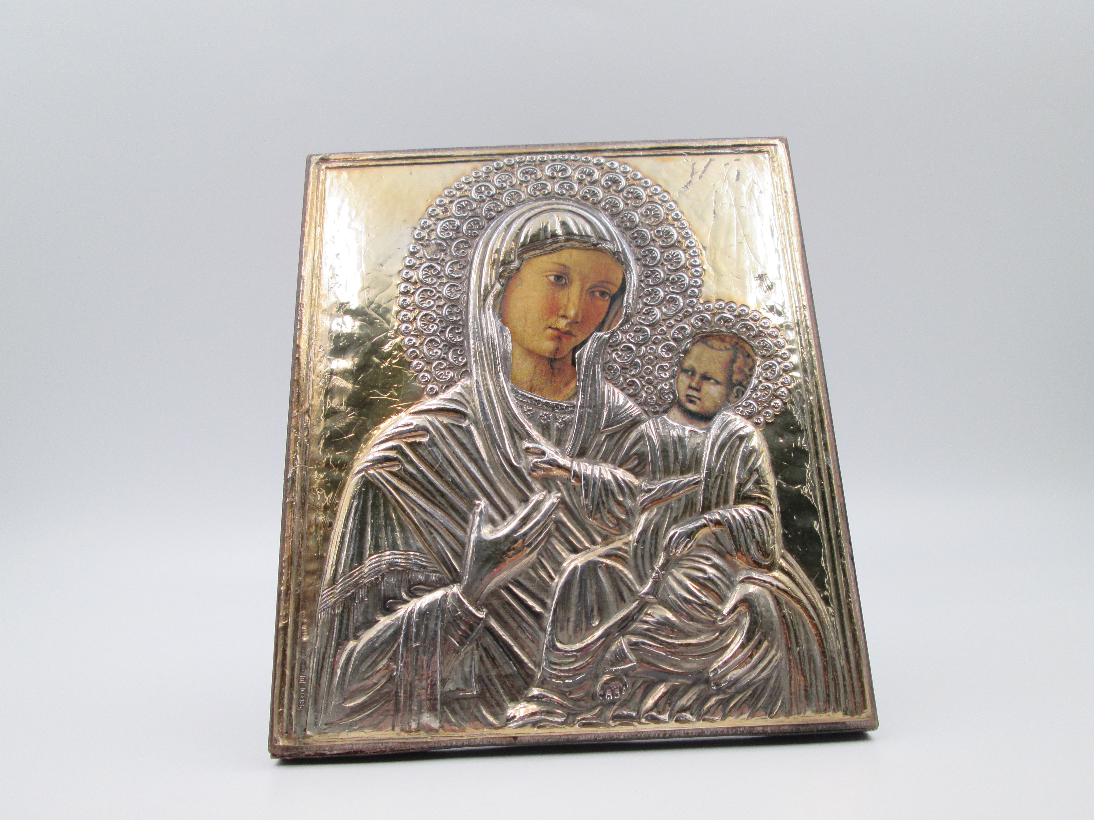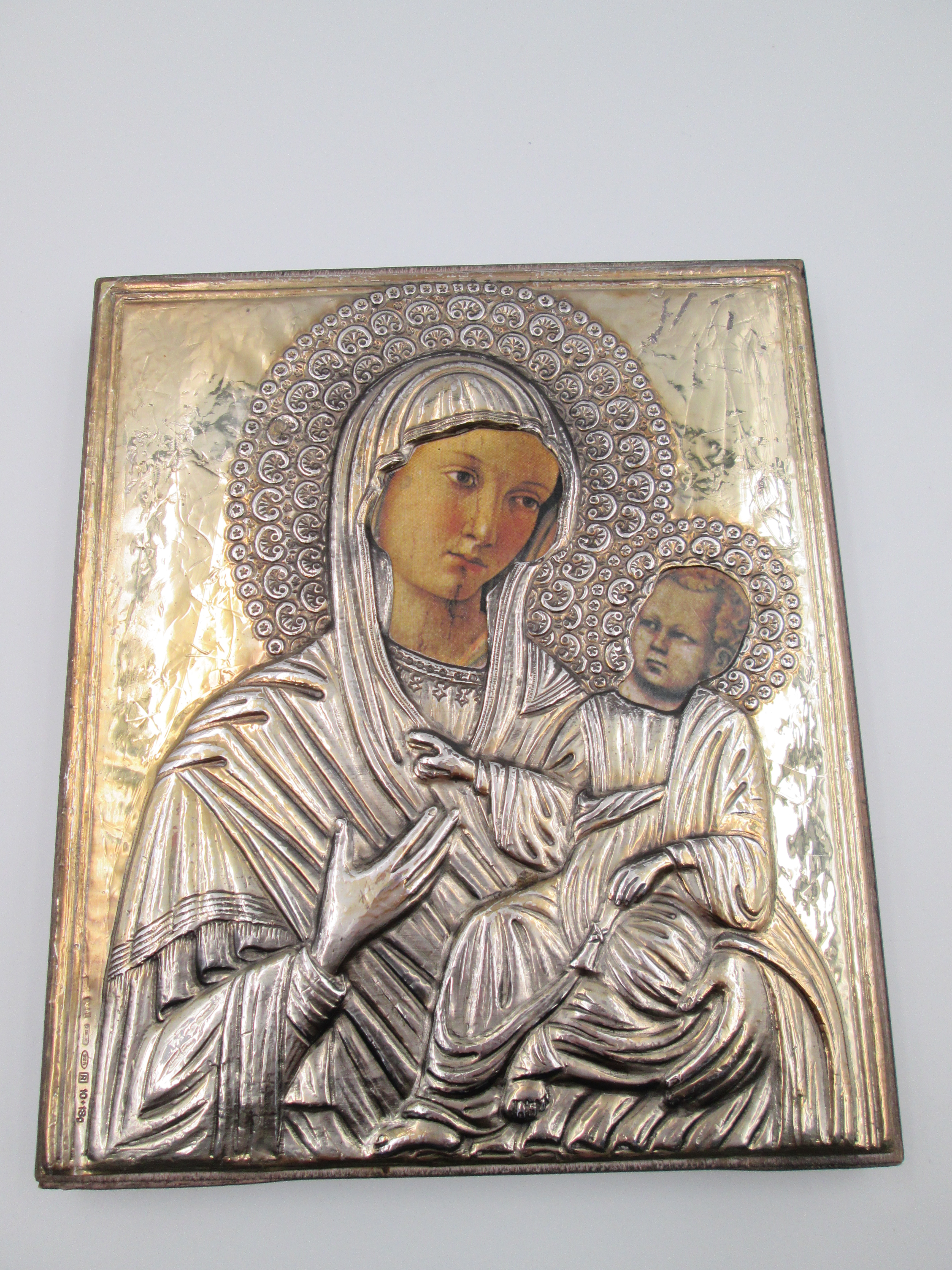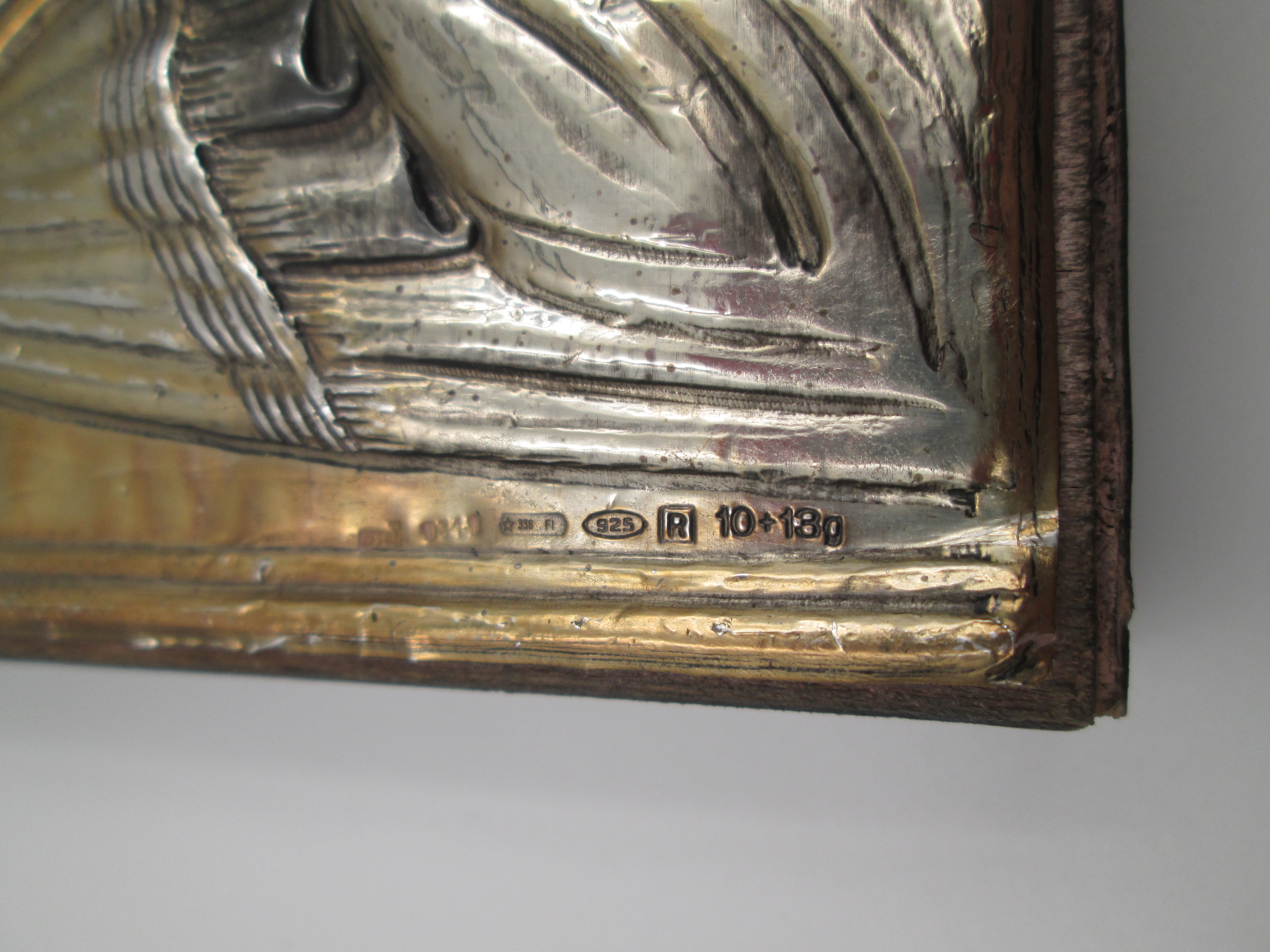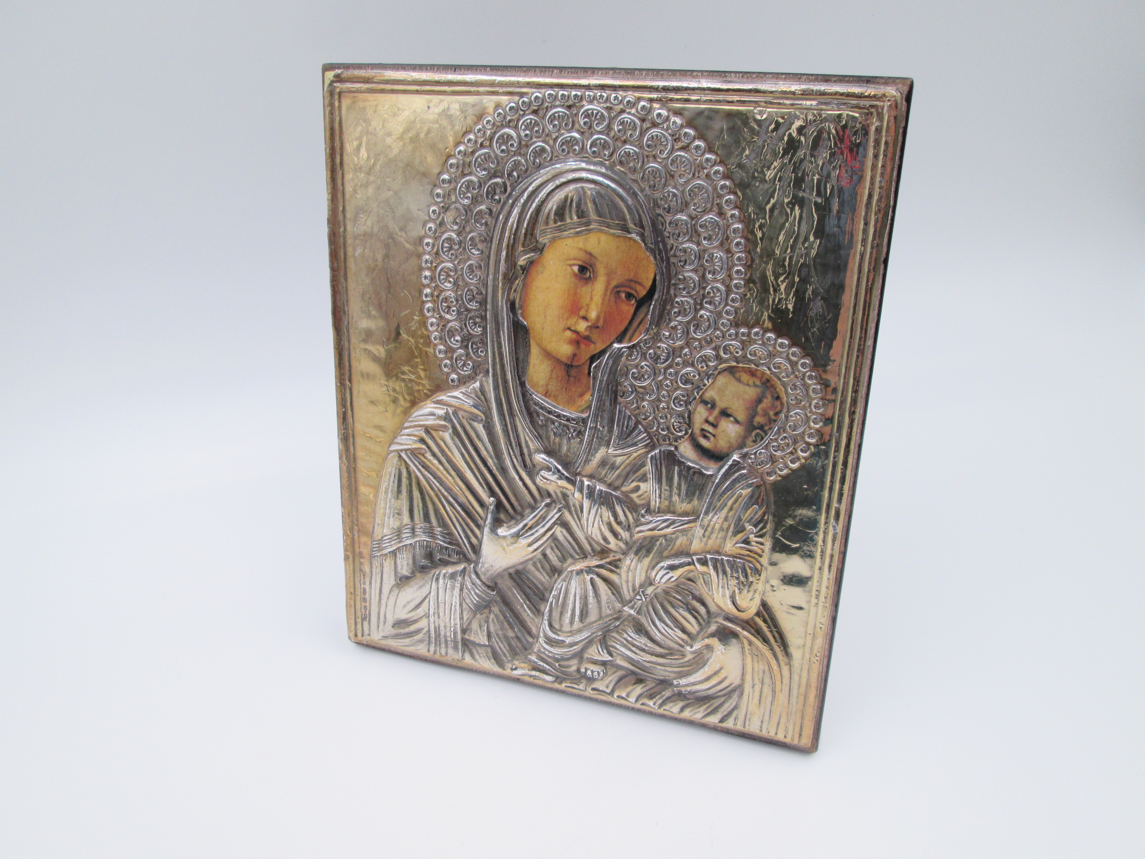 Icono bizantino rectangular Virgen con Niño. Plata de ley y baño oro. Marco madera. Italia