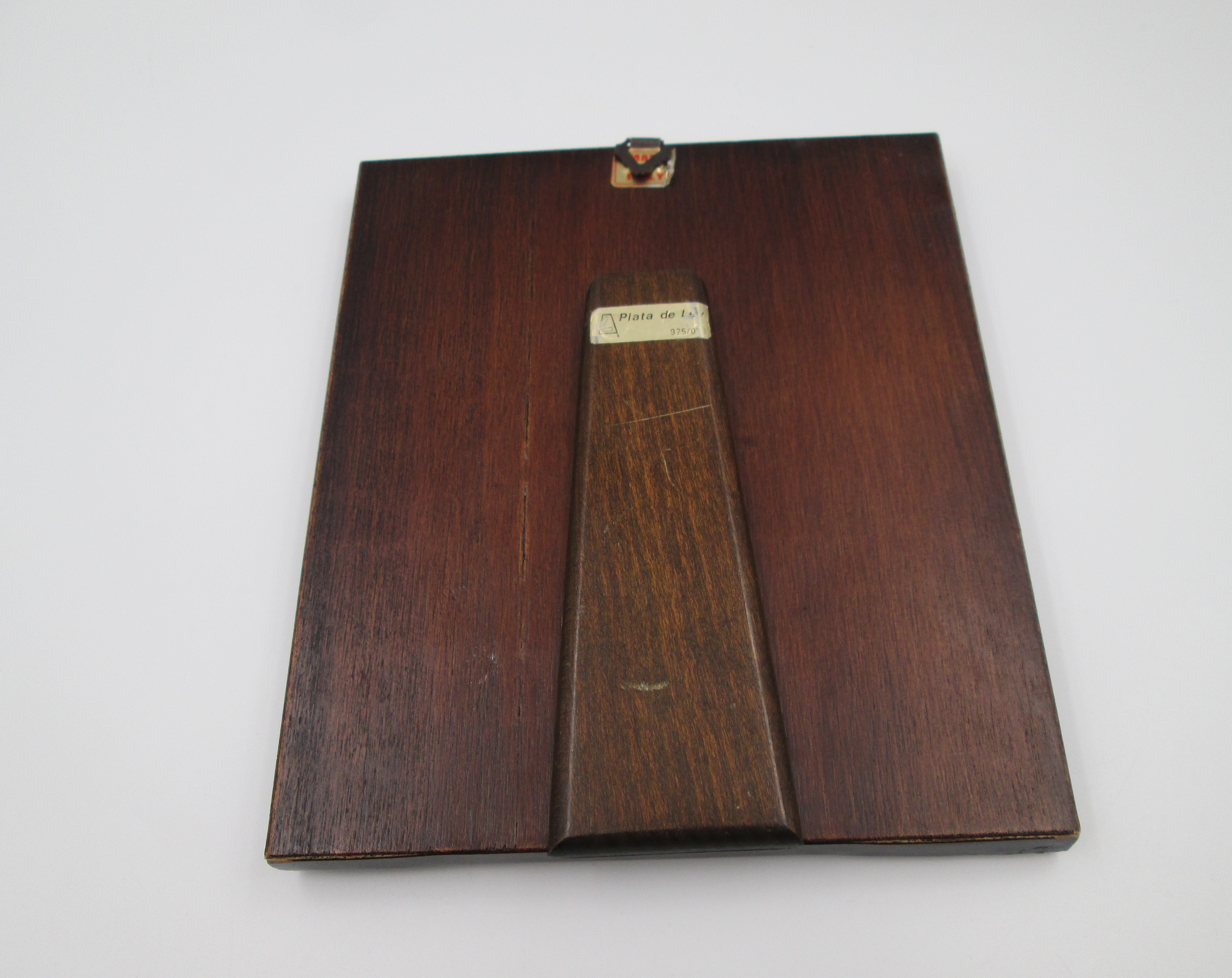 La pieza, de forma rectangular y con argolla y soporte en la parte posterior, viene realizada en plata de ley contrastada de 925 milésimas, con el contorno chapado en oro, y lleva marco de madera bicolor.