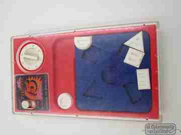 Corresponde al juego Tiempo 5 y está realizado en plástico de color rojo, azul y blanco.