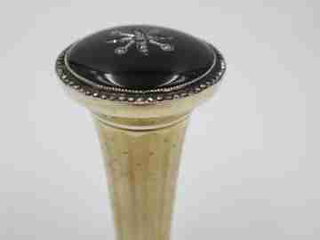 La unidad, fabricada en Francia, viene realizada en plata de ley vermeil y lleva el top ornamentado con esmalte negro y marquesitas en el contorno y el motivo central de flor mientras que el cuerpo se embellece con guilloché, puntos y adornos vegetales.