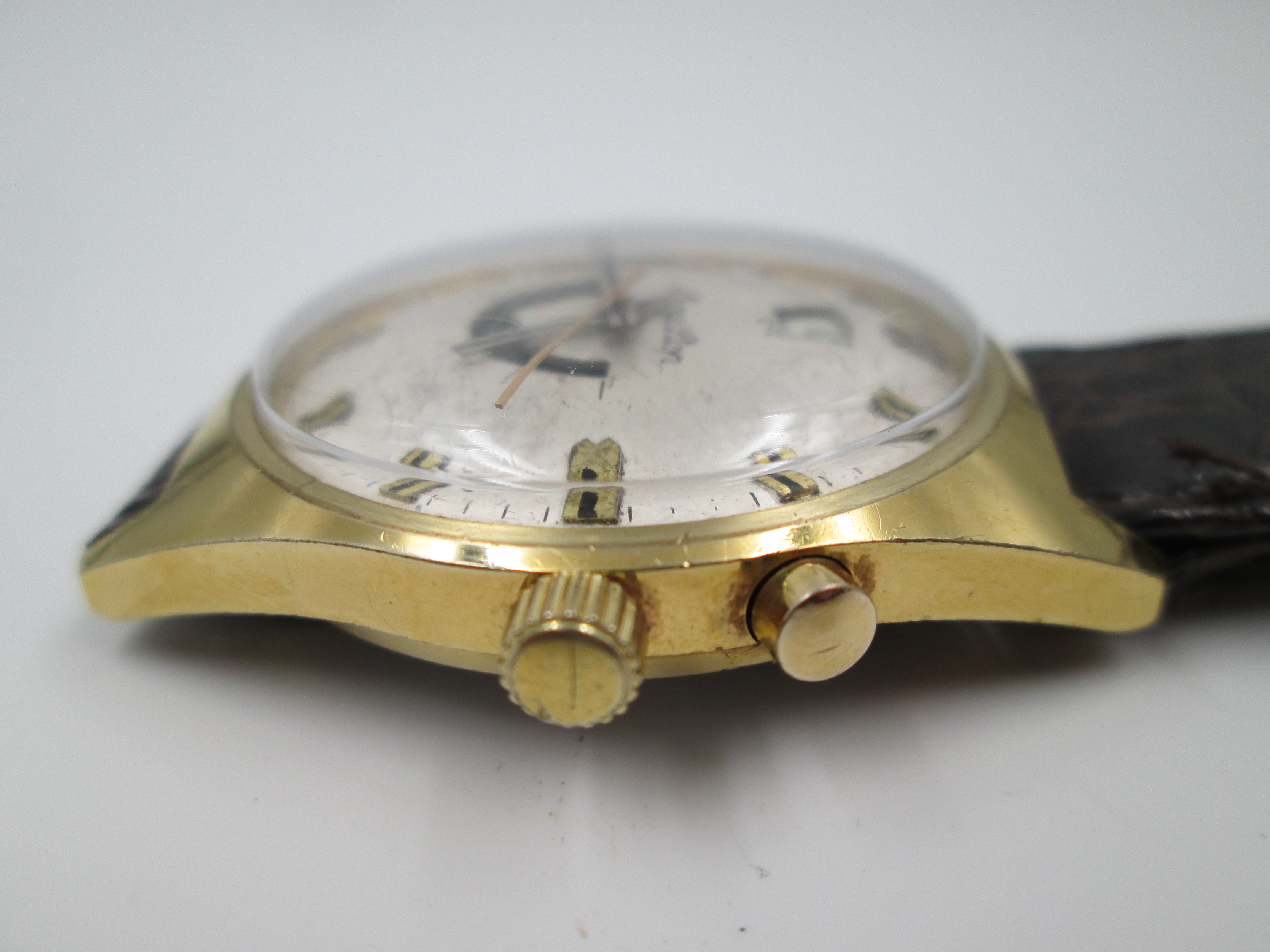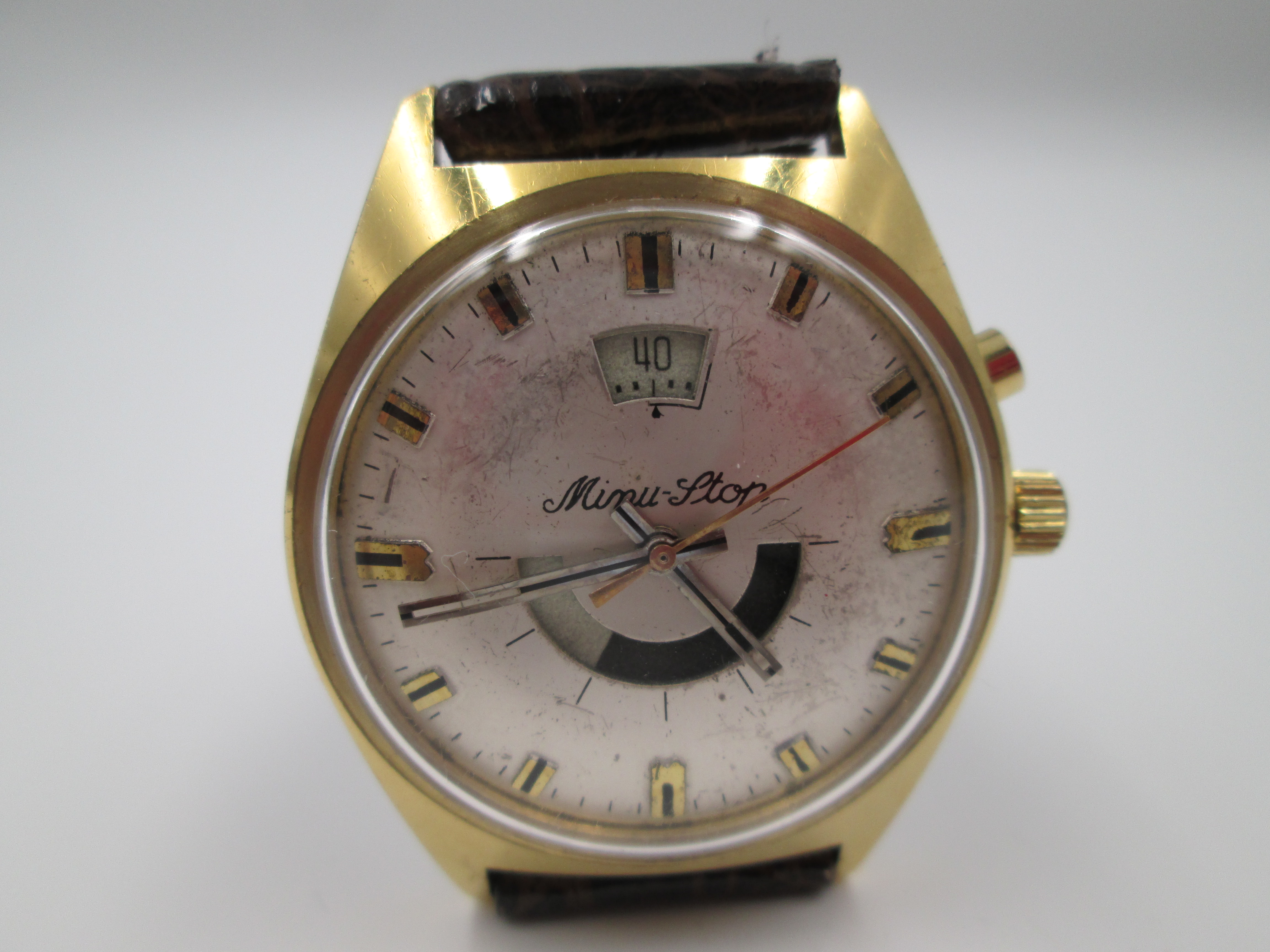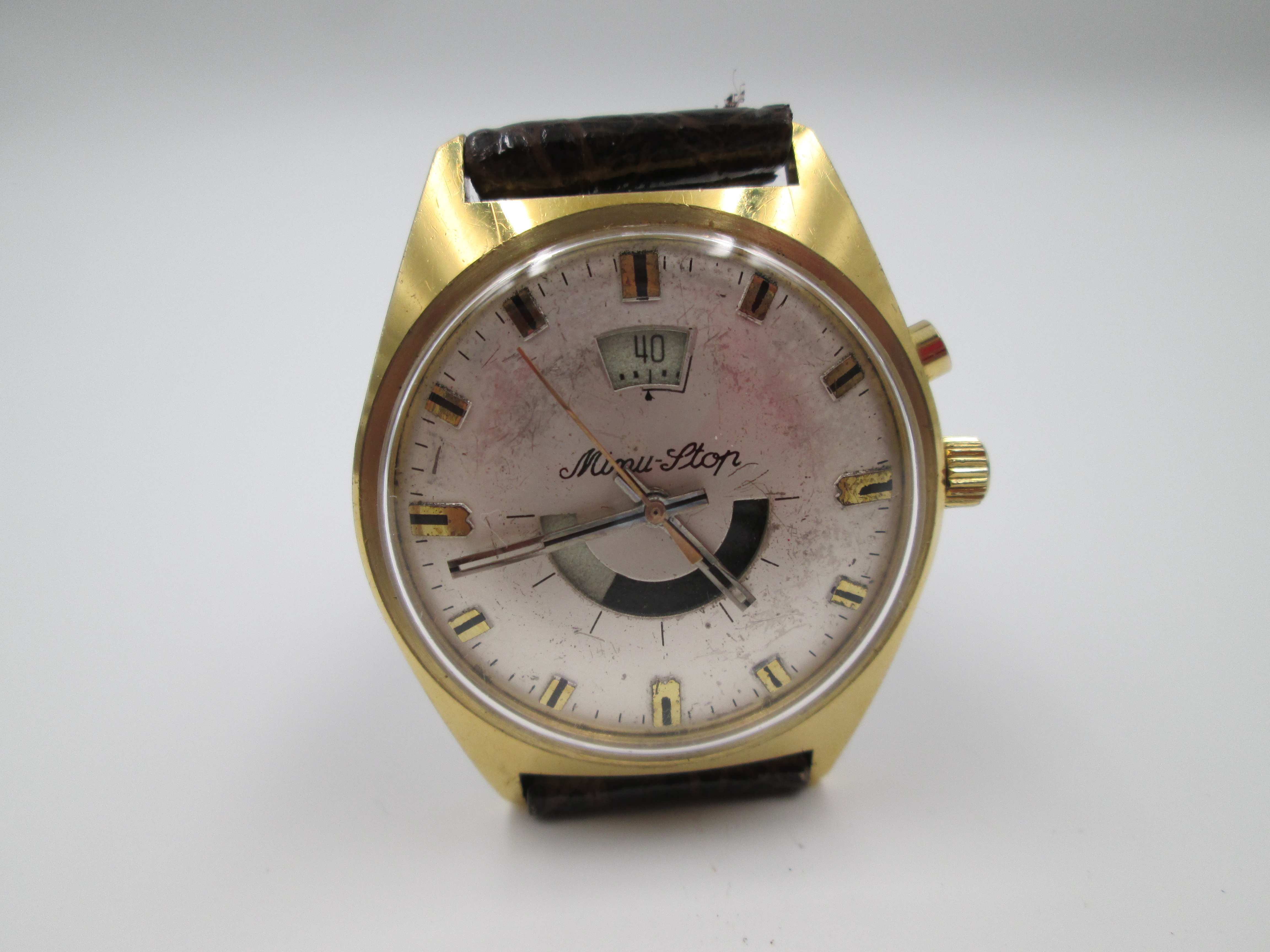 Raro reloj Minu Stop. Chapado oro y acero. Correa piel. Cuerda