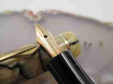 Se carga mediante mecanismo de pulsador / botón y equipa un plumín en oro de 14 quilates, de trazo grueso, respiradero circular y escritura fluida y agradable. Lleva grabado Warranted, un triángulo con la letra A en el interior y el contraste.