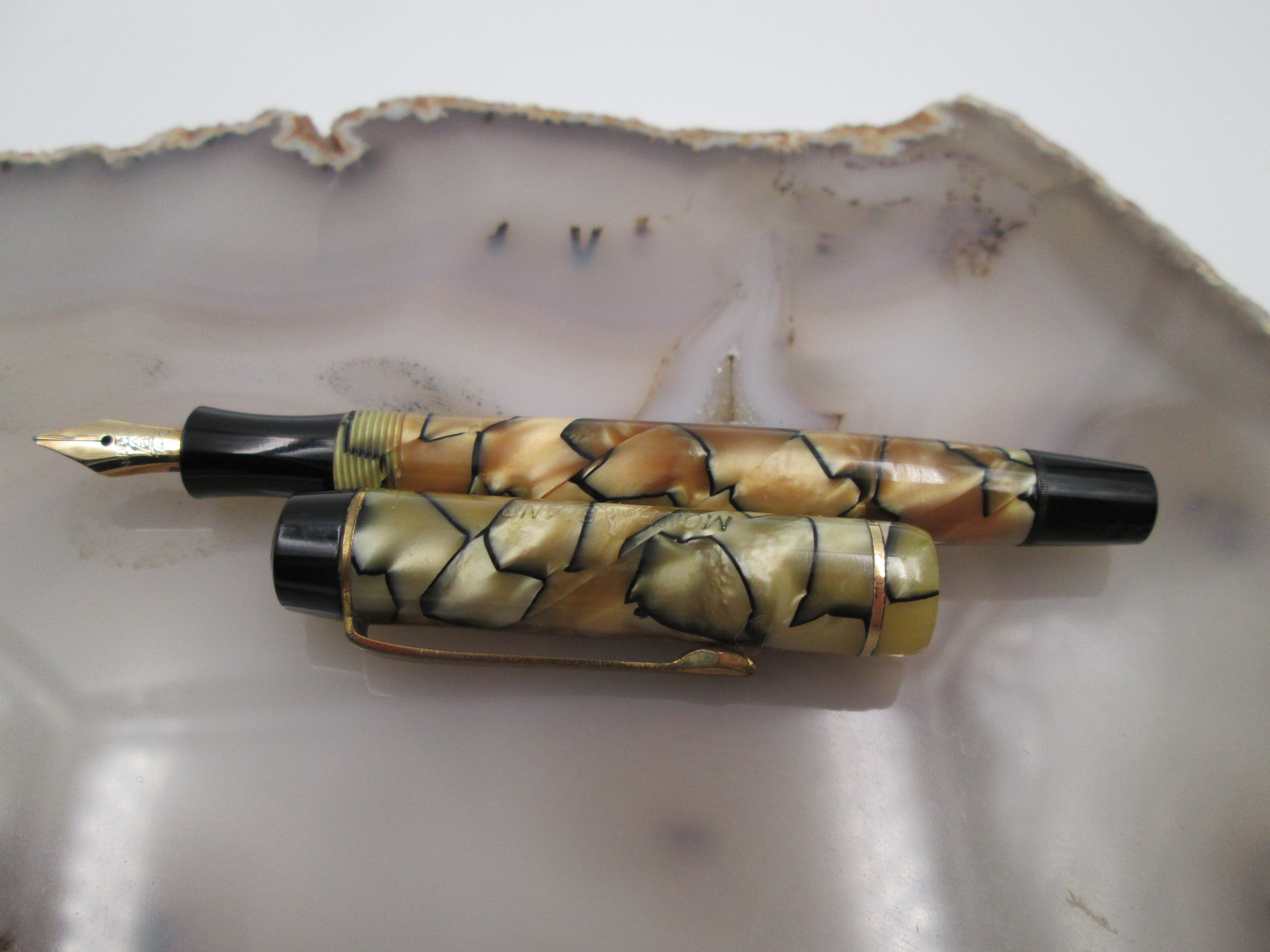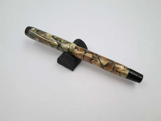 La pluma corresponde al modelo Simplo 322 y viene realizada en celuloide negro perla de acabado marmolizado, en tonalidades crema café y con los detalles chapados en oro.